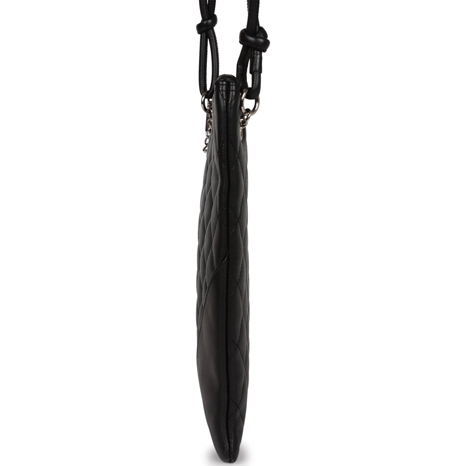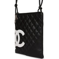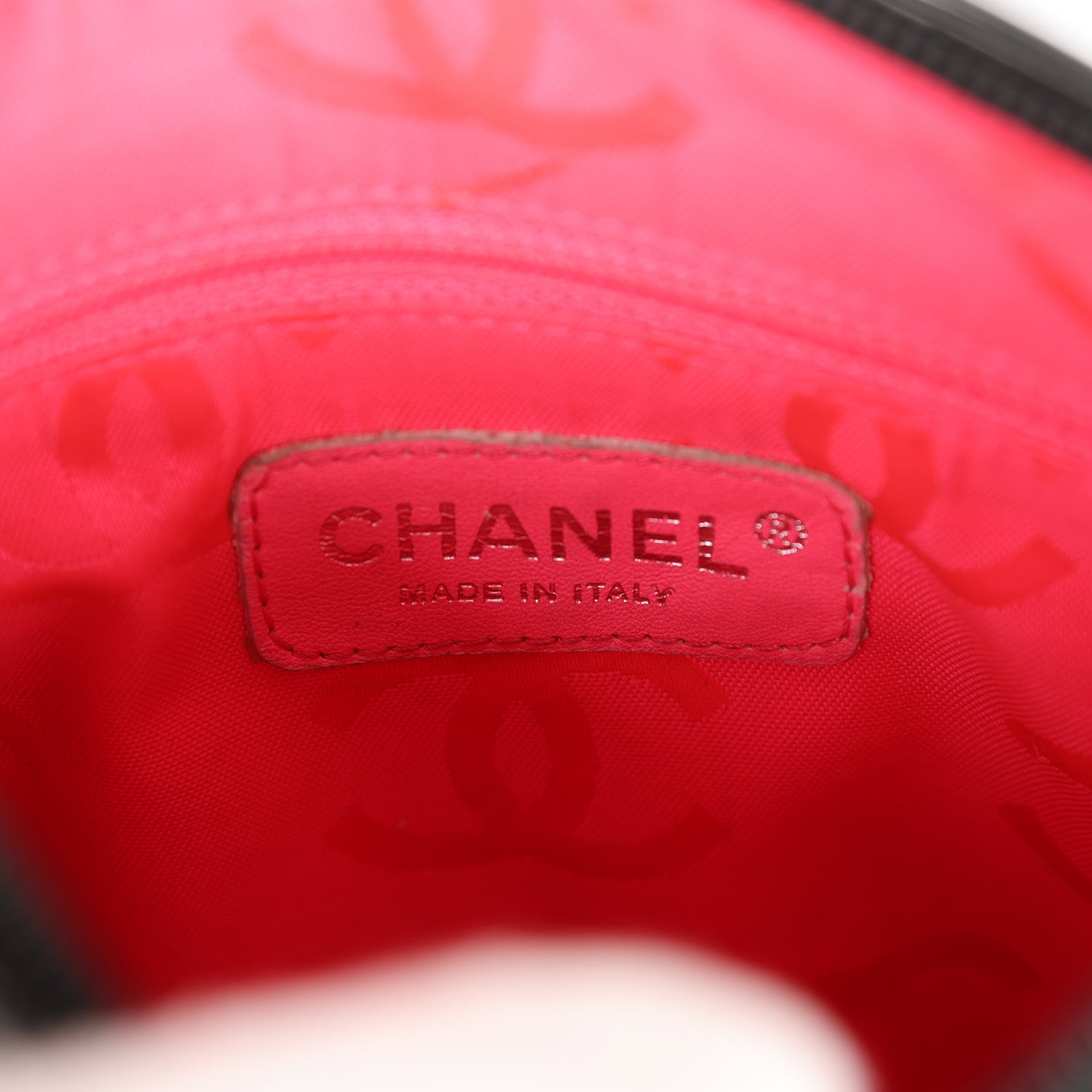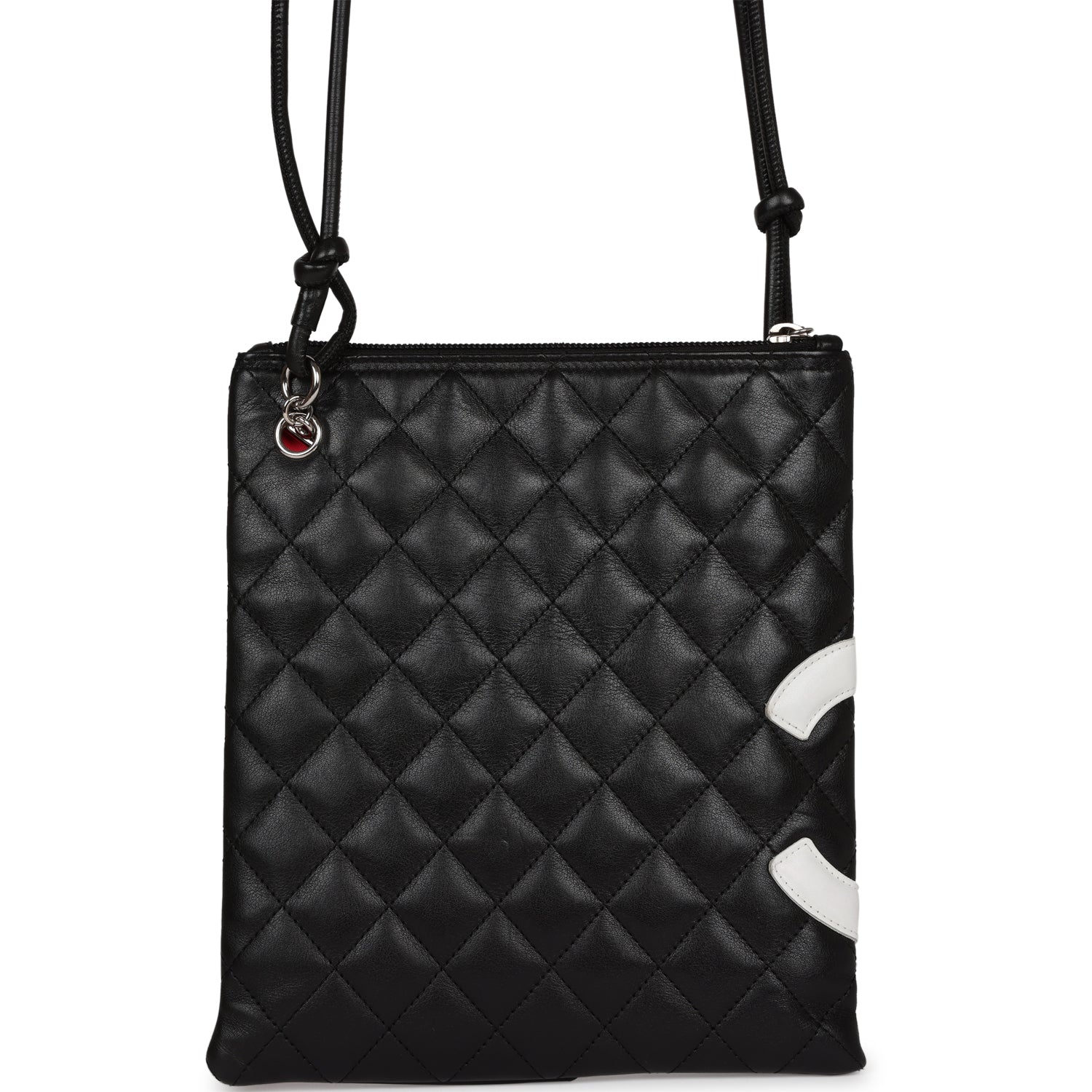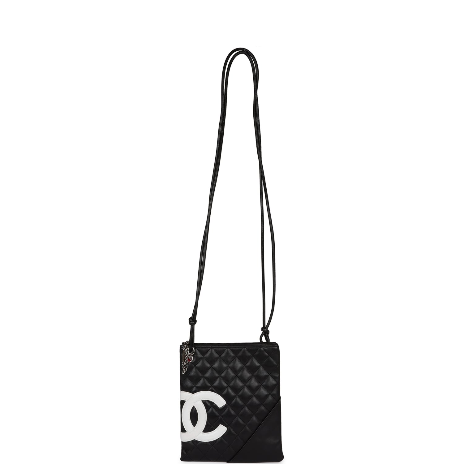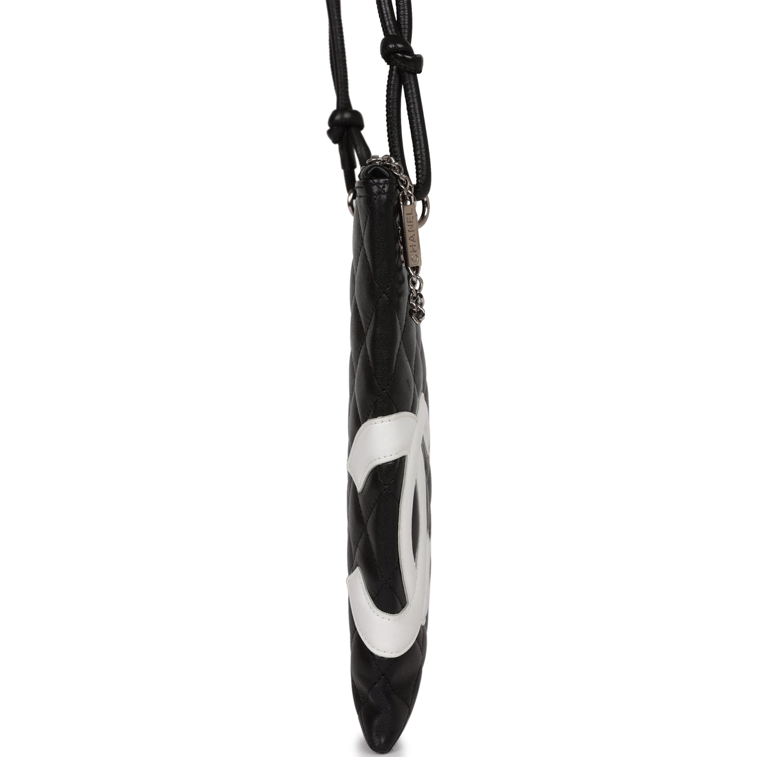 This Vintage Cambon Flat Messenger is in Black and White calfskin leather with silver hardware, featuring a top zipper closure, tonal stitching, 2 long black leather cord straps, and a mini pocket on the front.