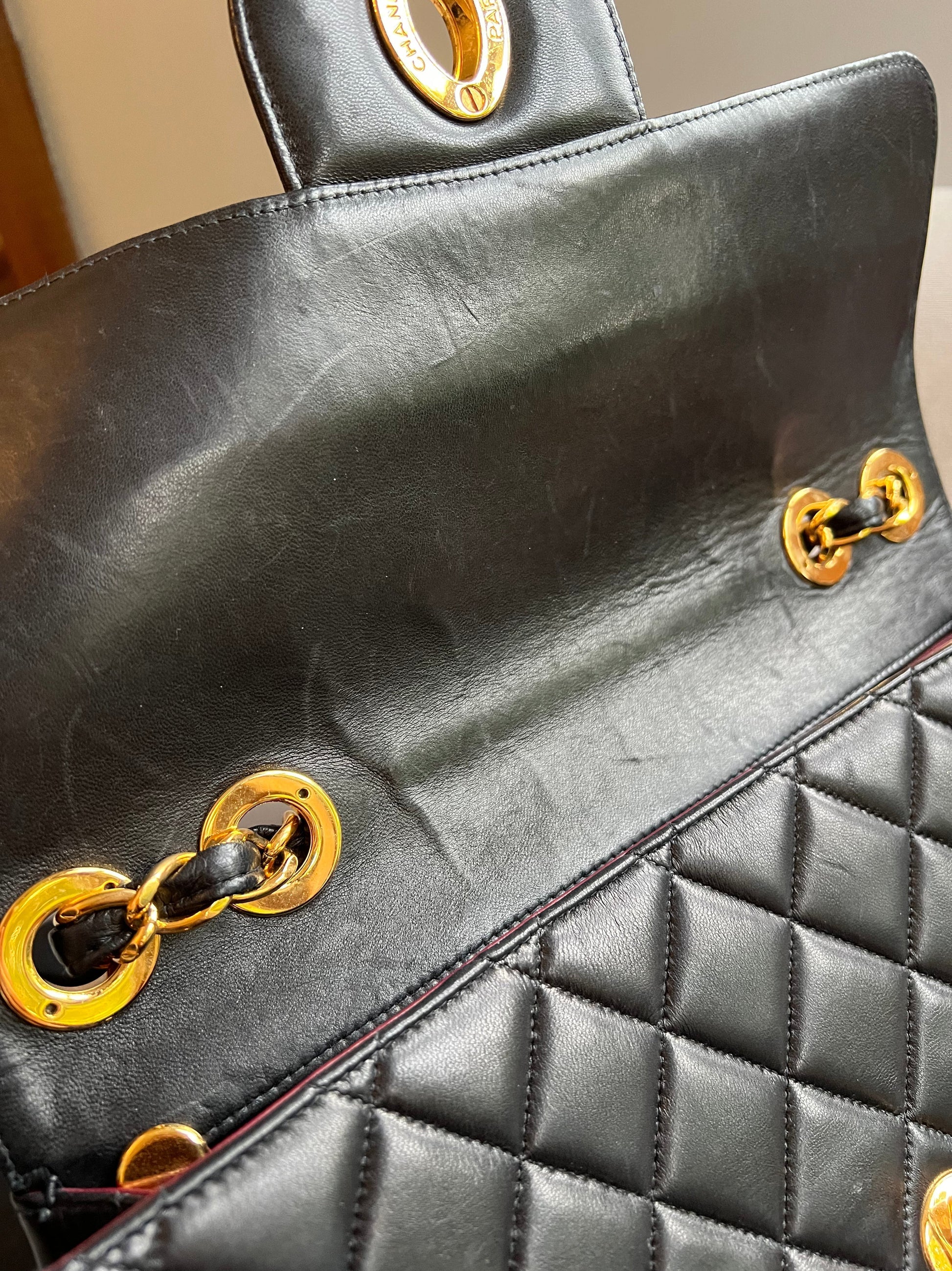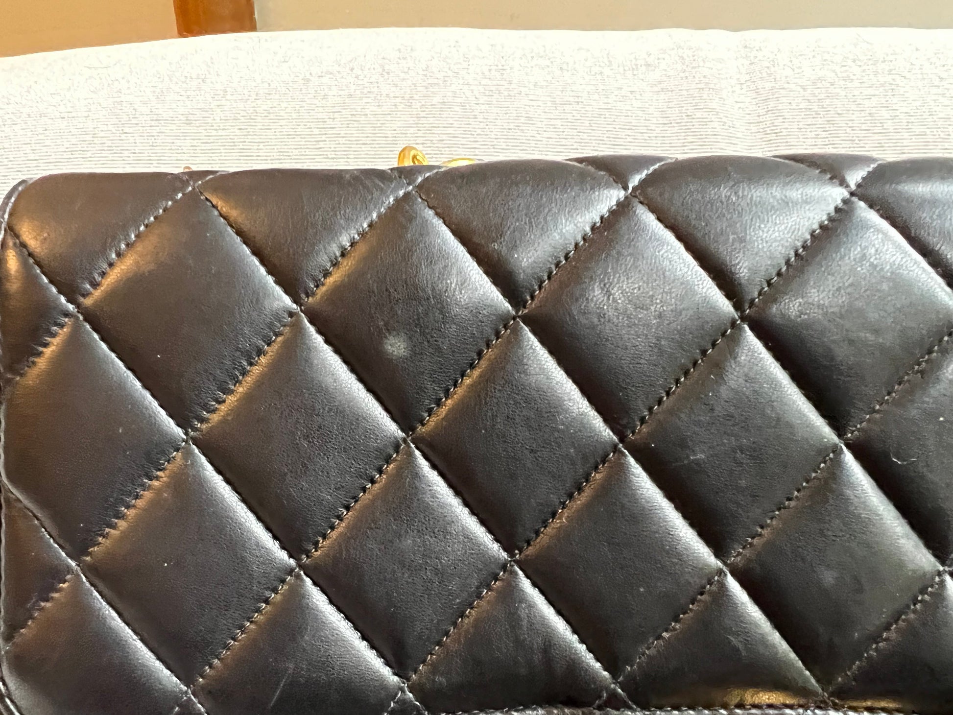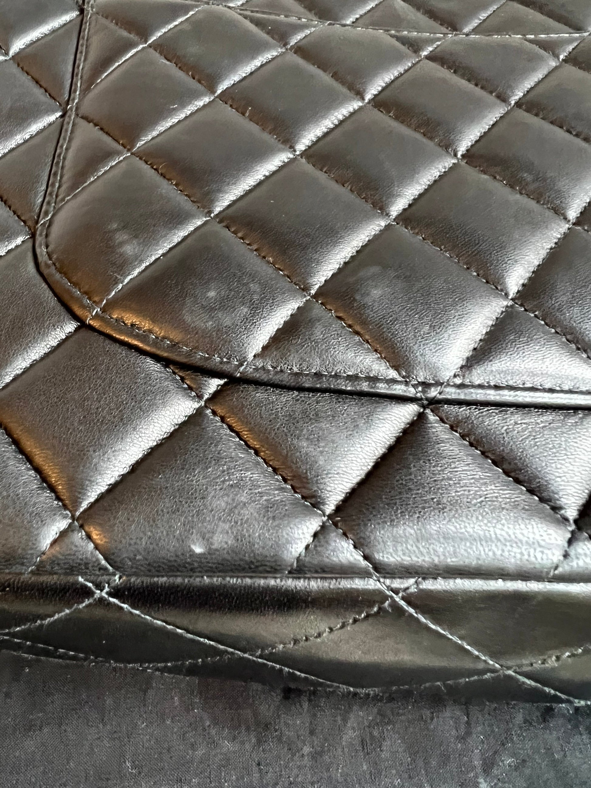 Chanel�Vintage Classic Quilted Single Flap Jumbo in Black Lambskin with 24k Gold Hardware. This vintage style is highly sought after an investment piece for those who love a more statement piece. �Featuring the iconic turnlock flap closure and sliding chain strap. Due to the length of the strap, can be over shoulder with strap doubled or potentially cross body with the strap lengthened (sits low on hip). Although the lambskin has had a reconditioning treatment, the leather is still in good condition and looks stunning. Perfect day to evening bag to compliment any outfit.�A great investment piece for those looking to own a classic Chanel with the original 24k gold plated hardware (which was discontinued around 2004).�
