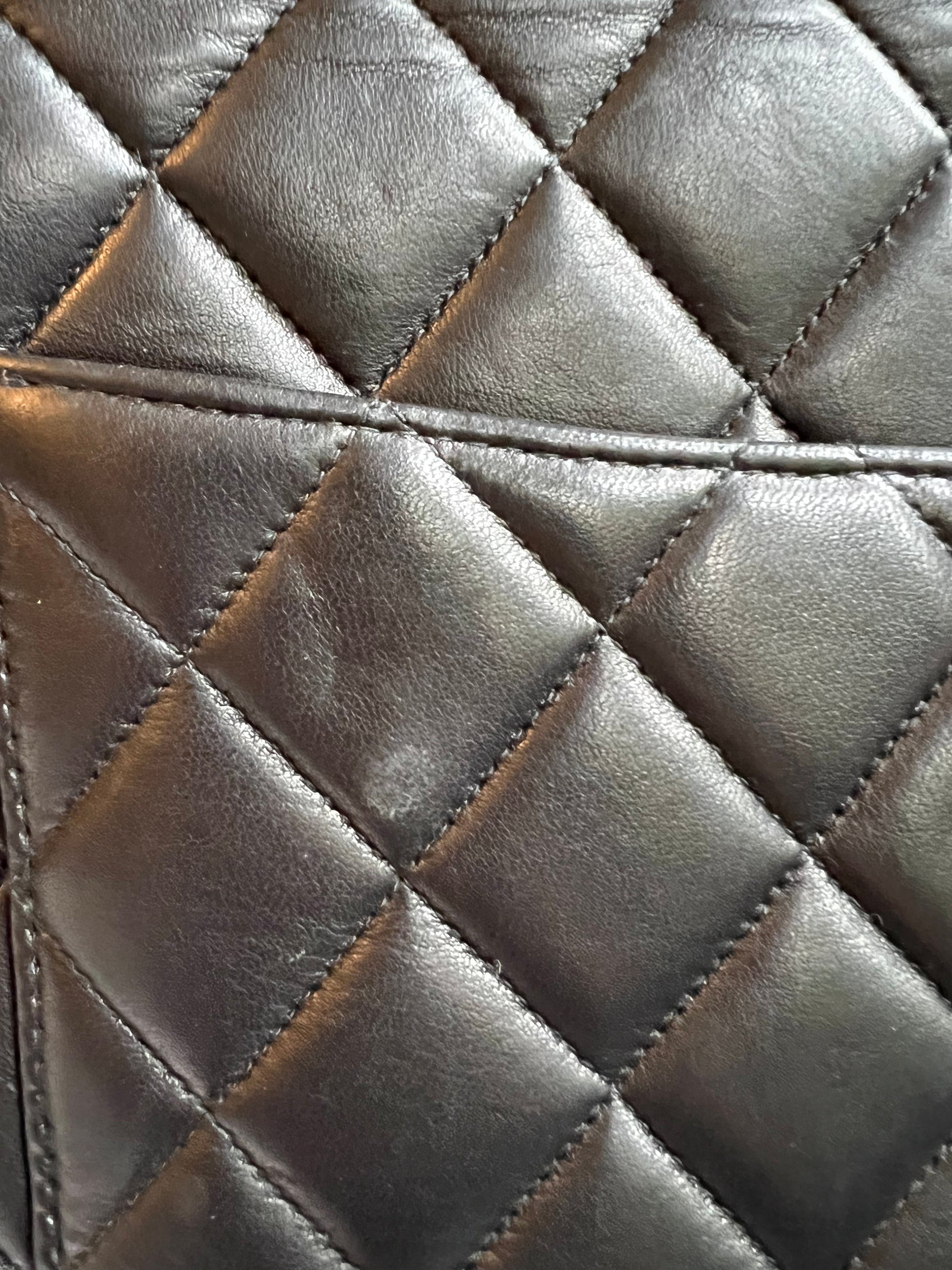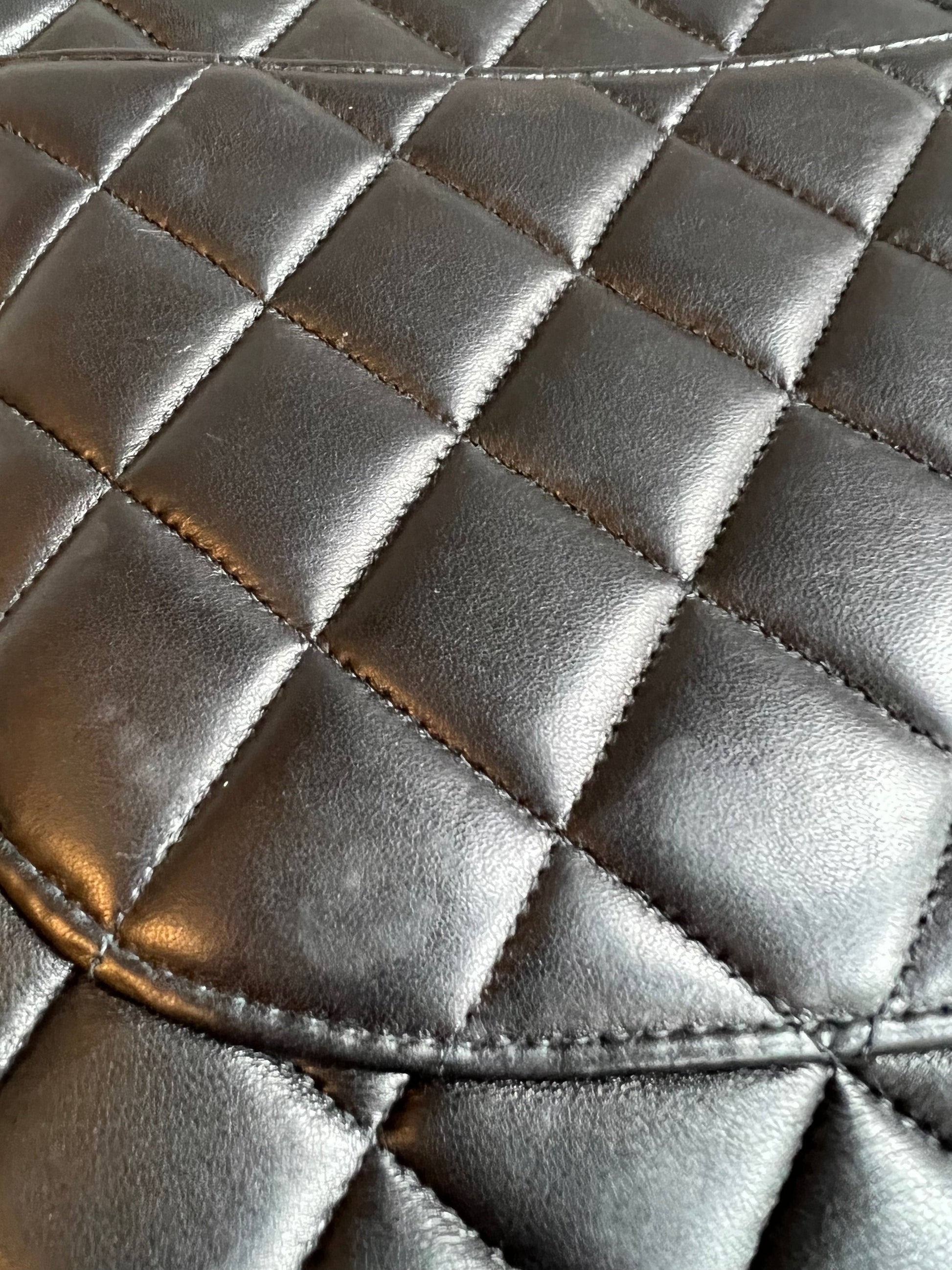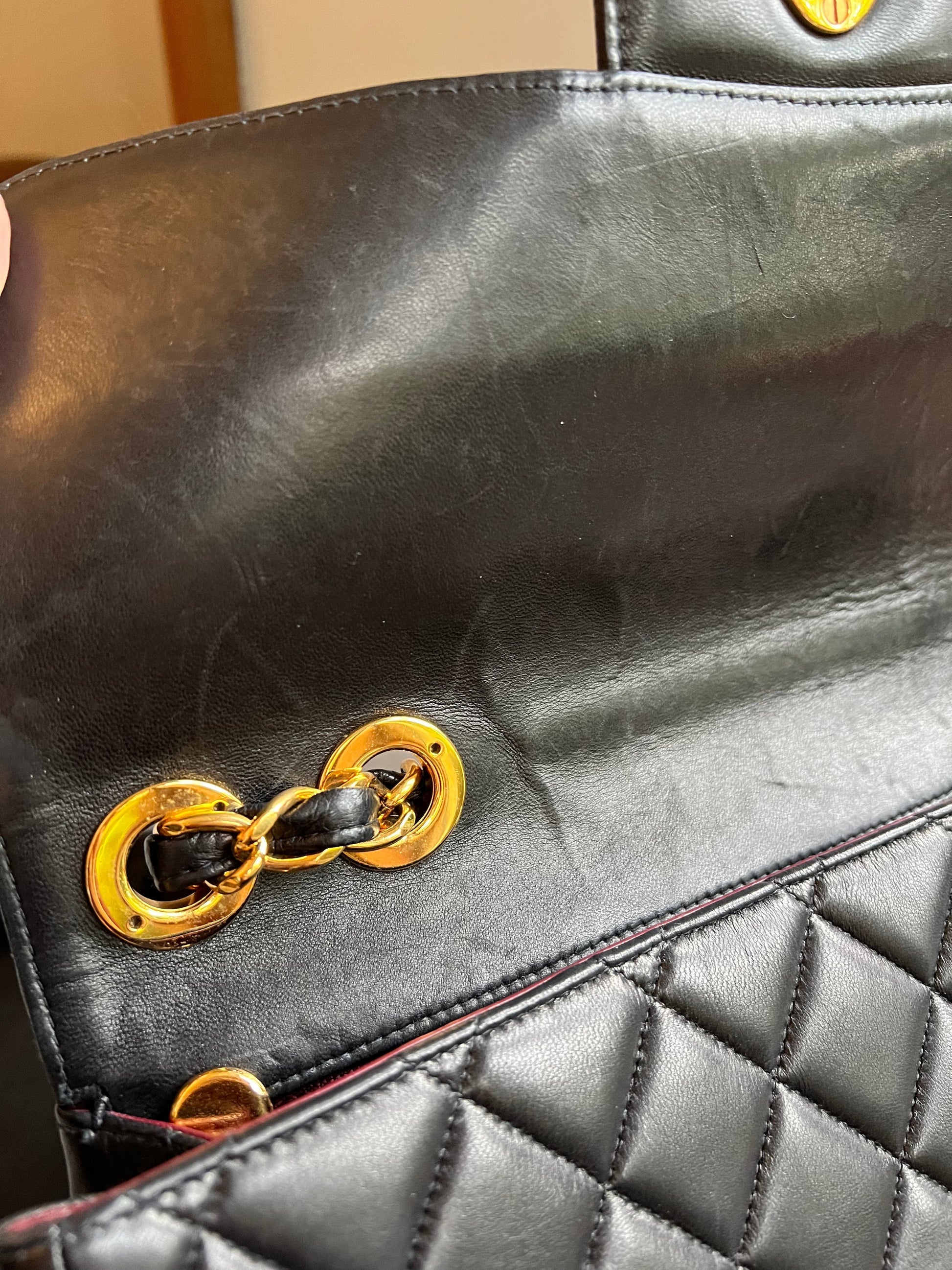 Chanel�Vintage Classic Quilted Single Flap Jumbo in Black Lambskin with 24k Gold Hardware. This vintage style is highly sought after an investment piece for those who love a more statement piece. �Featuring the iconic turnlock flap closure and sliding chain strap. Due to the length of the strap, can be over shoulder with strap doubled or potentially cross body with the strap lengthened (sits low on hip). Although the lambskin has had a reconditioning treatment, the leather is still in good condition and looks stunning. Perfect day to evening bag to compliment any outfit.�A great investment piece for those looking to own a classic Chanel with the original 24k gold plated hardware (which was discontinued around 2004).�