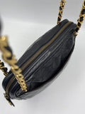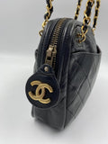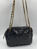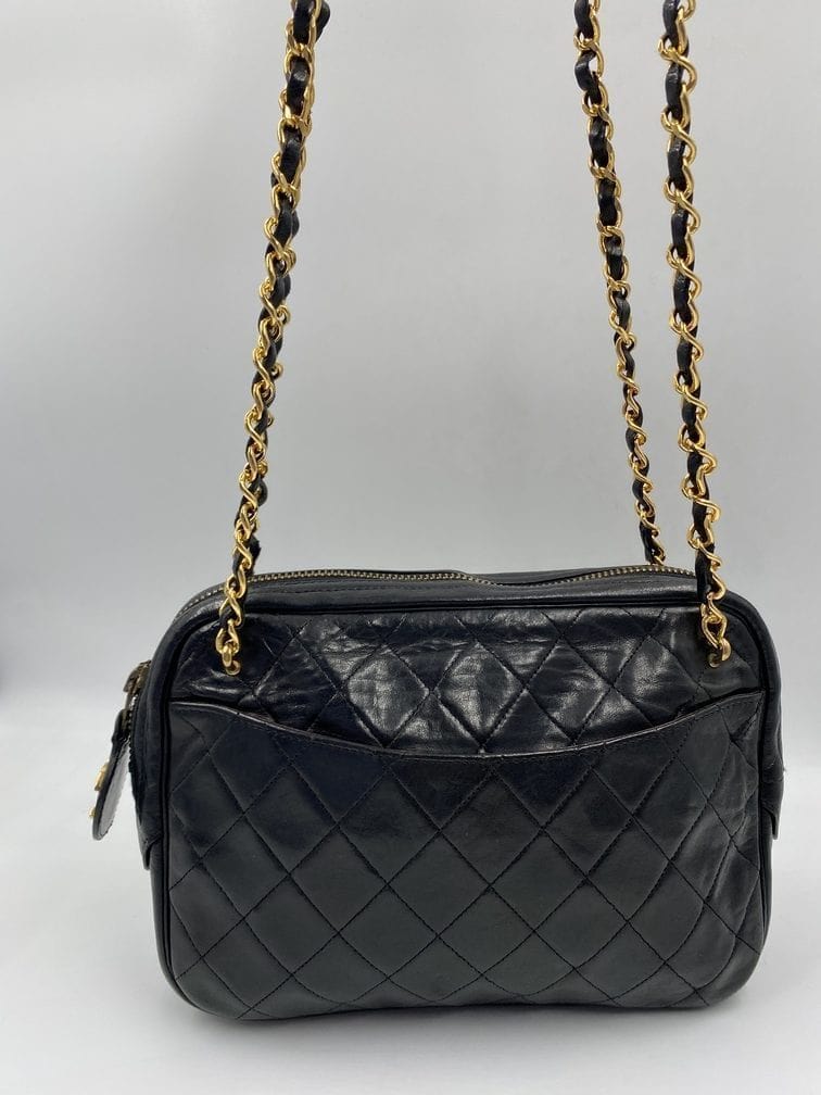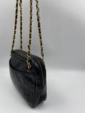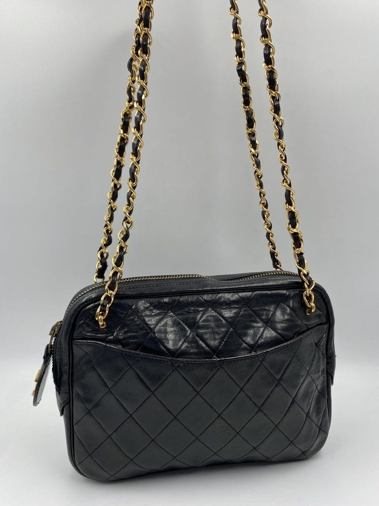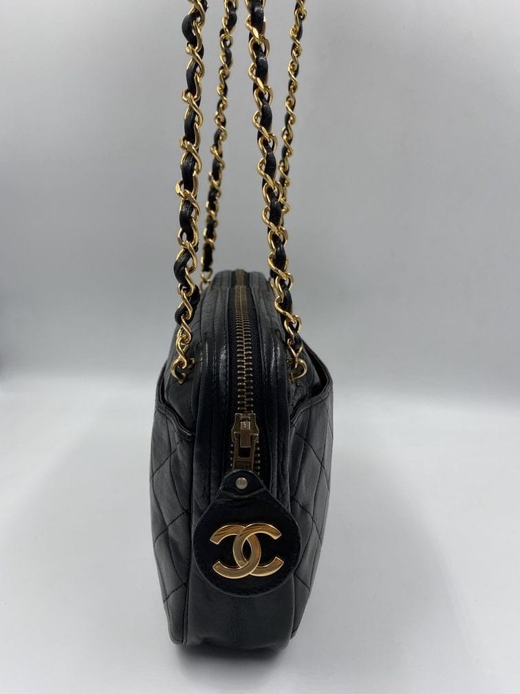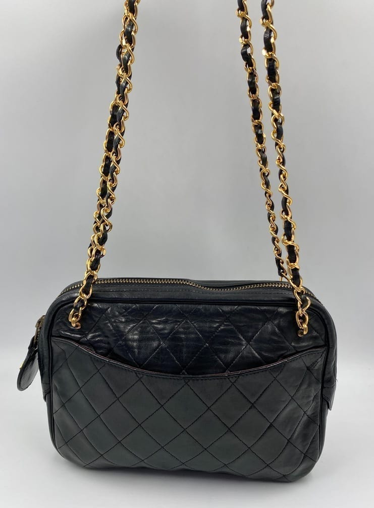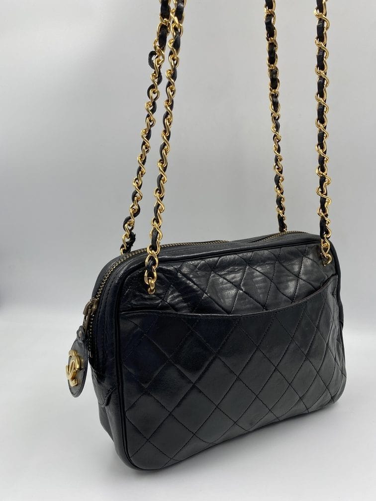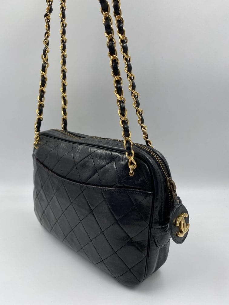 A beautiful vintage Chanel crossbody bag from the late 80's. The quilted black lambskin leather is silky soft with minor signs of wear. The gold hardware is also in good condition, this bag has an Ailee zip, a zip manufacturer commonly used by Chanel from the early 70's. There is also the statement CC charm on the zip pull. Inside the bag has the original lining and an interior zipped pocket for valuables. The inner zip also has a gold CC charm. The lining inside is in very good condition. The serial number begins with a 0 which indicates this bag was made between 1986-1988.