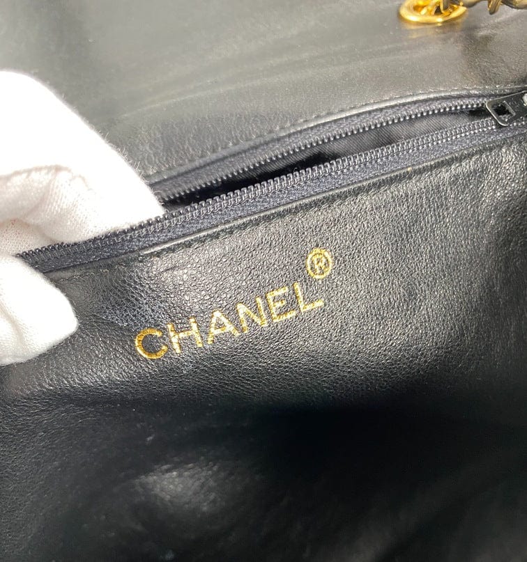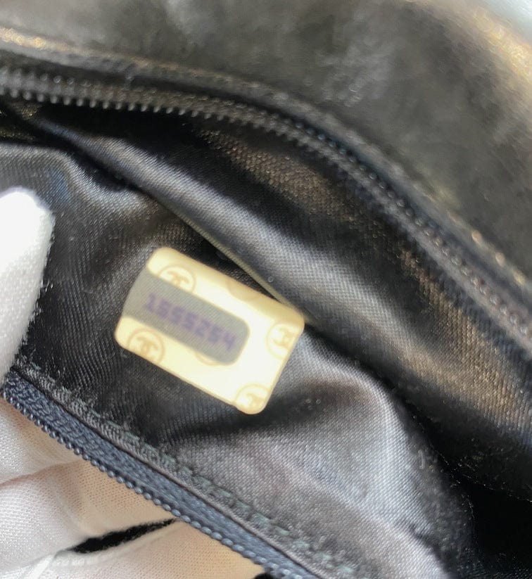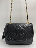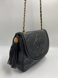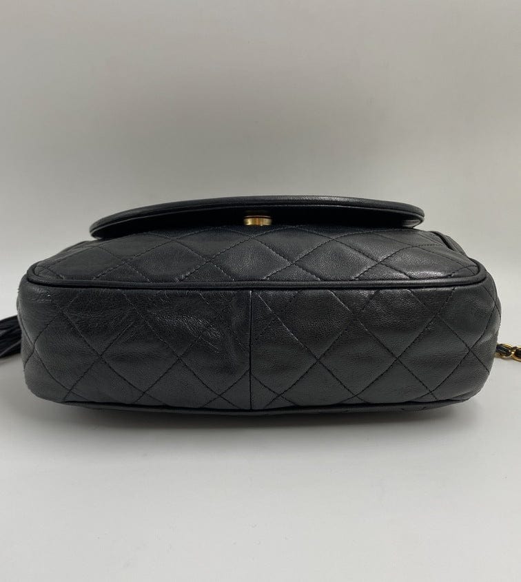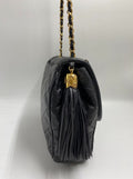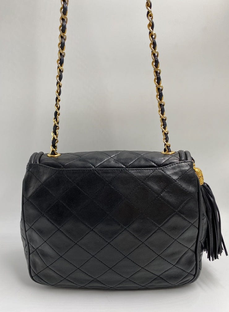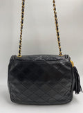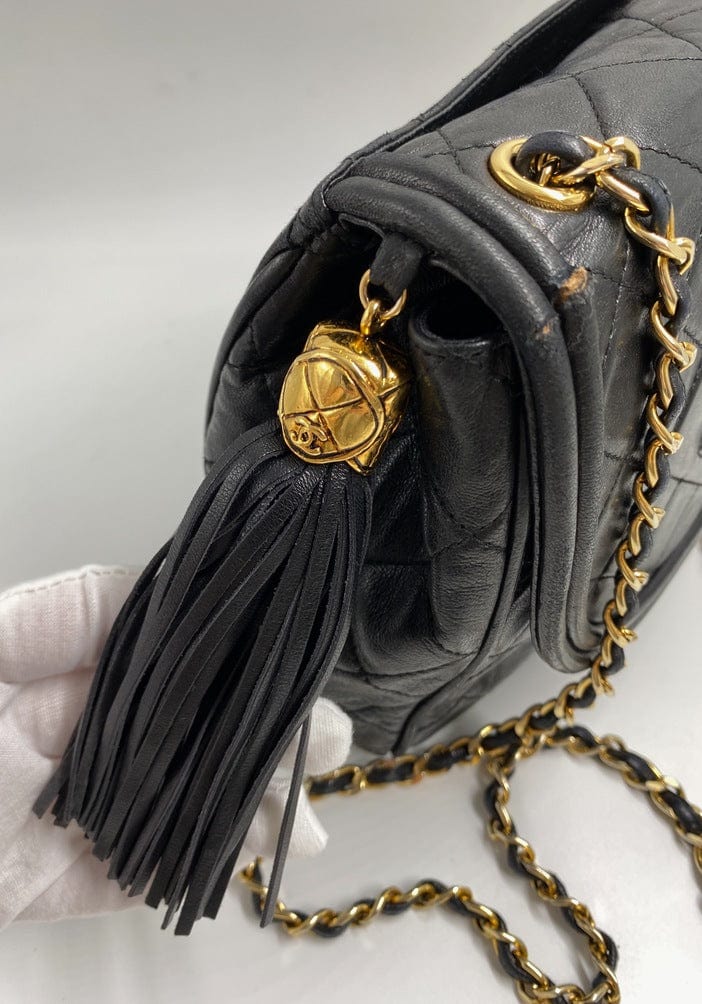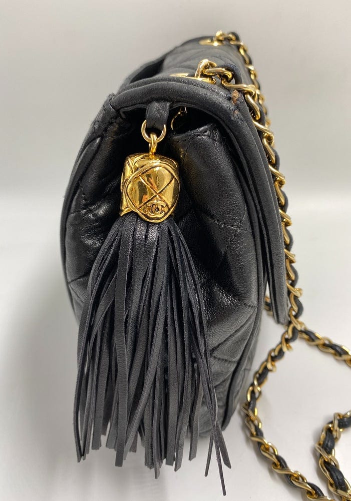 A superb vintage Chanel bag made between 1989 and 1991, with the ity sticker still intact. This bag is crafted from the classic black lambskin leather and features the stitched/debossed CC logo on the flap. On this bag there is also the sought after CC gold and leather tassel. This bag can be across the body or on the shoulder via the gold chain with black leather threaded through.