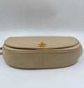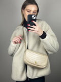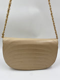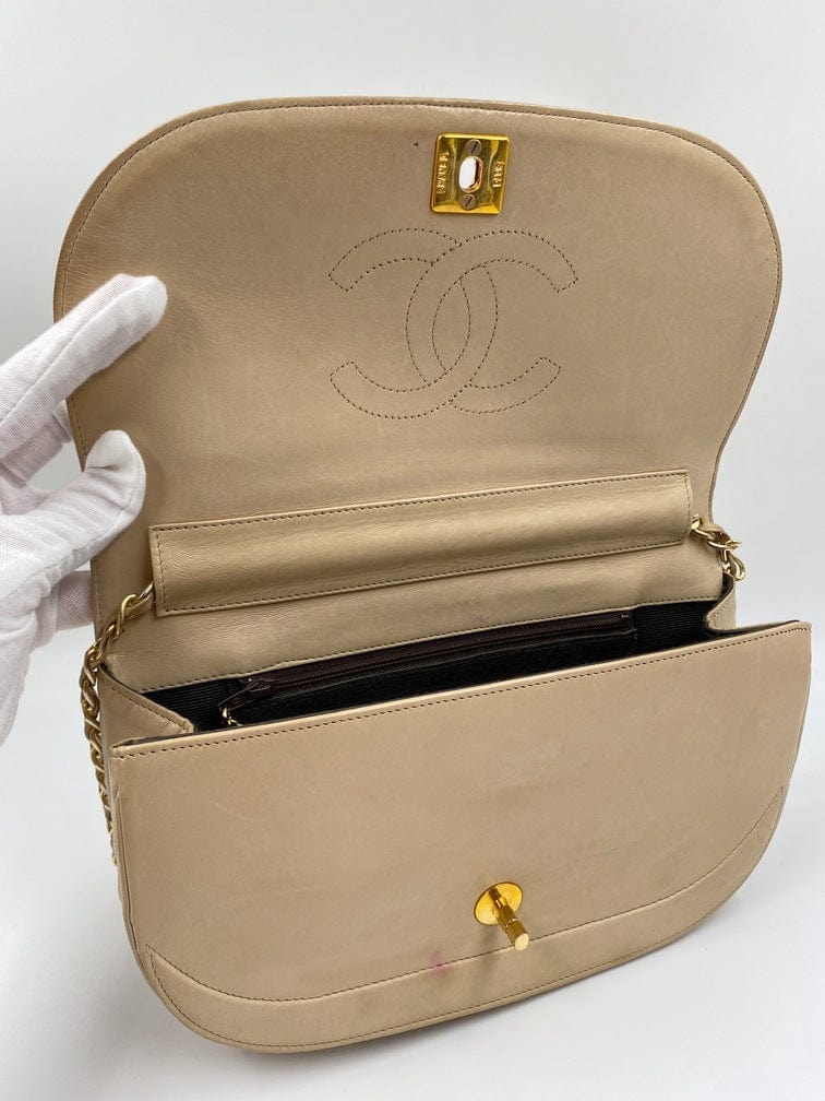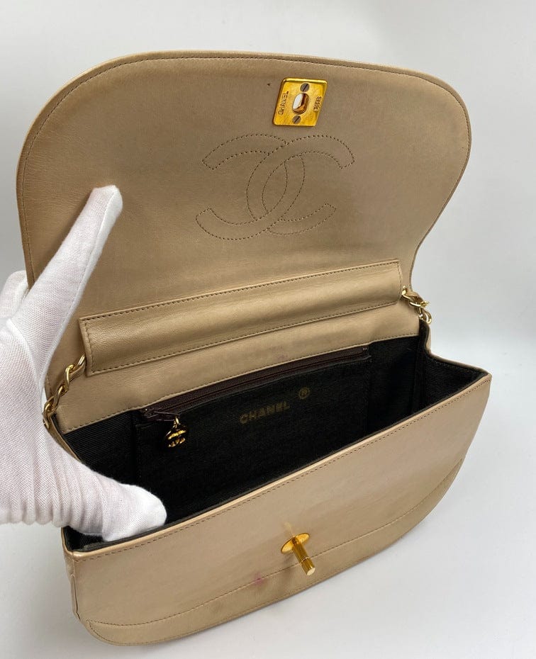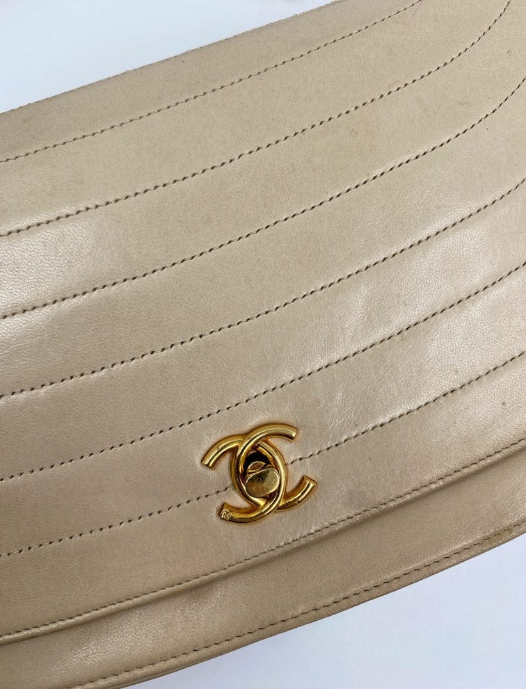 A beautiful vintage beige flap Chanel crossbody bag with the iconic CC turn lock. There is a hallmark on the turn lock showing us that the gold hardware is plated in 24k gold. Chanel stopped plating with real gold in late 2008. There are some lovely Chanel branding details on this bag, under the flap the CC is stitched under the flap. Inside the bag the gold CC charm is still intact on the inner zip.