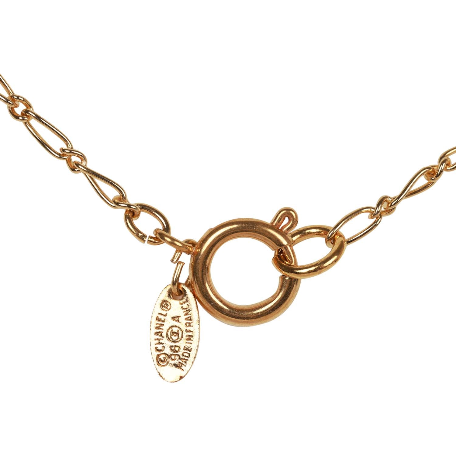 This 96A Chanel Vintage Gold Necklace features an interlocking CC logo pendant, an open chain link, and a spring ring closure.