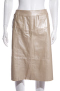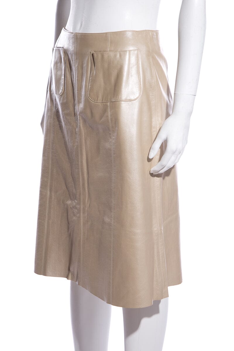Vintage Chanel 1999 Spring Gold Lambskin Leather Knee Length Skirt w/ concealed zipper at back and front pocket detail. This item is in good condition with imperfections to leather on bottom and tear to composition tag inside.