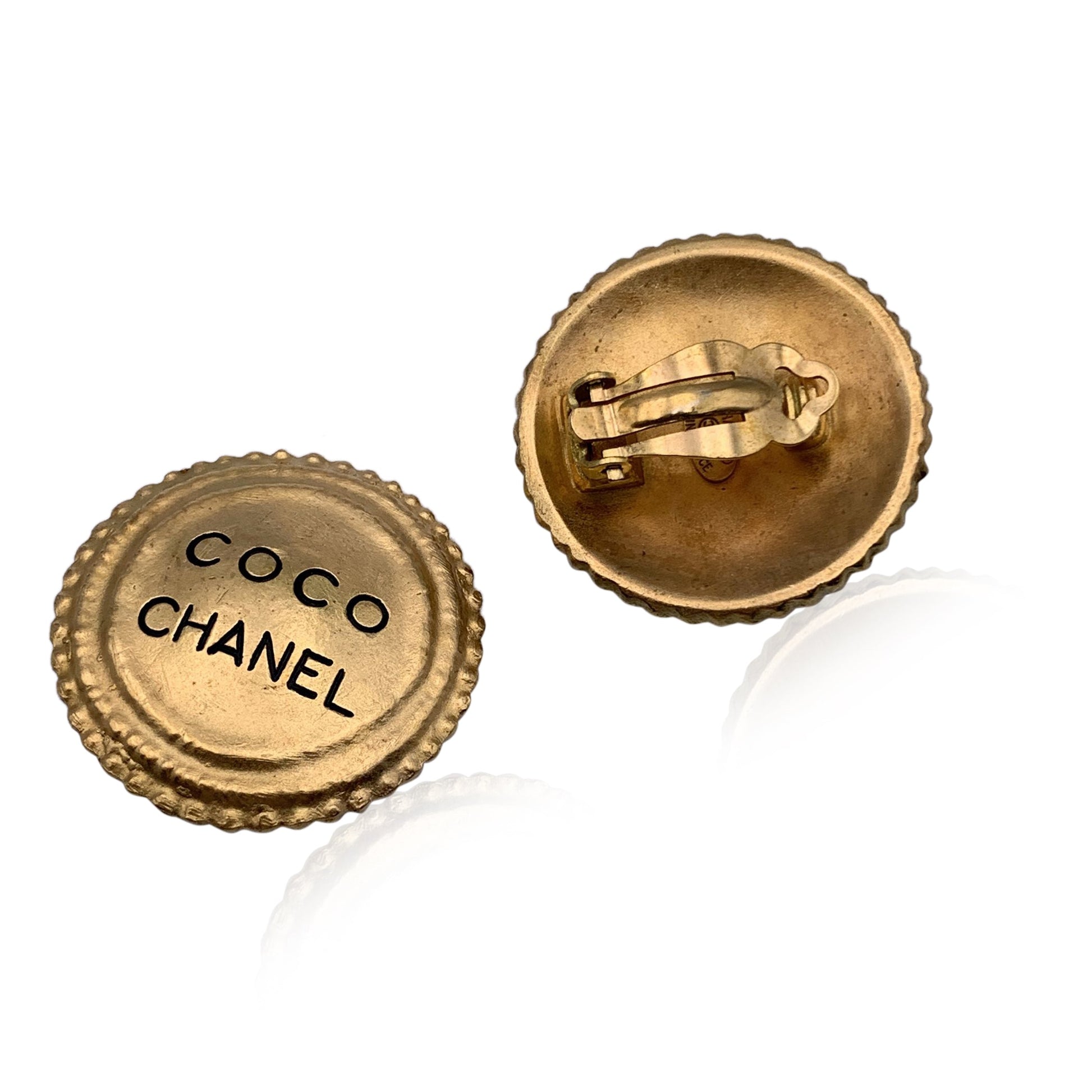 Gorgeous Vintage Chanel Round Gold Metal Earrings With Contrast Coco Chanel Writings.