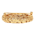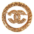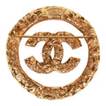 This vintage 93A brooch is in gold tone lava textured metal featuring the CC logo enclosed in a clear acrylic and gold tone circle.