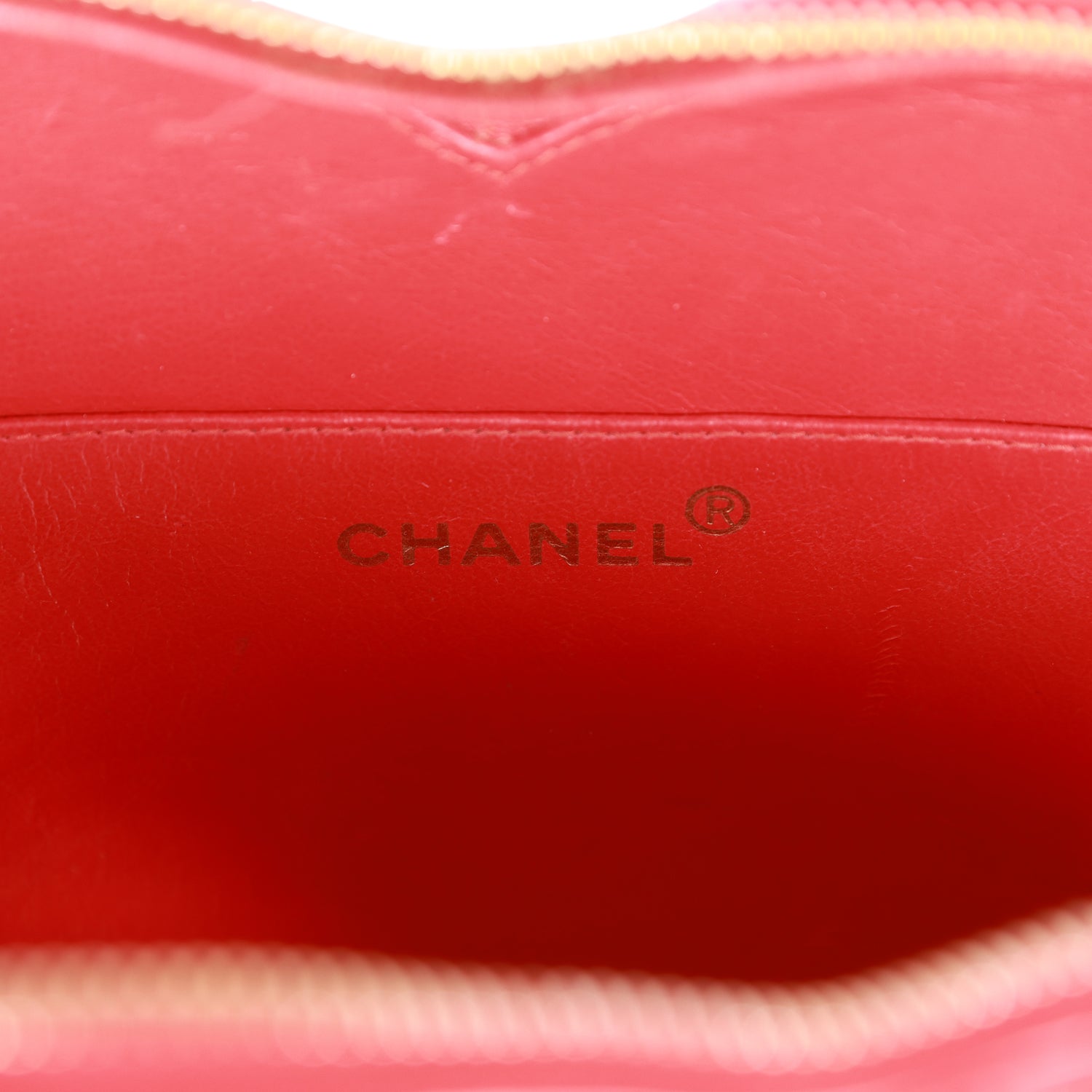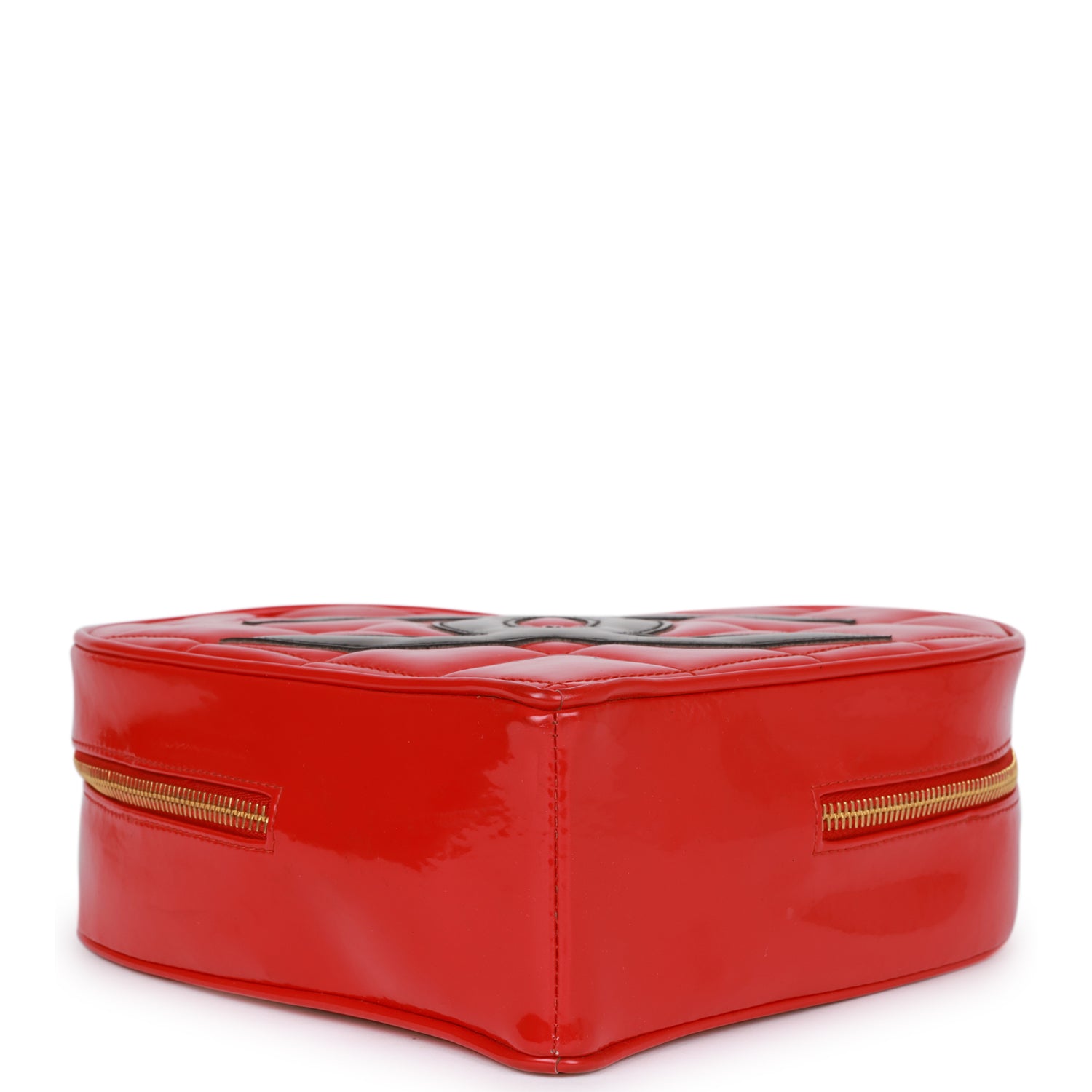 This Chanel vintage heart vanity case is in red quilted patent leather Bag with antique gold hardware, stitched CC Logo on front, zipper closure, and interwoven red patent leather and antique gold top handle