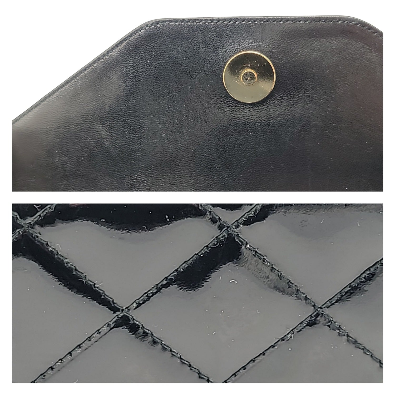From the 1989-1991 Collection by Karl Lagerfeld; Chanel Quilted Patent Timeless Camera Bag. This classic beauty is crafted of quilted luxurious diamond stitched black patent leather. Featuring an exterior flap pocket adorned with an interlocking CC logo, 24K plated gold-tone hardware, leather threaded chain link shoulder strap, tassel accent zipper pull opens to a matte black leather interior with a zipper pocket.