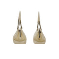 Overall Condition: Very Good condition, slight creasing, shape relaxed at base corners. Surface scratches at hardware, minor cracking to glaze on straps.