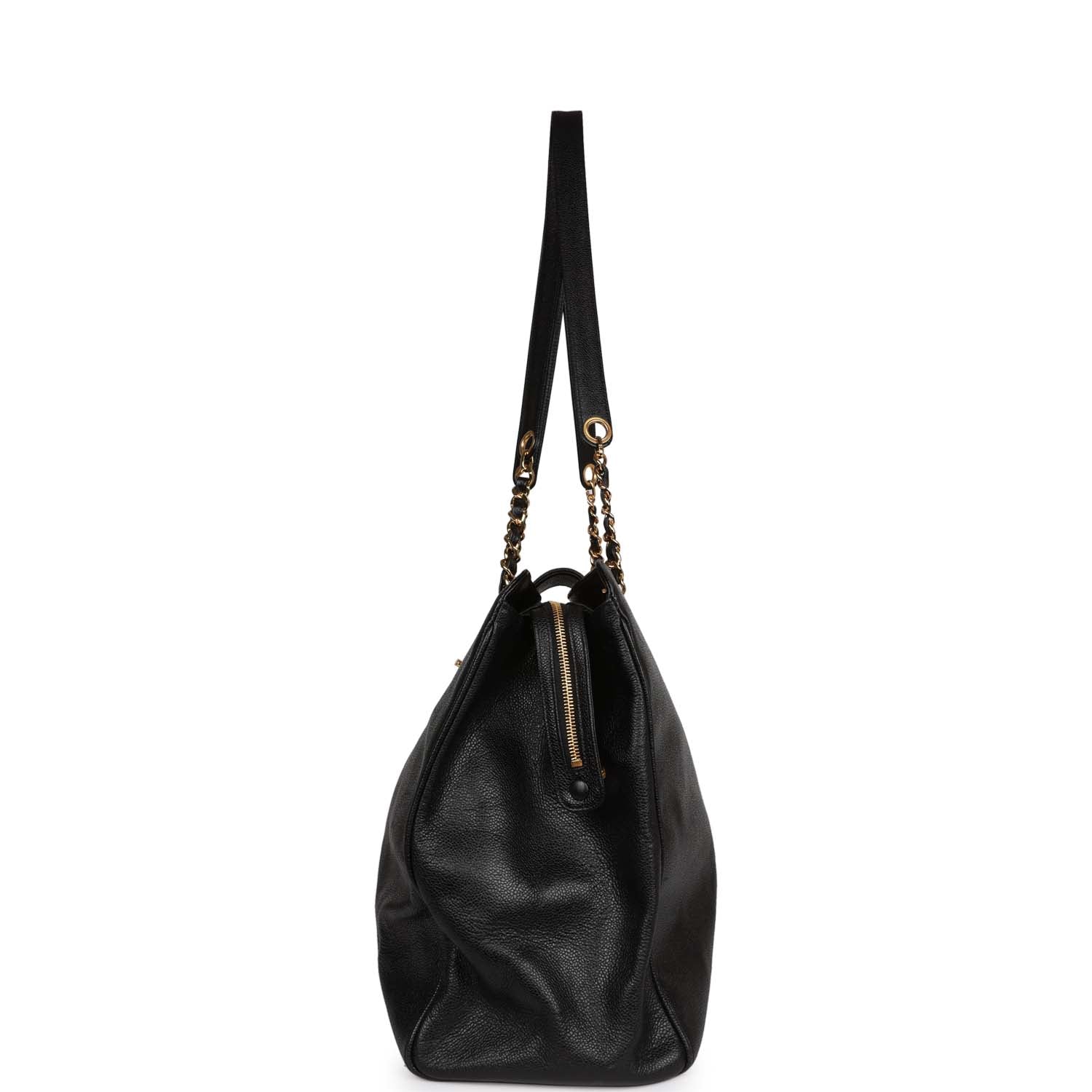 This Vintage Supermodel Tote is in Black Caviar with Gold Hardware, CC tab turnlock closure, large zippered compartment with two open pockets on each side, and interwoven chainlink leather handles.