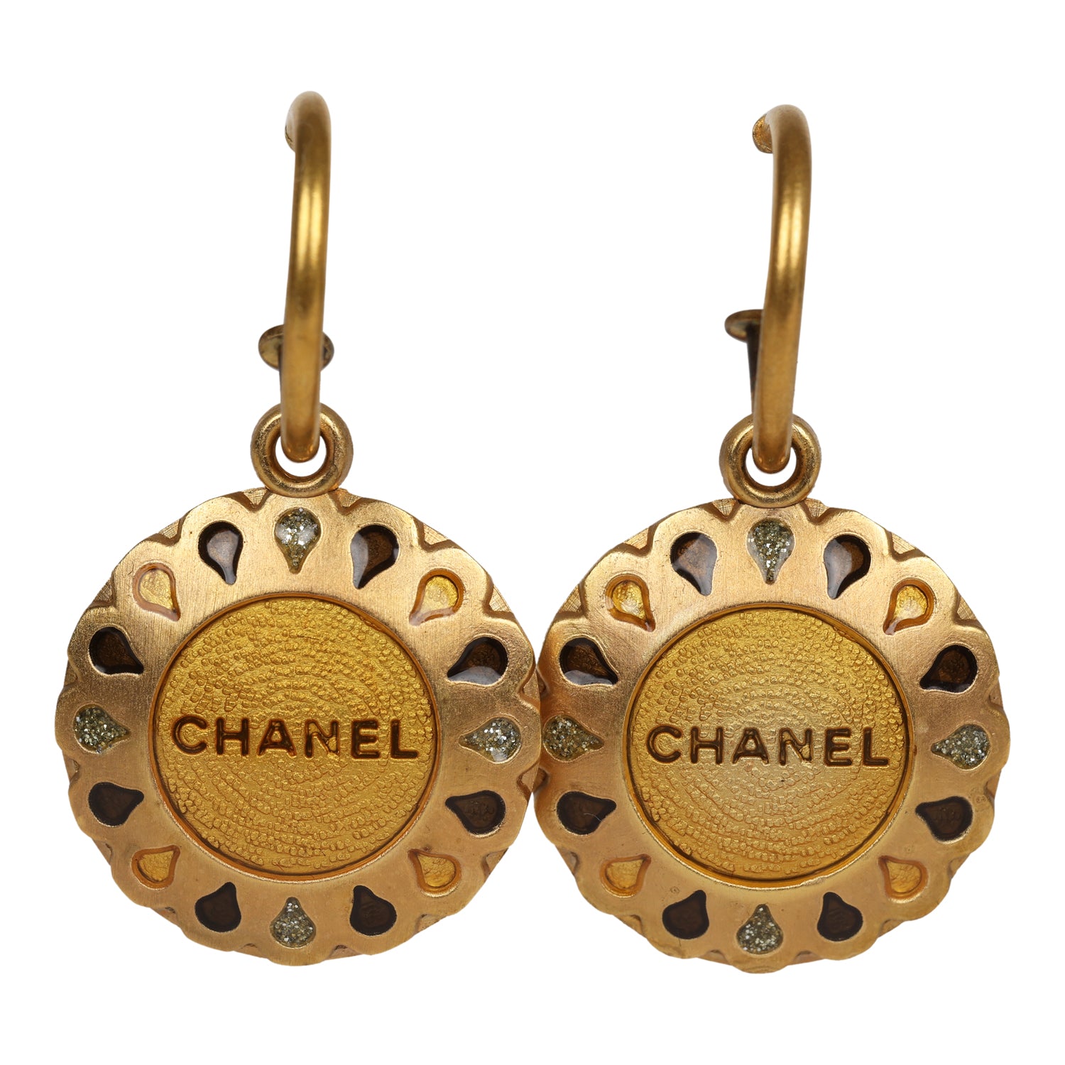 These Vintage Chanel Swing Logo Earrings are in Gold Metal with scalloped edges and enamel.