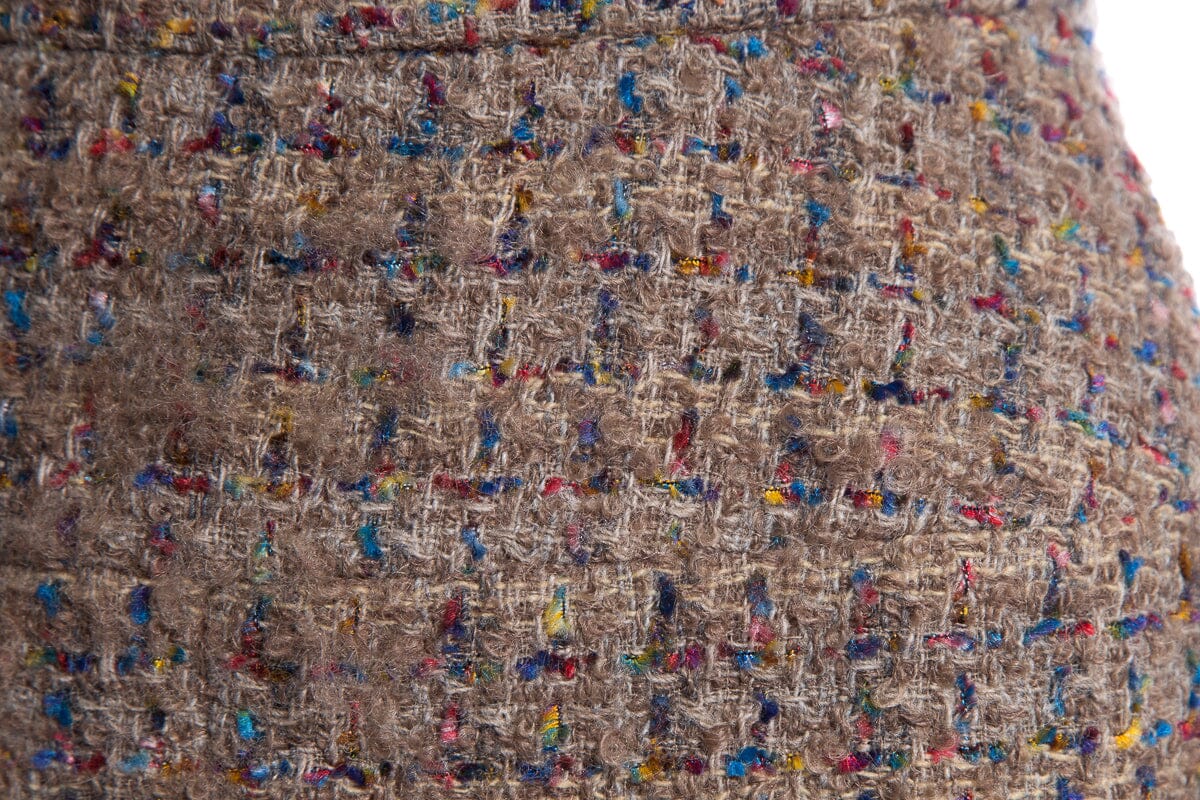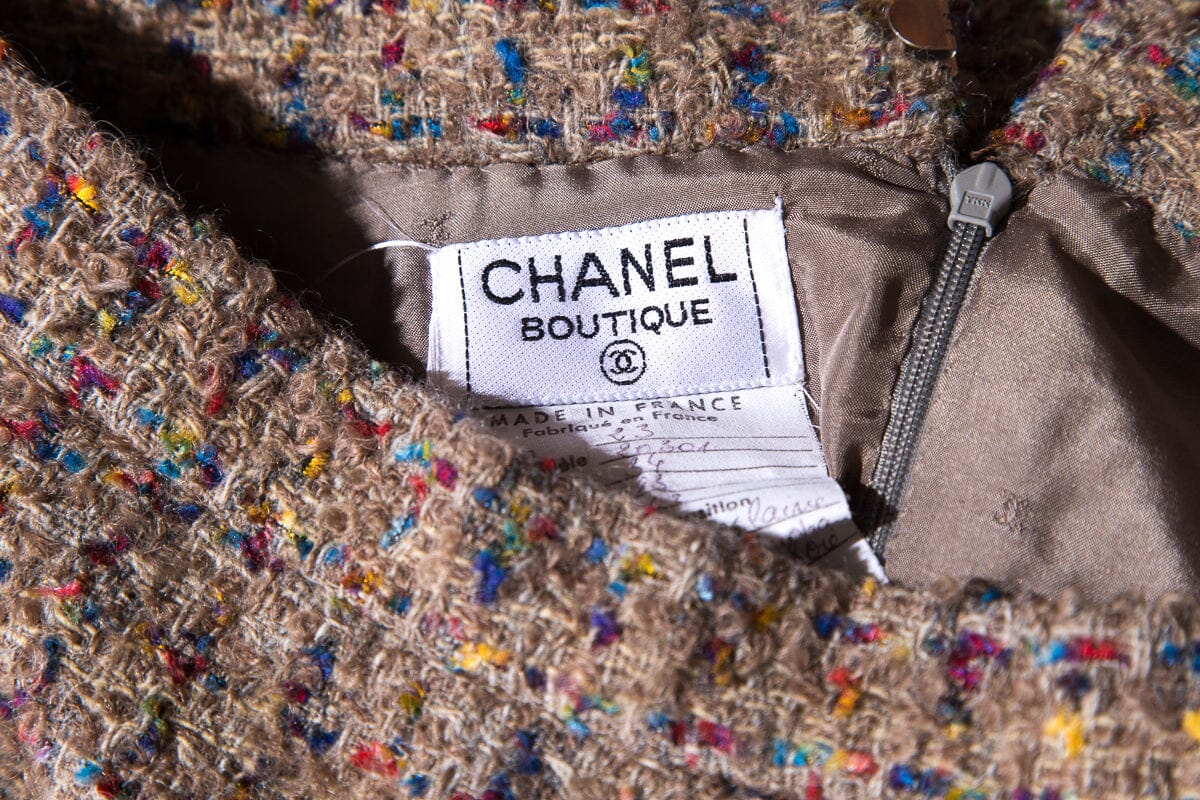 Chanel Vintage 1993 Tan & Multi Tweed Skirt with concealed zipper and clasp and at back. This item is in good condition but has slight pilling to fabric.