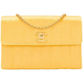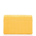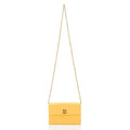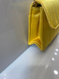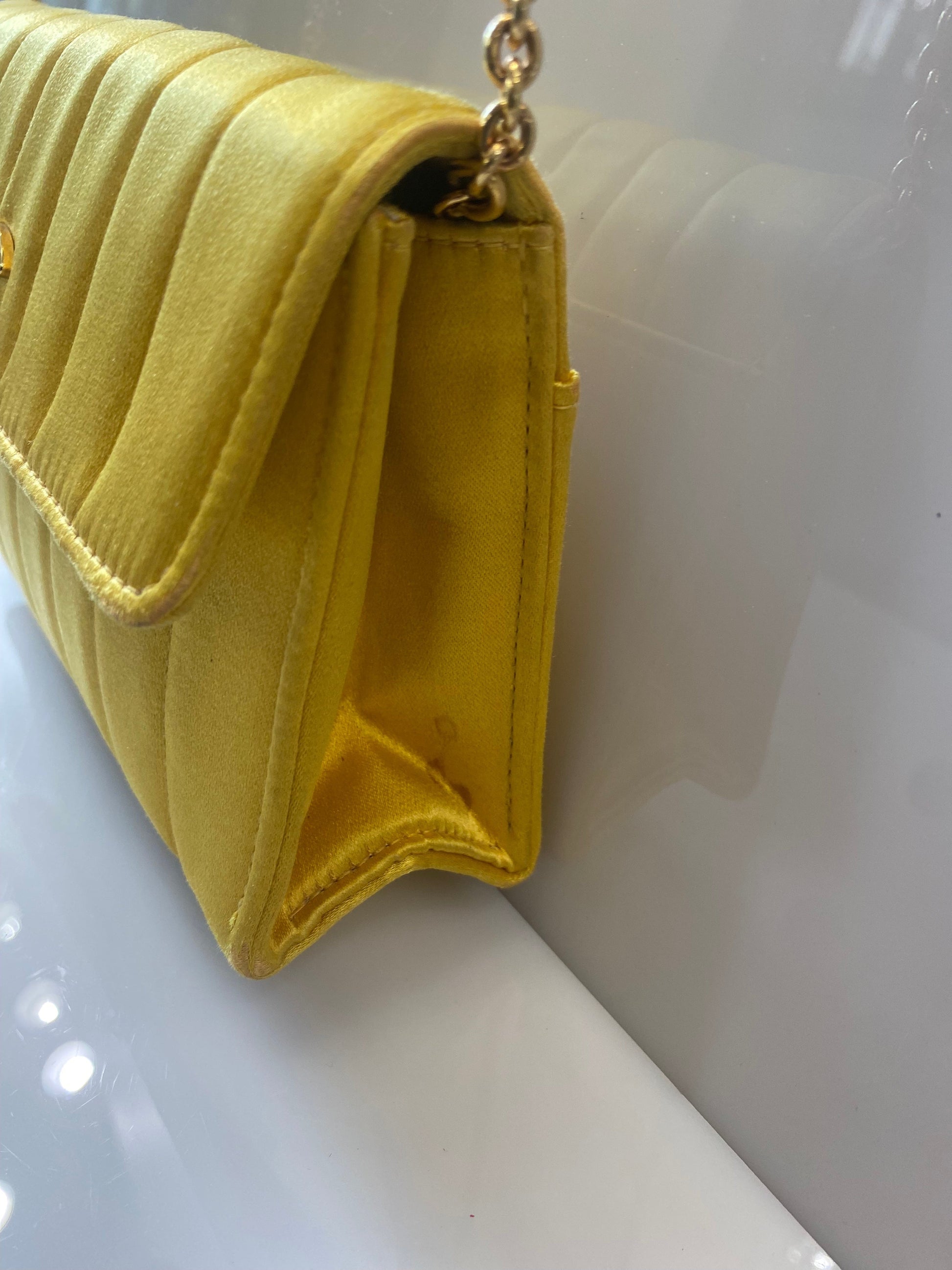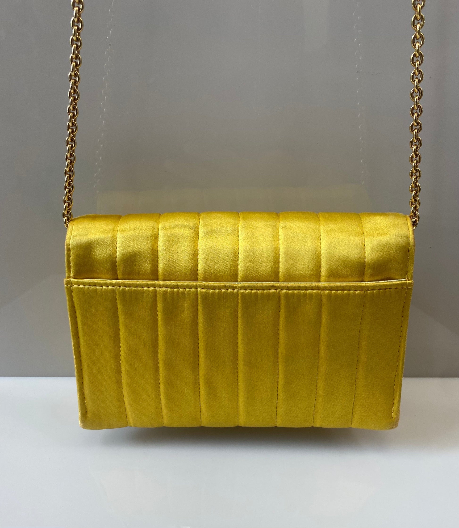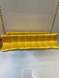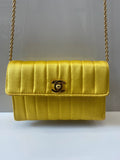 This vintage 90s gem is made from Yellow silk satin and features gold plated hardware. The front CC turnlock opens to an interior fully lined in metallic lambskin leather. It has a versatile chain strap that allows you to carry it on the shoulder, crossbody or can be completely removed to use this mini bag as an hand clutch.
