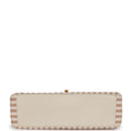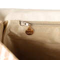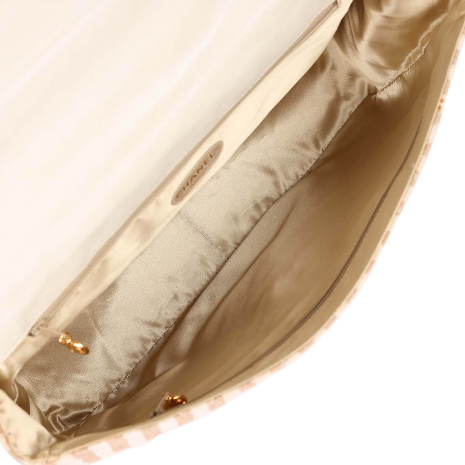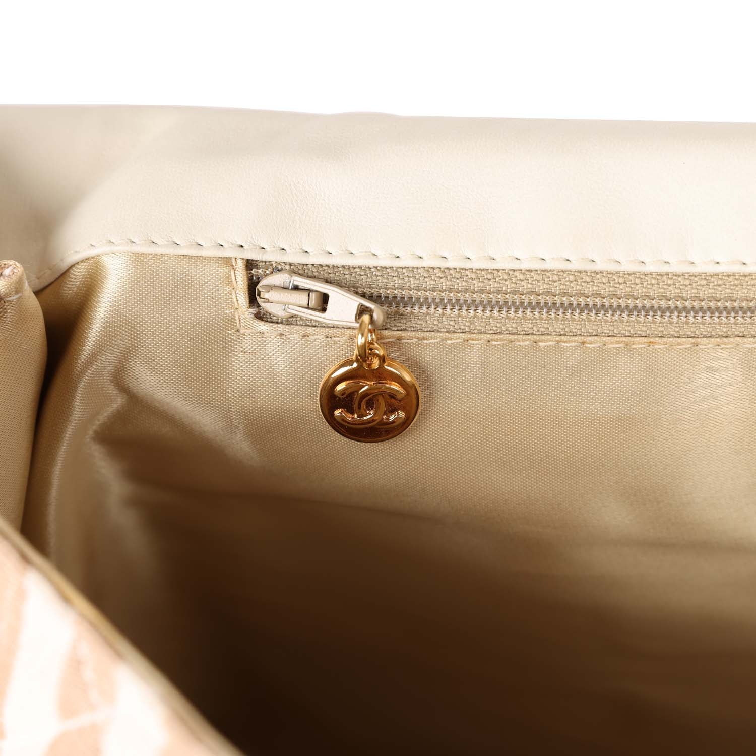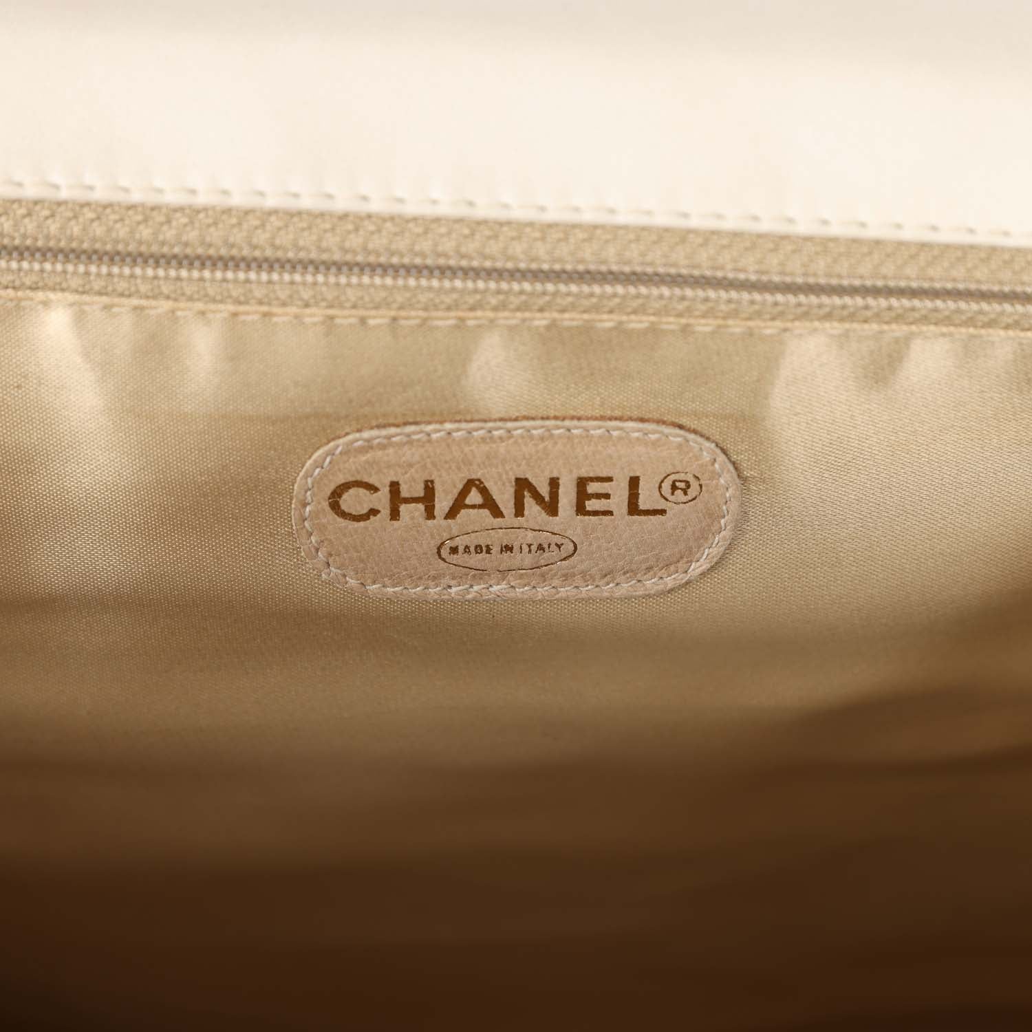 The interior is lined in beige fabric and white leather and includes one zip pocket on the rear wall with a CC logo pull.