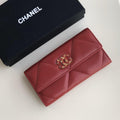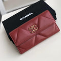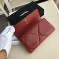We this is an CHANEL Lambskin Quilted Chanel 19 Flap Wallet Black or This stylish wallet is crafted of luxurious quilted lambskin in Red with an aged gold leather threaded Chanel CC logo.A