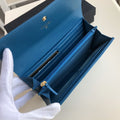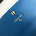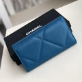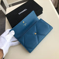 This is an CHANEL Goatskin Quilted Chanel 19 Flap Wallet Turquoise or This stylish wallet is crafted of luxurious quilted shiny goatskin in turquoise with a small aged brass Chanel CC logo. The wallet opens to a matching leather interior with slots and a zippered compartment.A