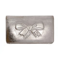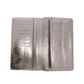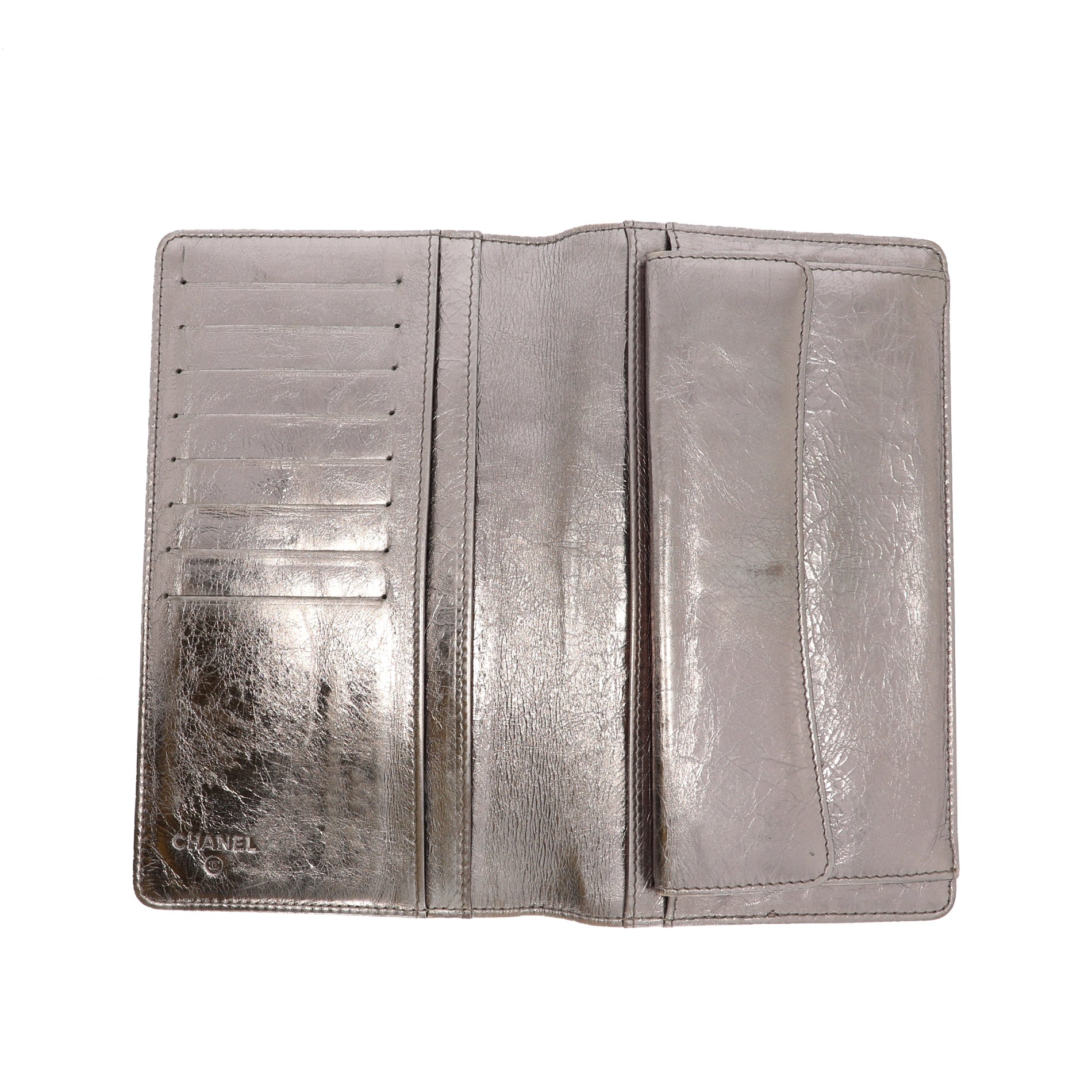 This gorgeous wallet is beautifully crafted of leather in Metallic platinum color with a decorative ribbon and metallic CC logo