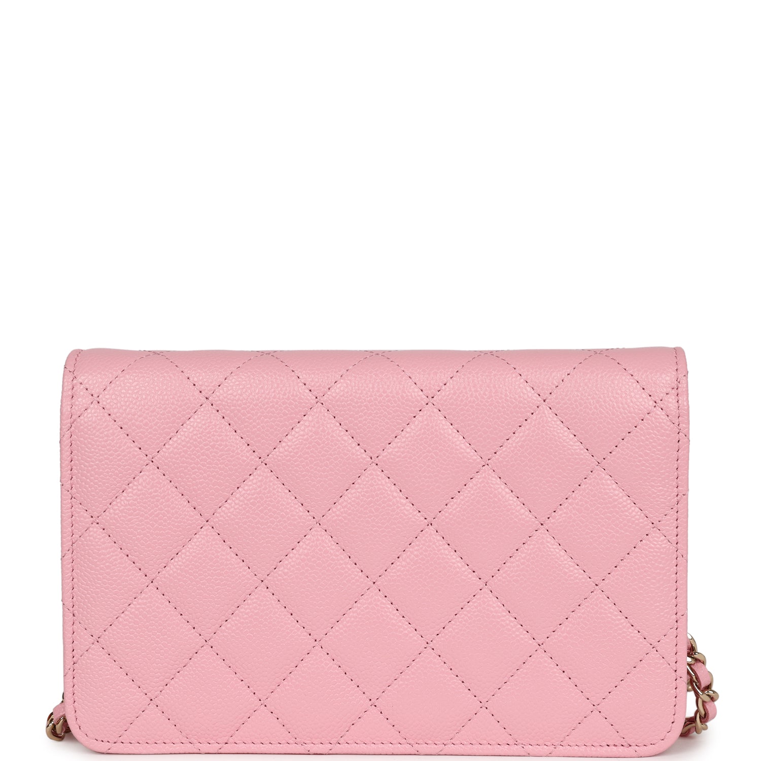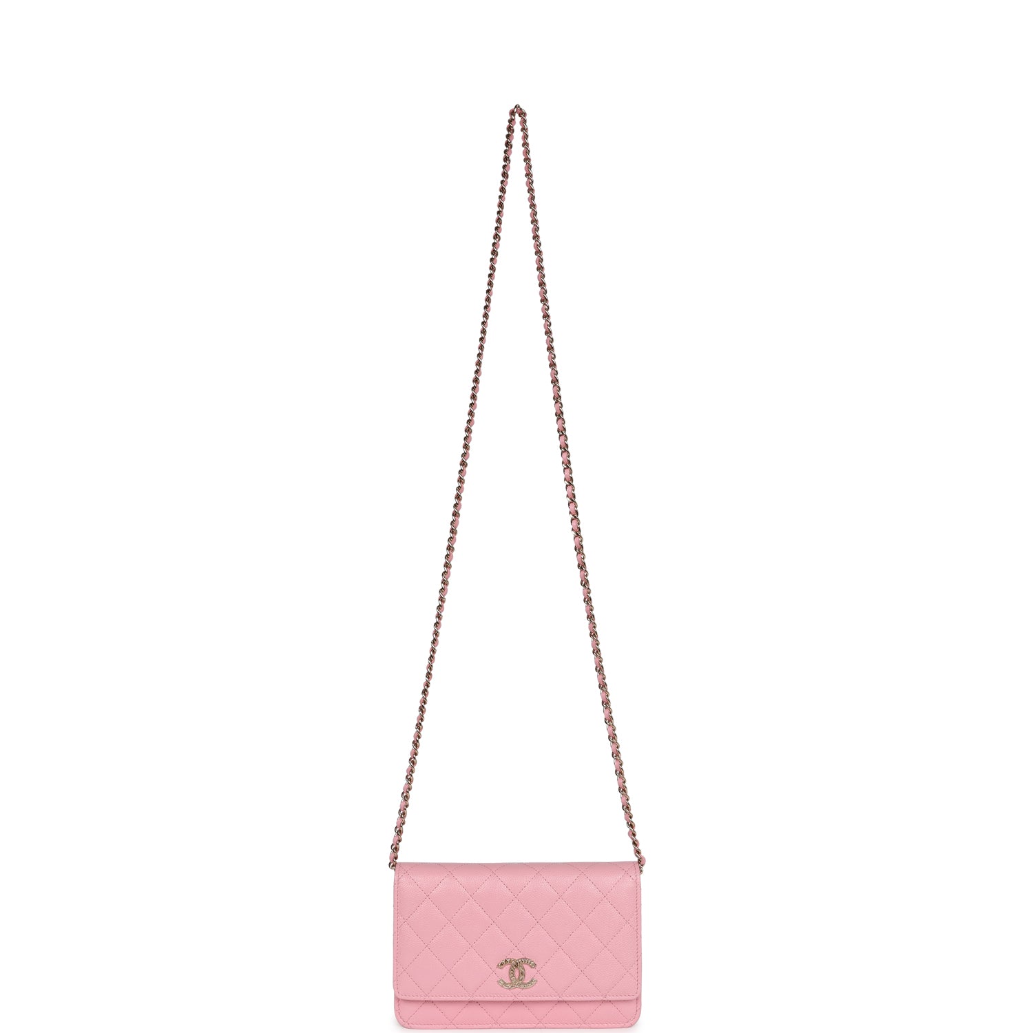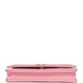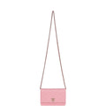 This Wallet on Chain is in Pink Caviar with gold hardware, signature half moon exterior back pocket, tonal chain-link crossbody strap/shoulder strap