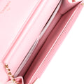 The interior is lined in Pink caviar leather with top zipper pocket under flap, slit front pocket, zipper compartment with pull, open pocket with six credit card slots and open pocket opposite credit card slots.