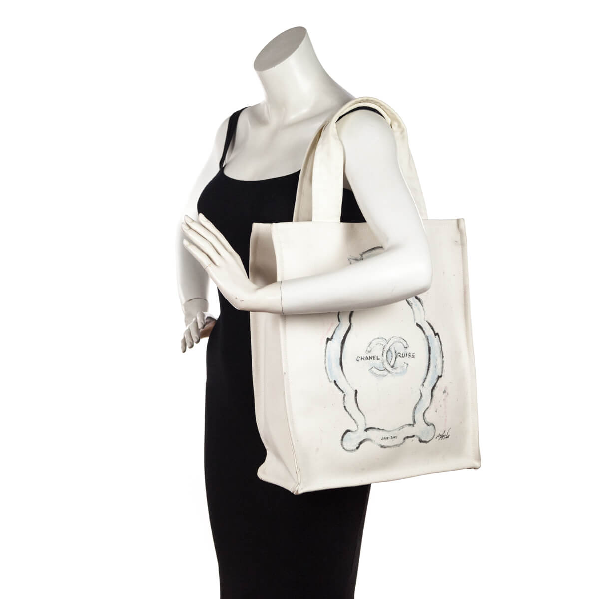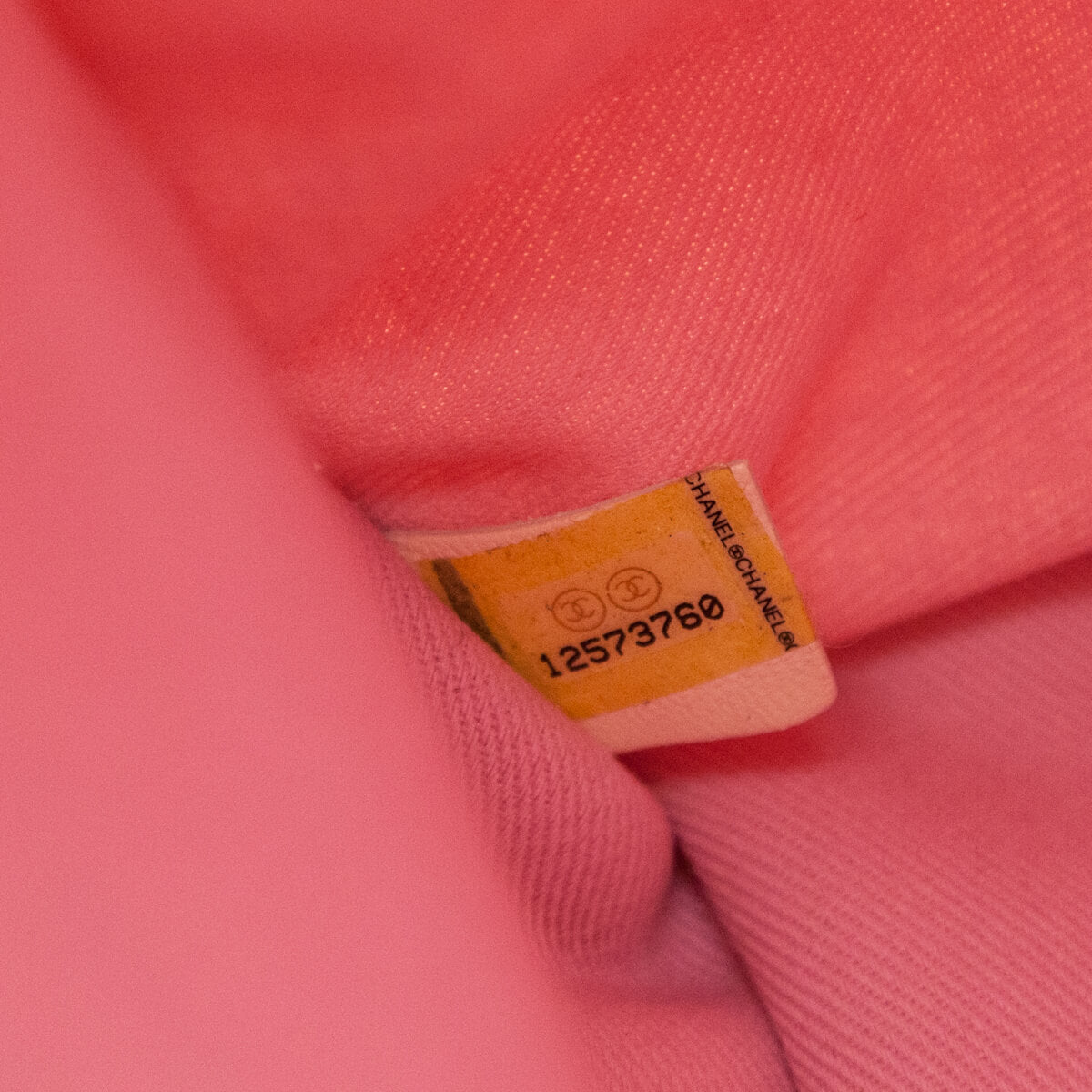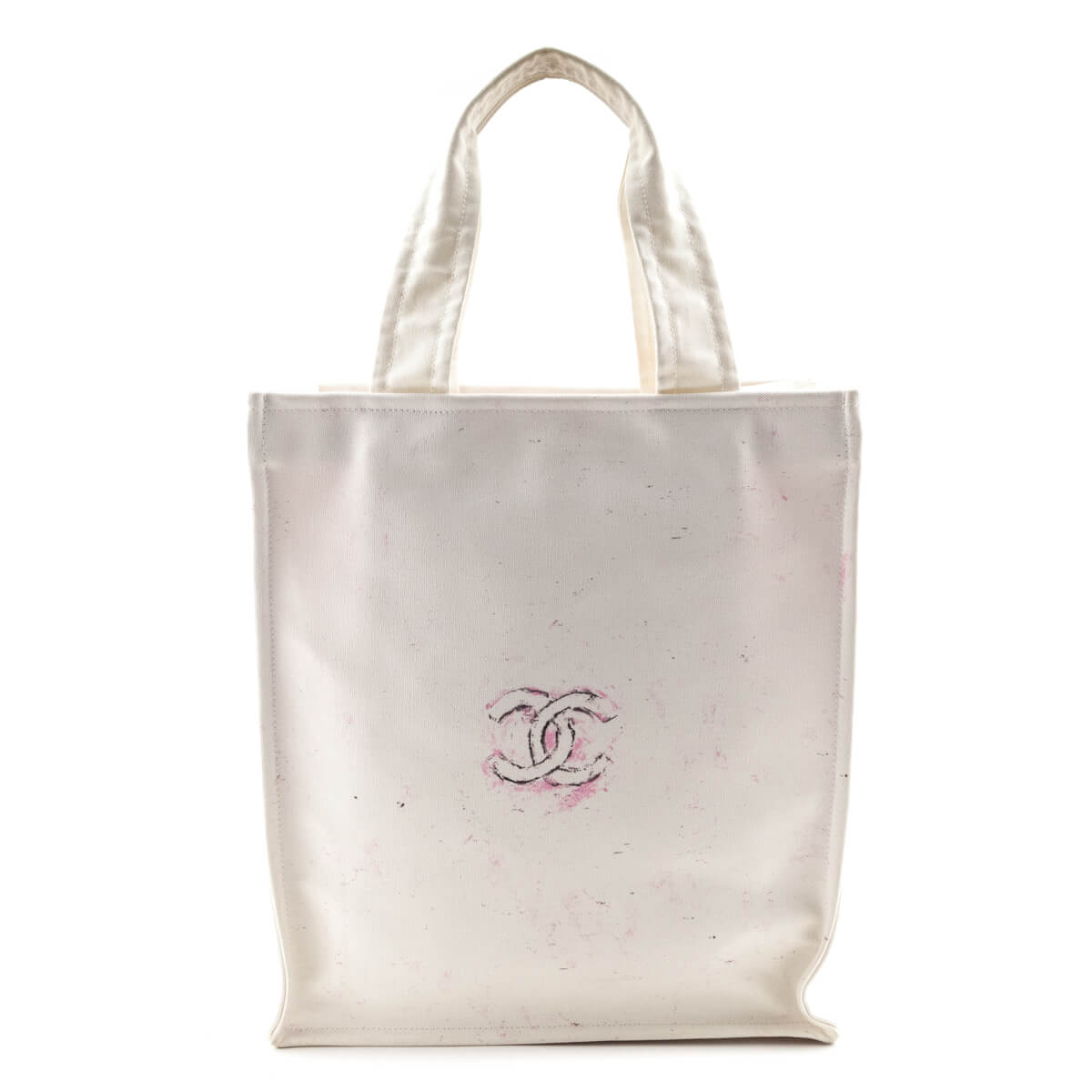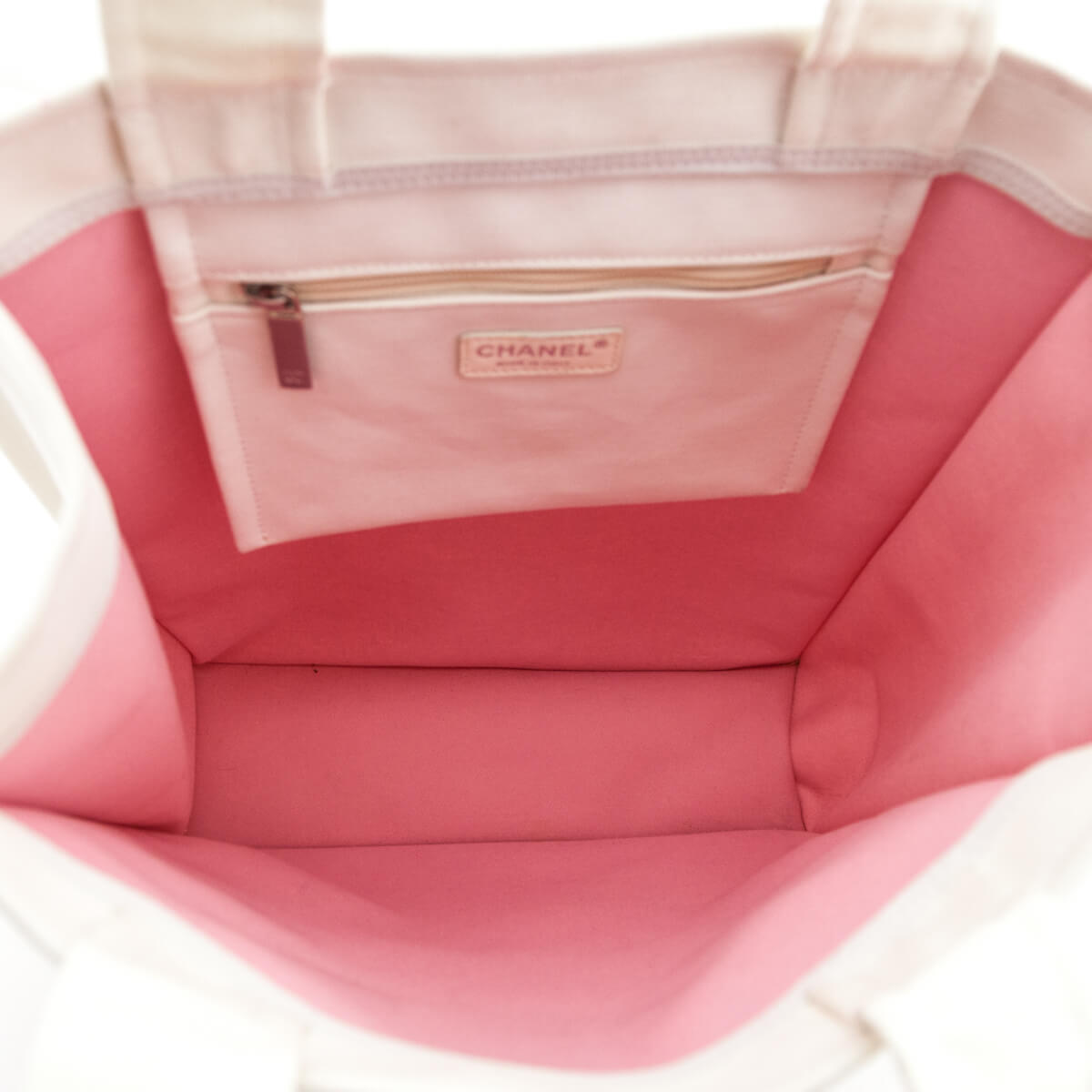 This secondhand Chanel Cruise Miami Tote presents an effortless aesthetic that will make the perfect travel companion to the beach or the boardwalk. Constructed from a durable white canvas, this structured tote showcases an artsy watercolor-inspired design from the brand's Miami 2008/2009 Cruise Collection. Faint multicolor paint splashes can be found throughout for an extra hint of playfulness. Sling the dual canvas top handles around your shoulder for easy hands-free wear, or carry in hand. An open top permits access into the spacious interior, lined in a bright pink canvas, where one white canvas flat hanging zip pocket presents along the rear wall. This Chanel White Canvas Chanel Cruise Miami Tote is a rare collector's item waiting to be incorporated into your pre-summer closet.