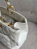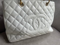 Chanel Grand Shopper Tote (GST) in White Caviar Leather with gold hardware. This very popular chain tote is sadly now discontinued and only available to buy . Great opportunity to own a practical, iconic and sophisticated Chanel bag without the same price tag as the classic flap styles. Perfect for day or evening use and the caviar leather is very resilient and durable. Can be carried in the crook of the arm or over shoulder using the chain straps.