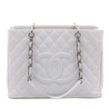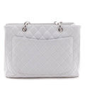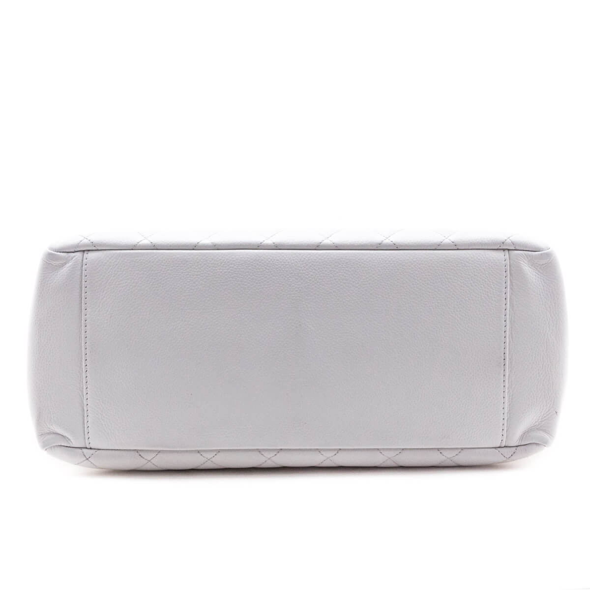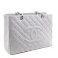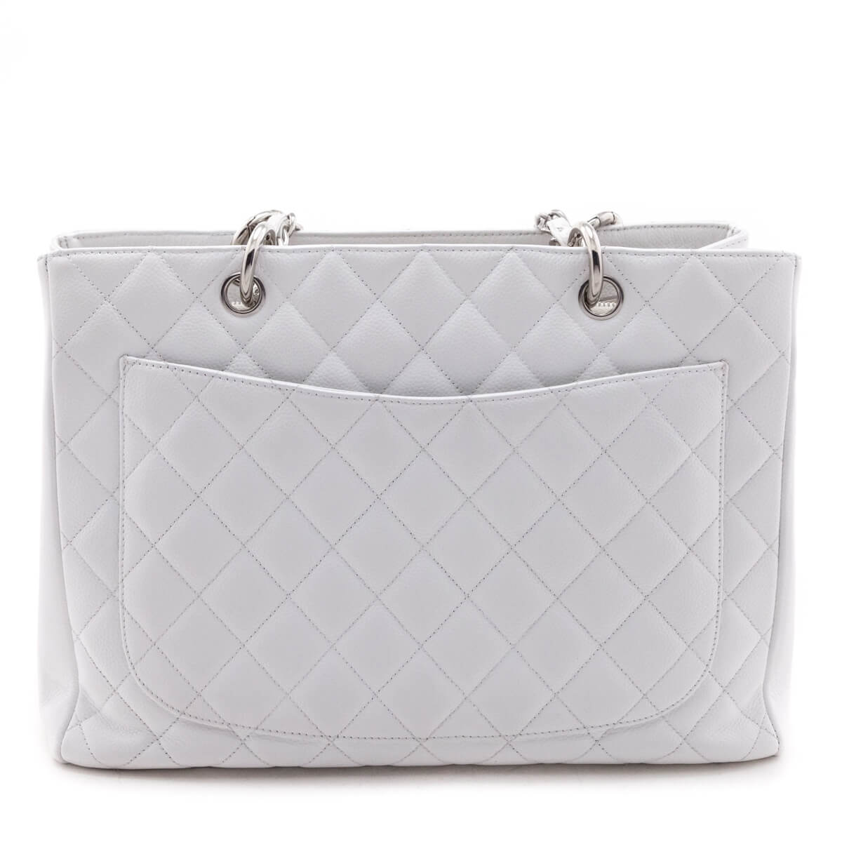 This Chanel Grand Shopping Tote is a coveted pick loved for its practicality and iconic, yet sadly discontinued silhouette. Composed of a white Caviar leather with diamond quilting stitched throughout, this Chanel GST contrasts its monochromatic leather with silver-tone hardware. Exterior details include a non-quilted Caviar base and sides, a large patch pocket at the rear wall, and a prominently stitched CC logo embossed at the front wall. The dual interwoven leather & chain-link straps feature leather guards for comfortable toting on-shoulder. Lined in a white fabric, the spacious interior is separated into two gusseted compartments by a zippered partition pocket. In the front section, one slip pocket is joined by a D-ring for attaching a luxury pouch (not included) or keys, and the rear offers one large zippered pocket. This Chanel White Caviar Quilted Grand Shopping Tote is the luxury staple you won't want to miss! Pair it with a knit sweater dress and a knee-high boots for a casually elevated everyday look this upcoming fall season.