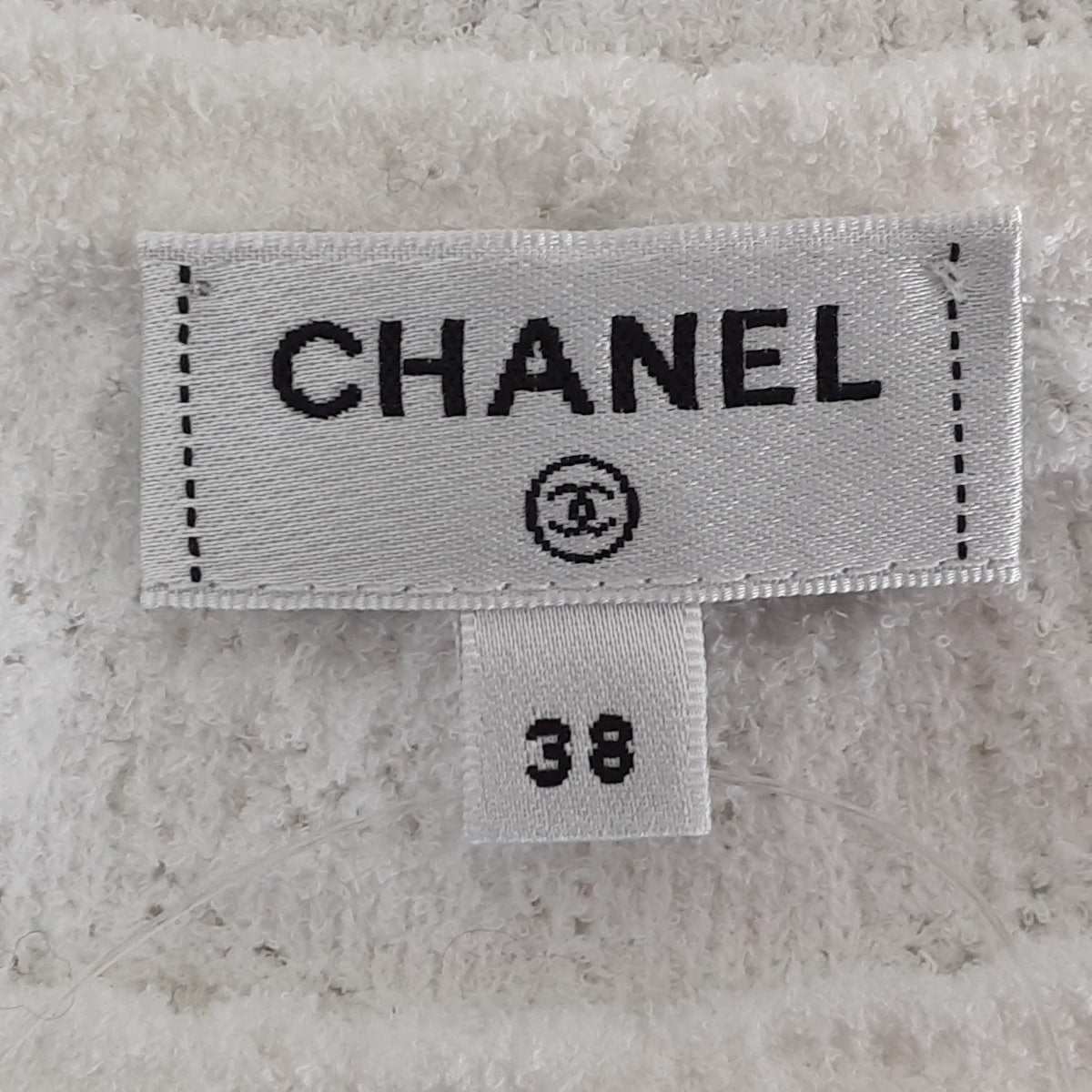 Indulge in luxury with the Chanel White CC Top, featuring the iconic CC logo and crafted from quality materials. This top exudes sophistication in its white color and fits perfectly in size 38. In very good condition, this piece will elevate any outfit and make a statement.
