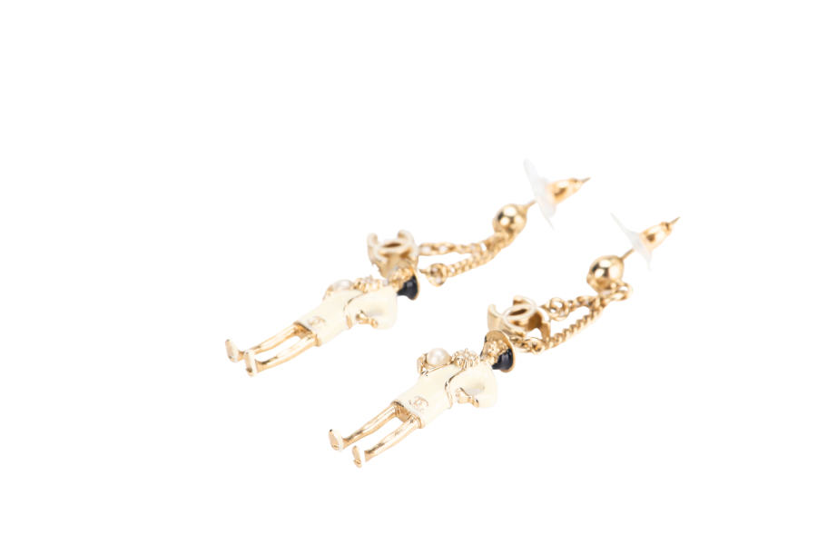 CHANEL WHITE ENAMEL COCO FIGURINE DROP EARRING, NO BOX