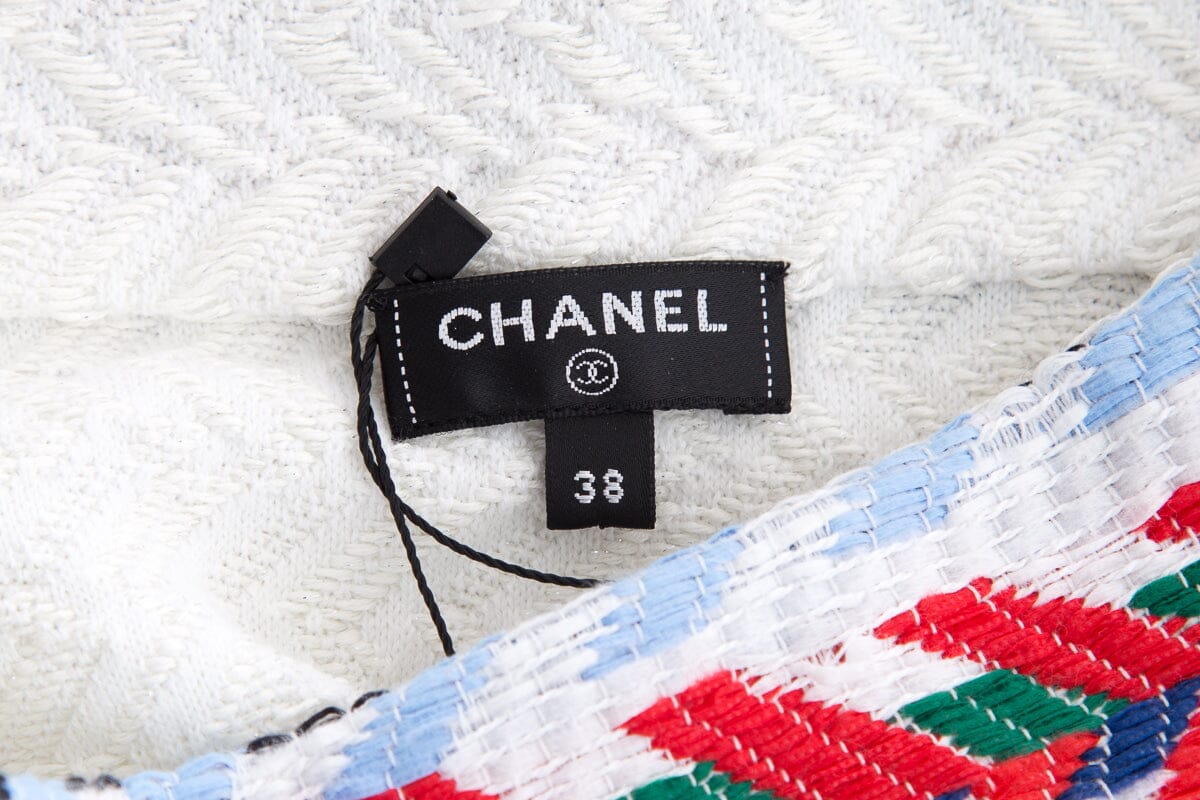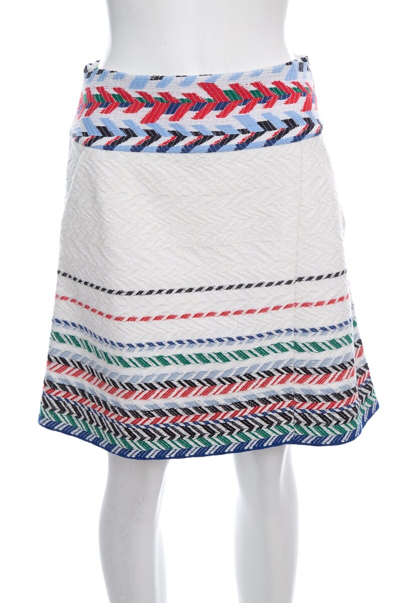 Chanel White Knit Skirt with Embroidered Chevron Pattern. This item is in good condition; minor pulling in fabric.