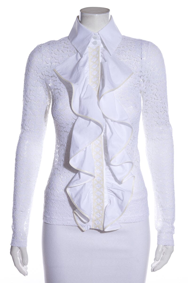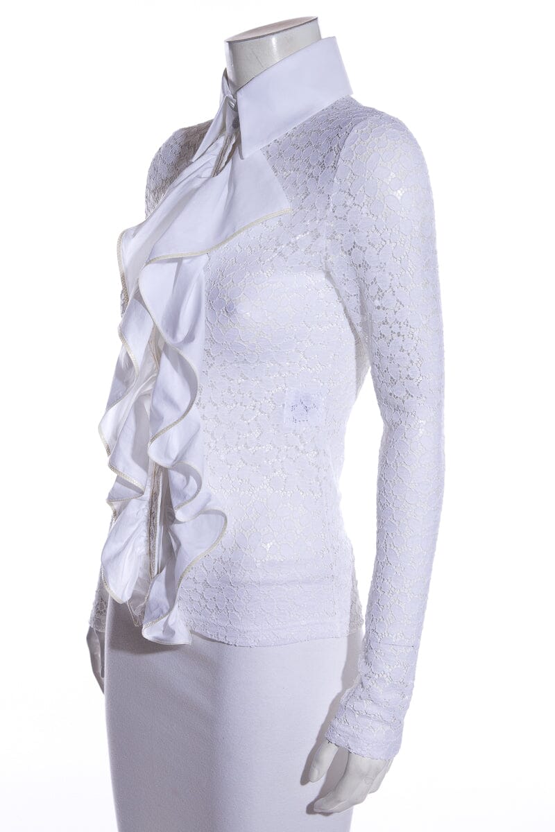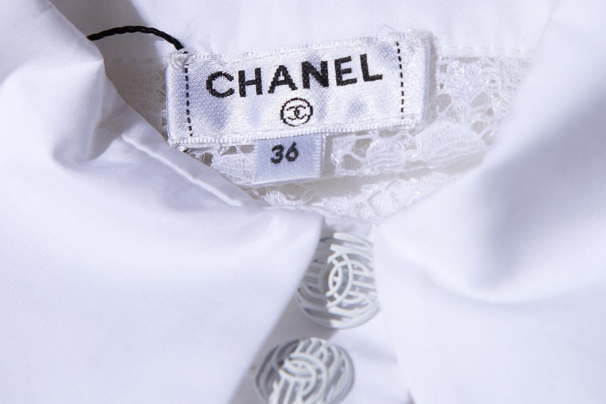 Chanel Ruffle Collar White Lace Blouse W/ CC Logo Button Neck. This item is in good condition.