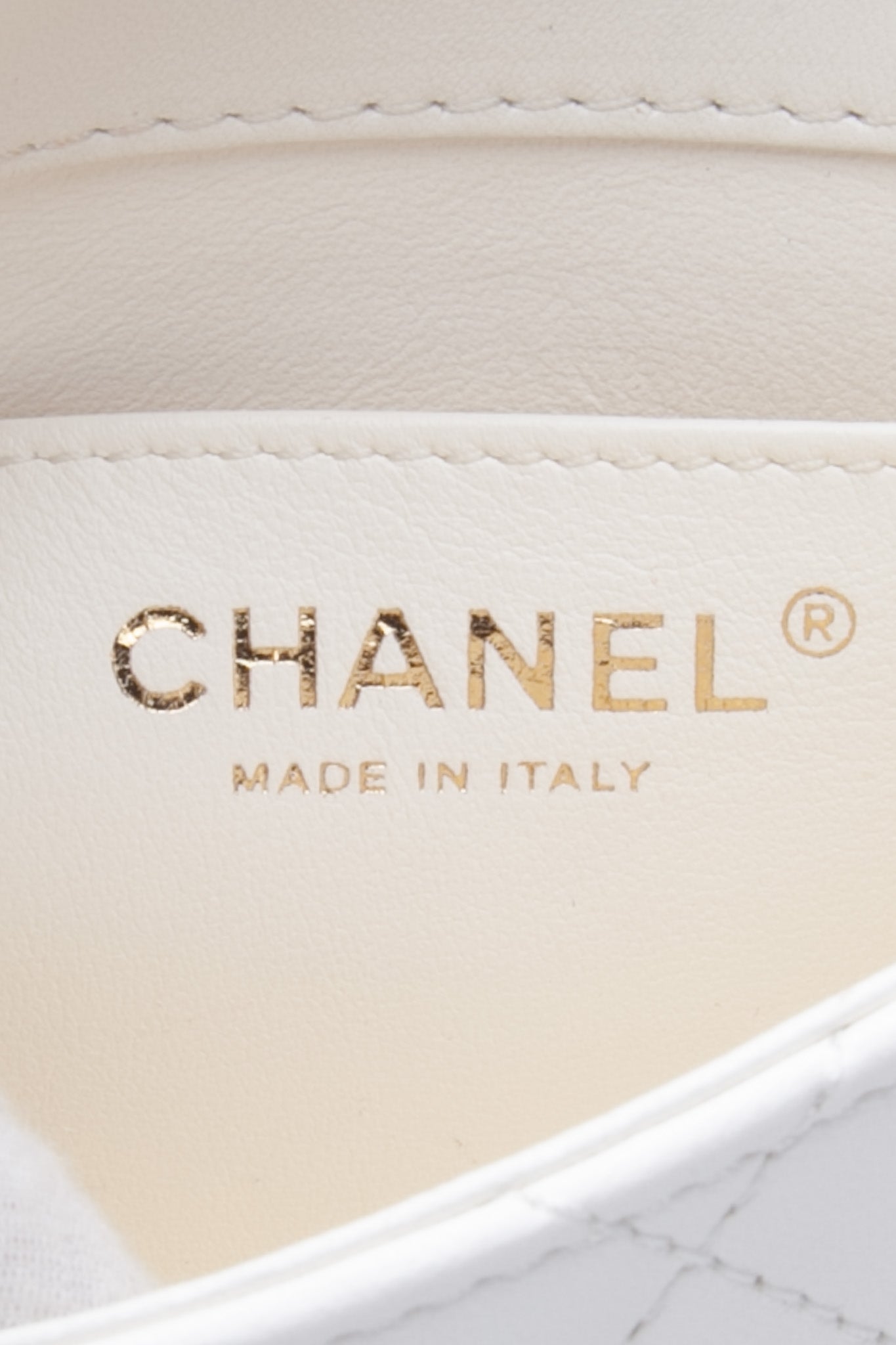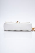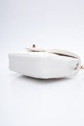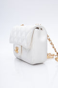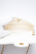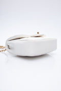 This stunning cross body petite flap Bag is finely crafted of soft white diamond quilted lambskin leather. The Bag features gold chain link shoulder straps threaded with leather, heart Chanel CC charms and a gold CC turn lock. The front flap opens to a white interior with a patch pocket.