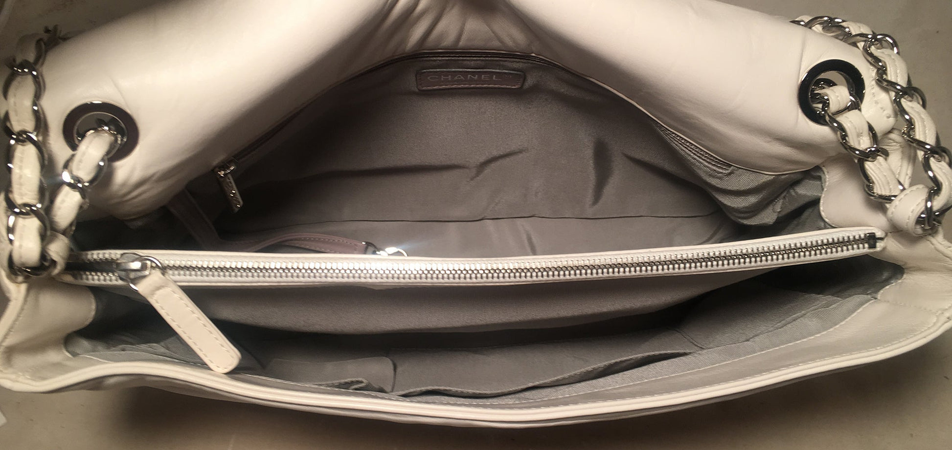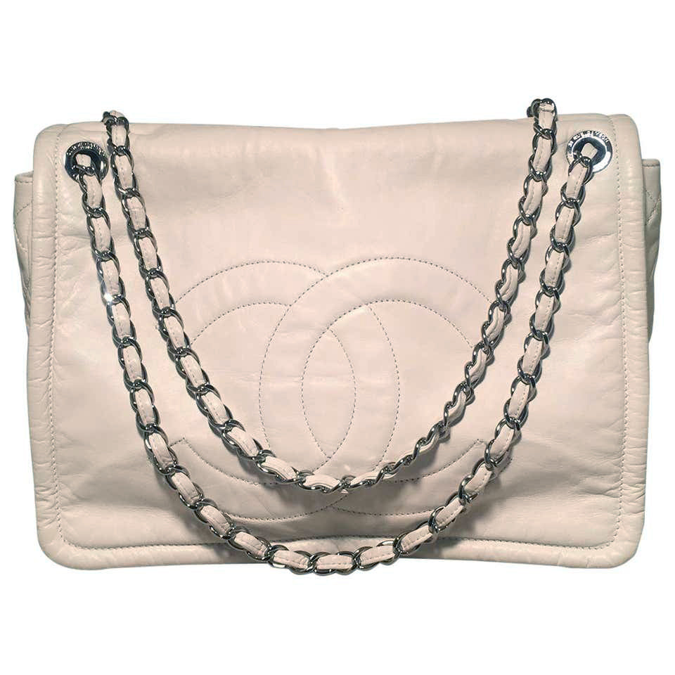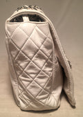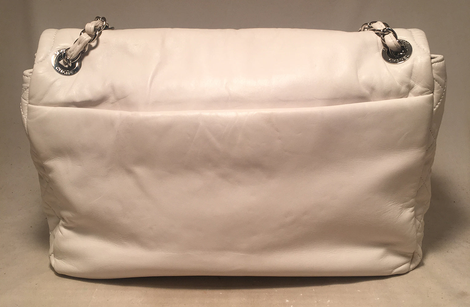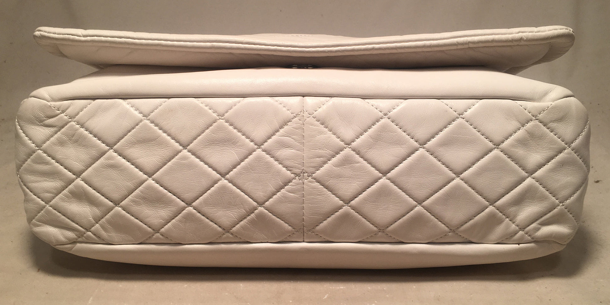 Chanel White Leather Quilted CC logo XL Maxi Classic Top Flap Shoulder Bag in excellent condition. White calfskin leather exterior with signature CC logo along top flap, quilted diamond pattern sides, and back side snap slit pocket. Front magnetic snap flap closure opens to a grey nylon interior with 2 compartments separated by a centered zipper pocket. Back side holds one side zippered pocket while the front side holds one slit and one cell side pockets. No stains, smells or scuffs. Clean corners, edges and interior. Rare XL maxi size perfect for a variety of occasions and carries all your essentials in timeless Chanel style. Purchase includes a dust cover. Measurements: 13"x10"x5" 9.5-18" strap drop