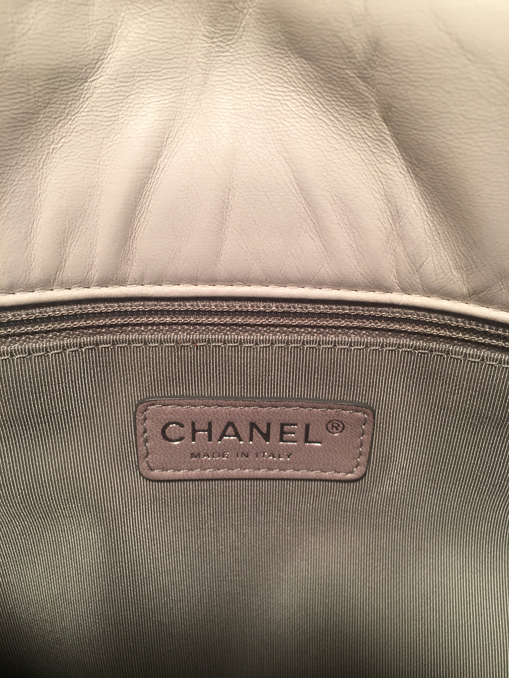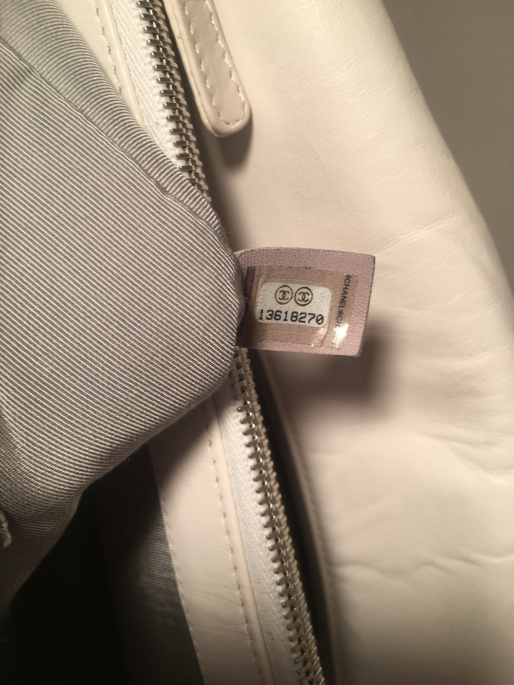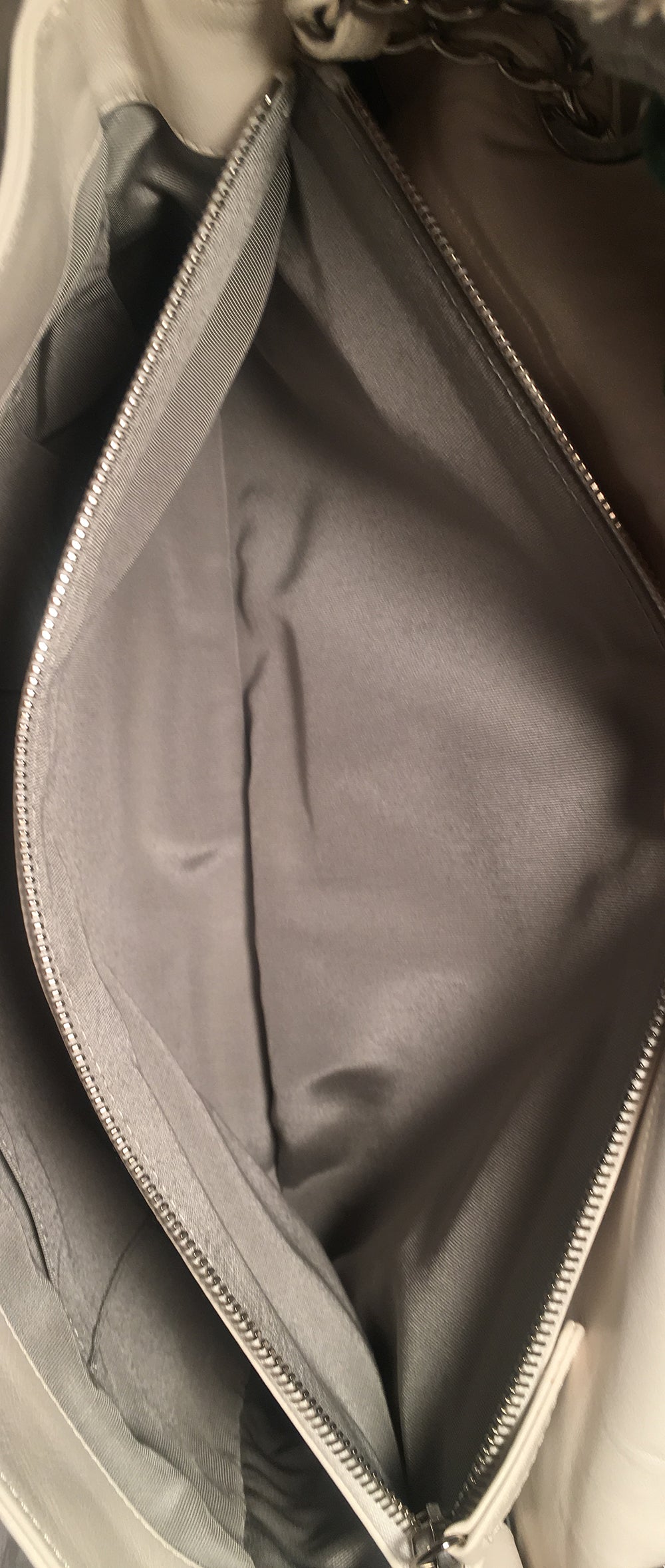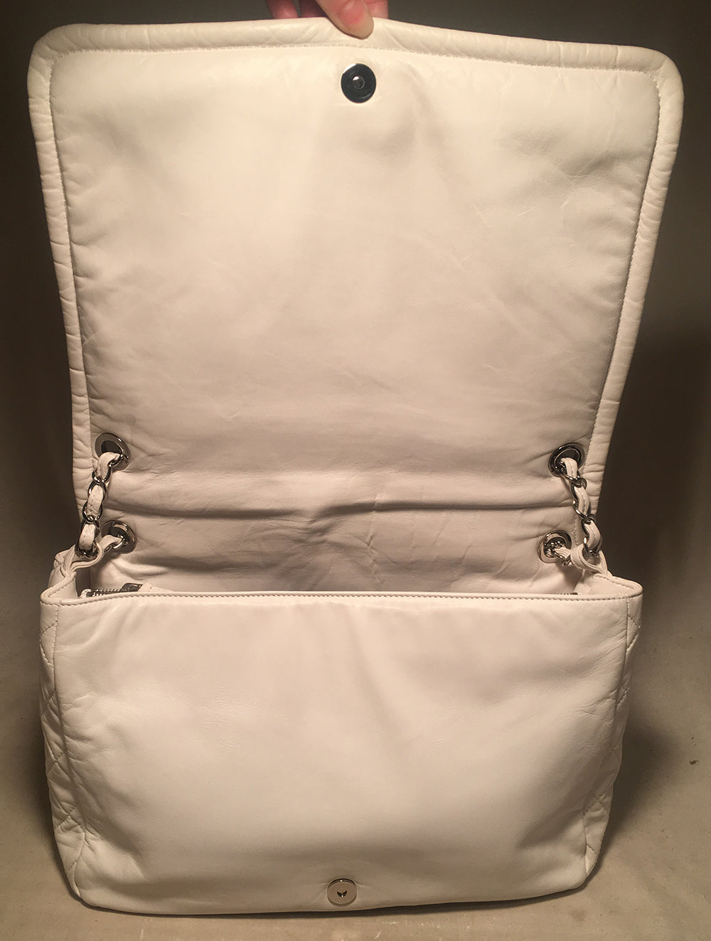Chanel White Leather Quilted CC logo XL Maxi Classic Top Flap Shoulder Bag in excellent condition. White calfskin leather exterior with signature CC logo along top flap, quilted diamond pattern sides, and back side snap slit pocket. Front magnetic snap flap closure opens to a grey nylon interior with 2 compartments separated by a centered zipper pocket. Back side holds one side zippered pocket while the front side holds one slit and one cell side pockets. No stains, smells or scuffs. Clean corners, edges and interior. Rare XL maxi size perfect for a variety of occasions and carries all your essentials in timeless Chanel style. Purchase includes a dust cover. Measurements: 13"x10"x5" 9.5-18" strap drop