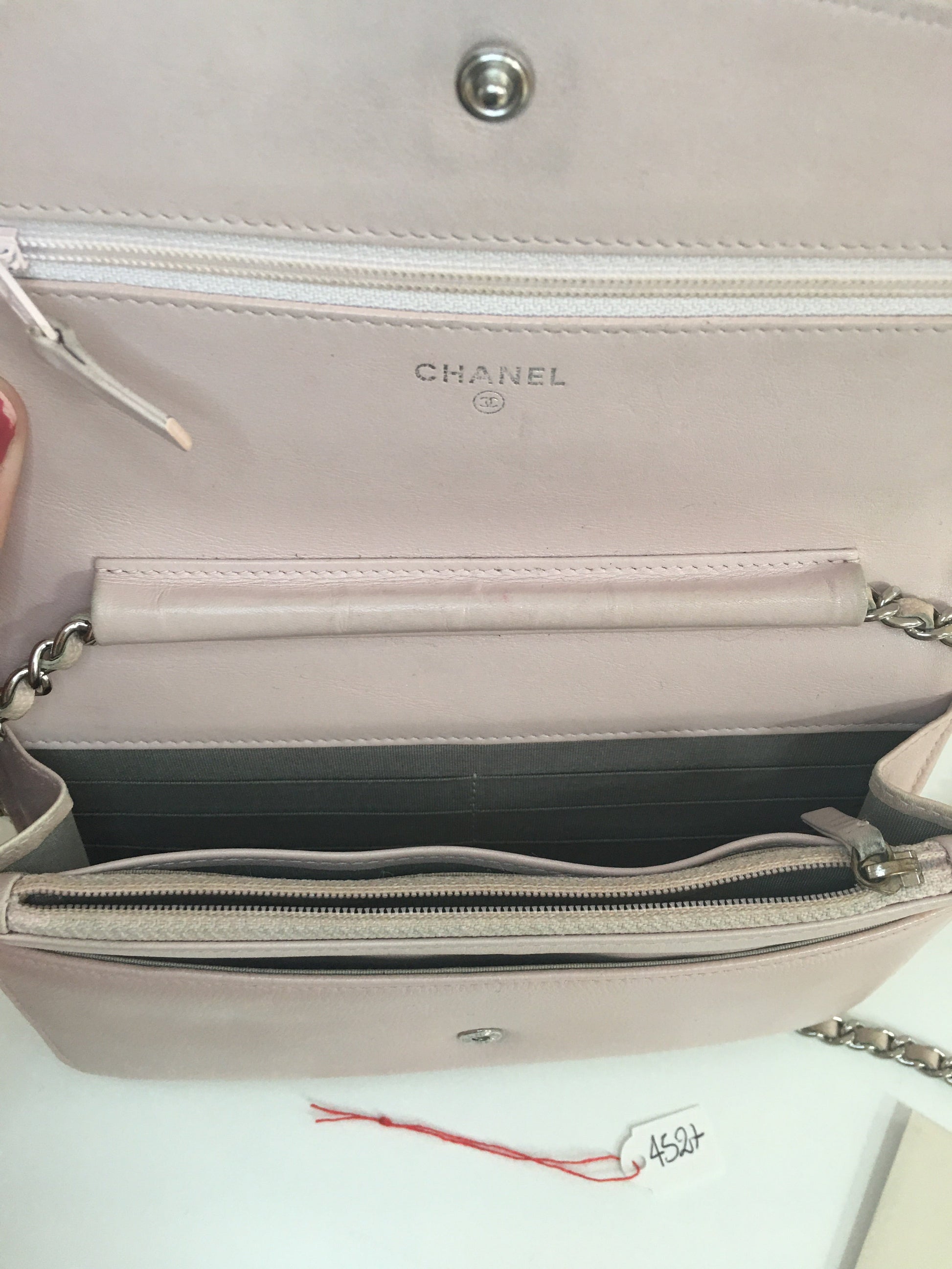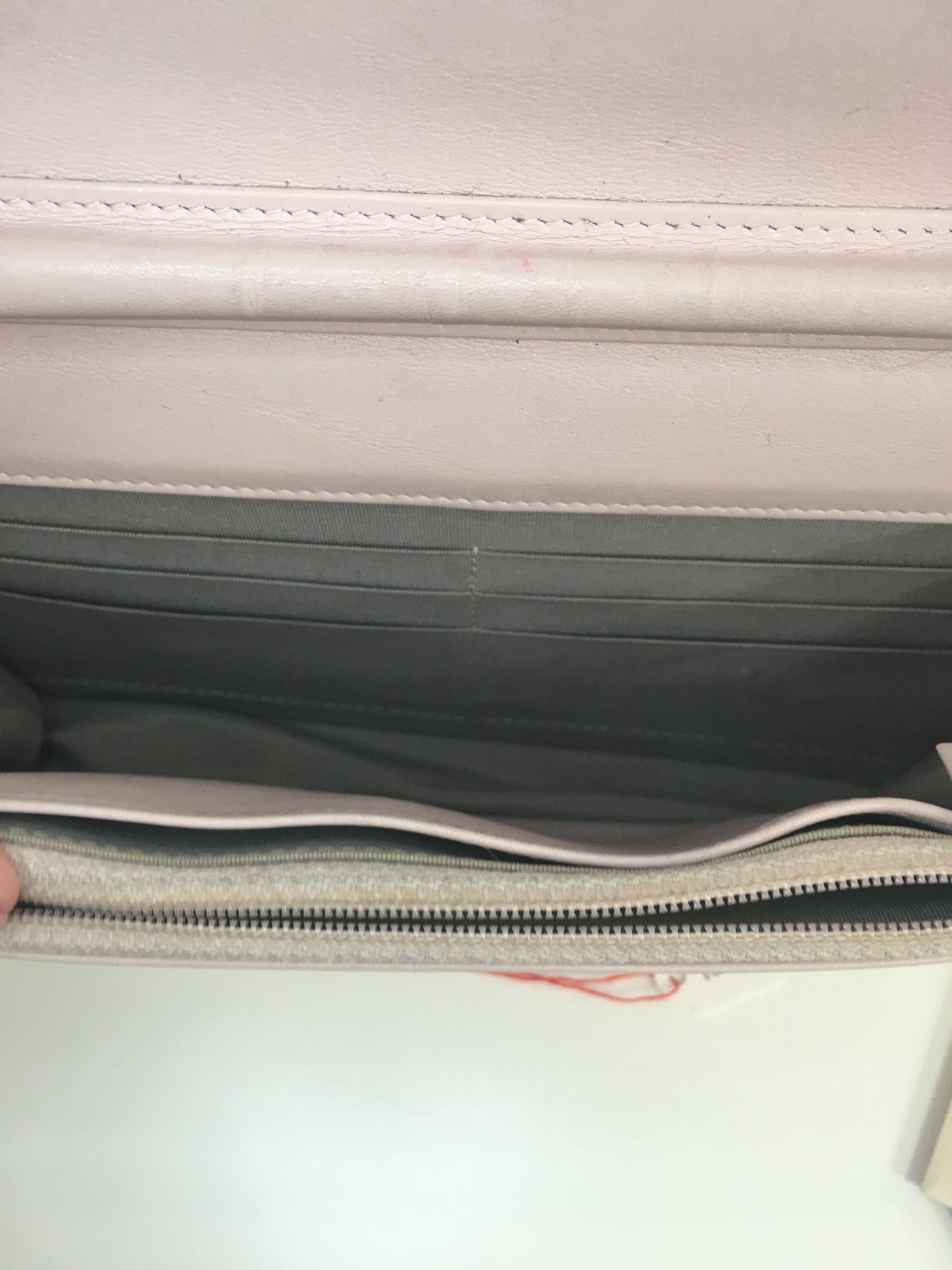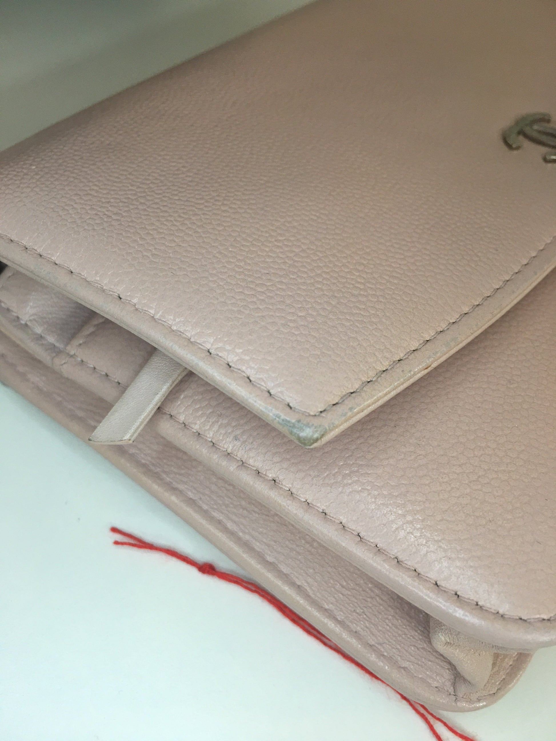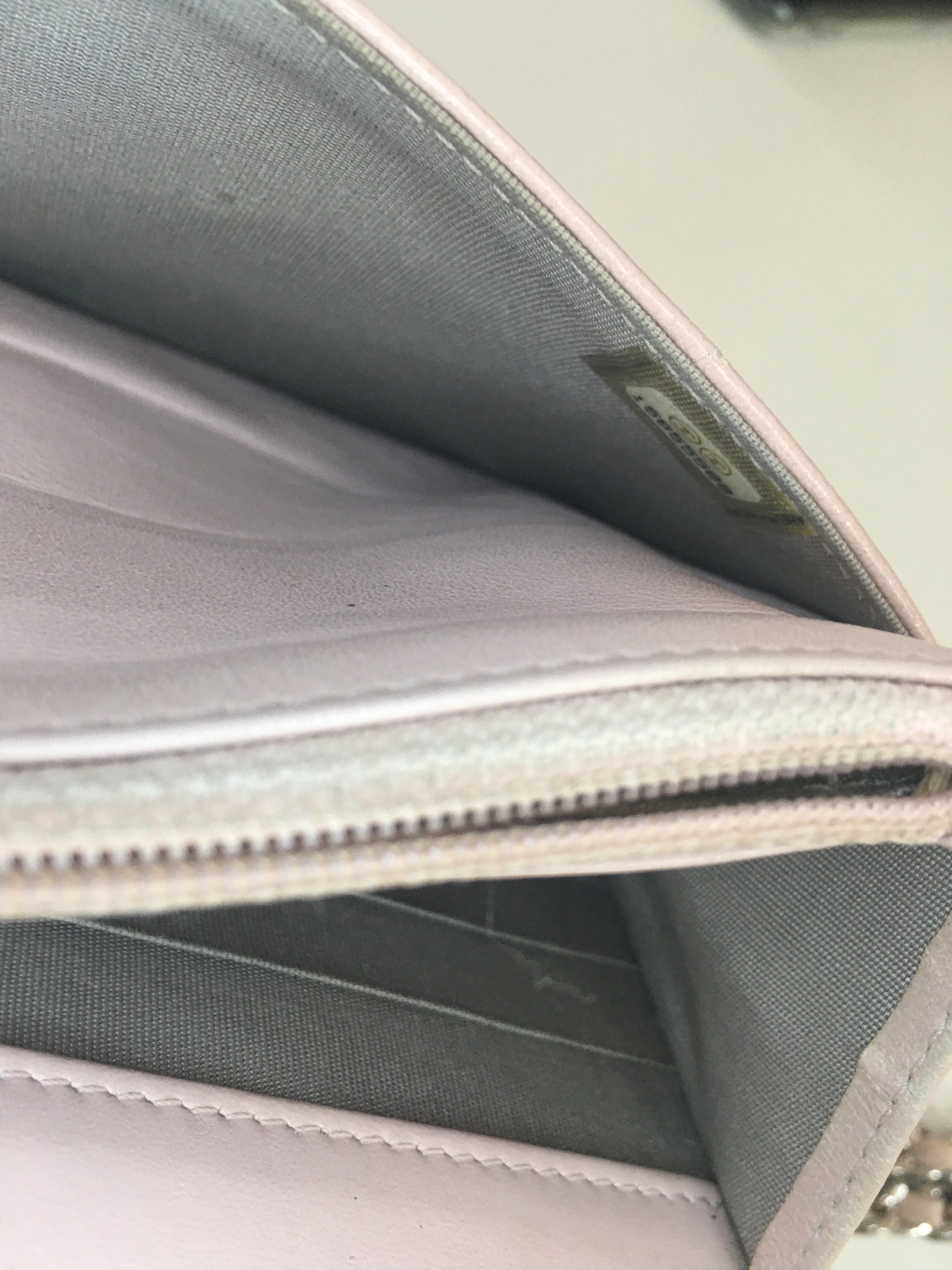Inside, the leather is slightly , especially near the little zipped pocket and the chain holder