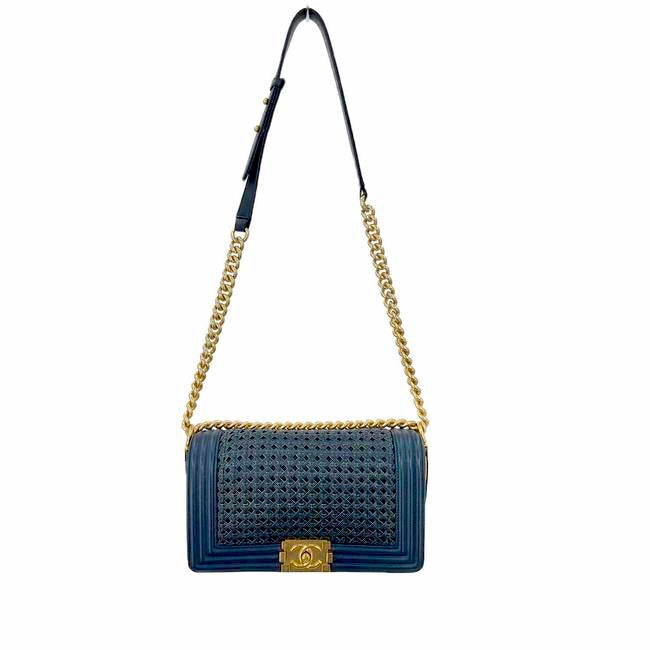 This bag is crafted on woven calfskin leather in navy blue. The structured silhouette has a classic CC push lock on the front, gold-tone hardware, and a chain-link strap. The thick chain can be long or short and the pinch-clasp opens to one spacious compartment with a side pocket.