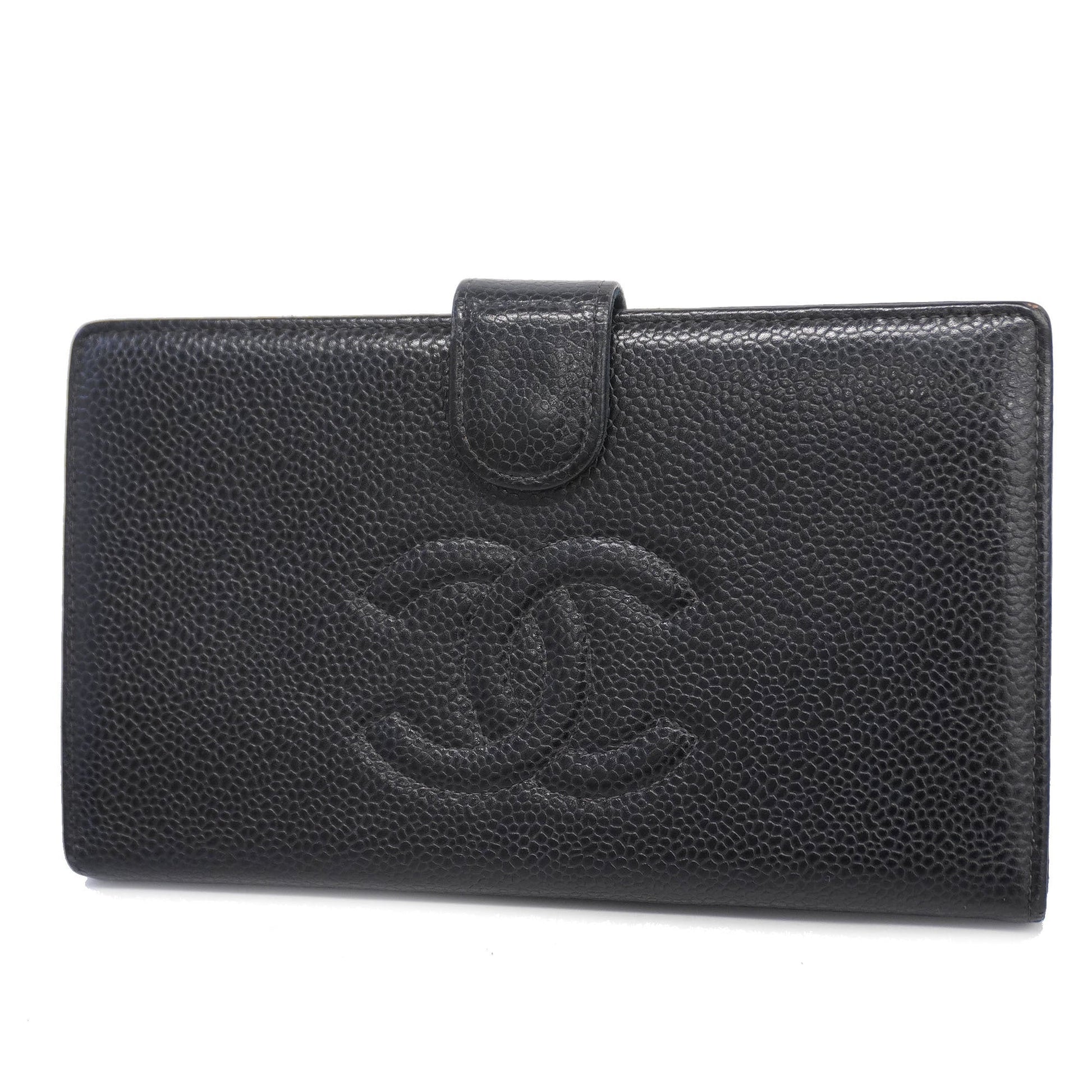 Auth Chanel Gold Hardware Women's Caviar Leather Long Wallet Black