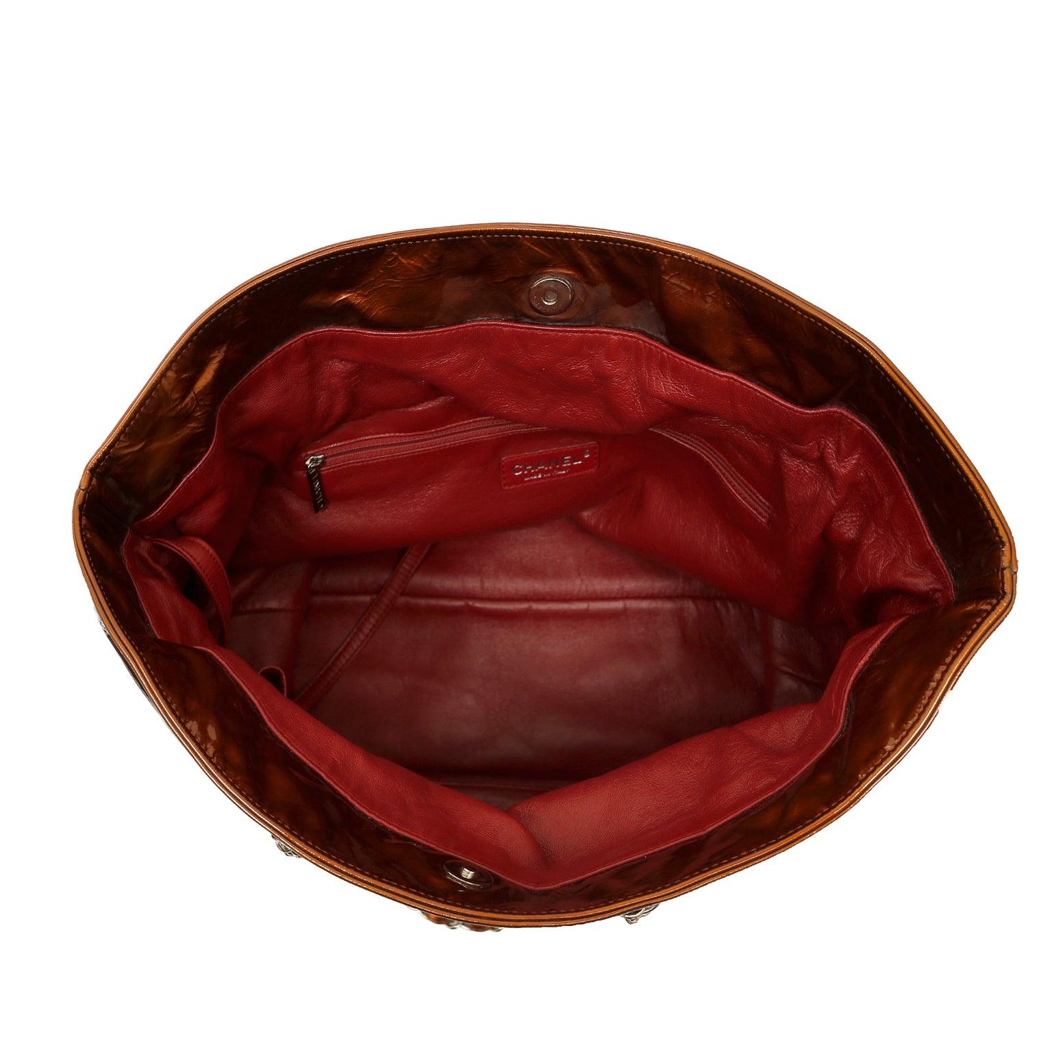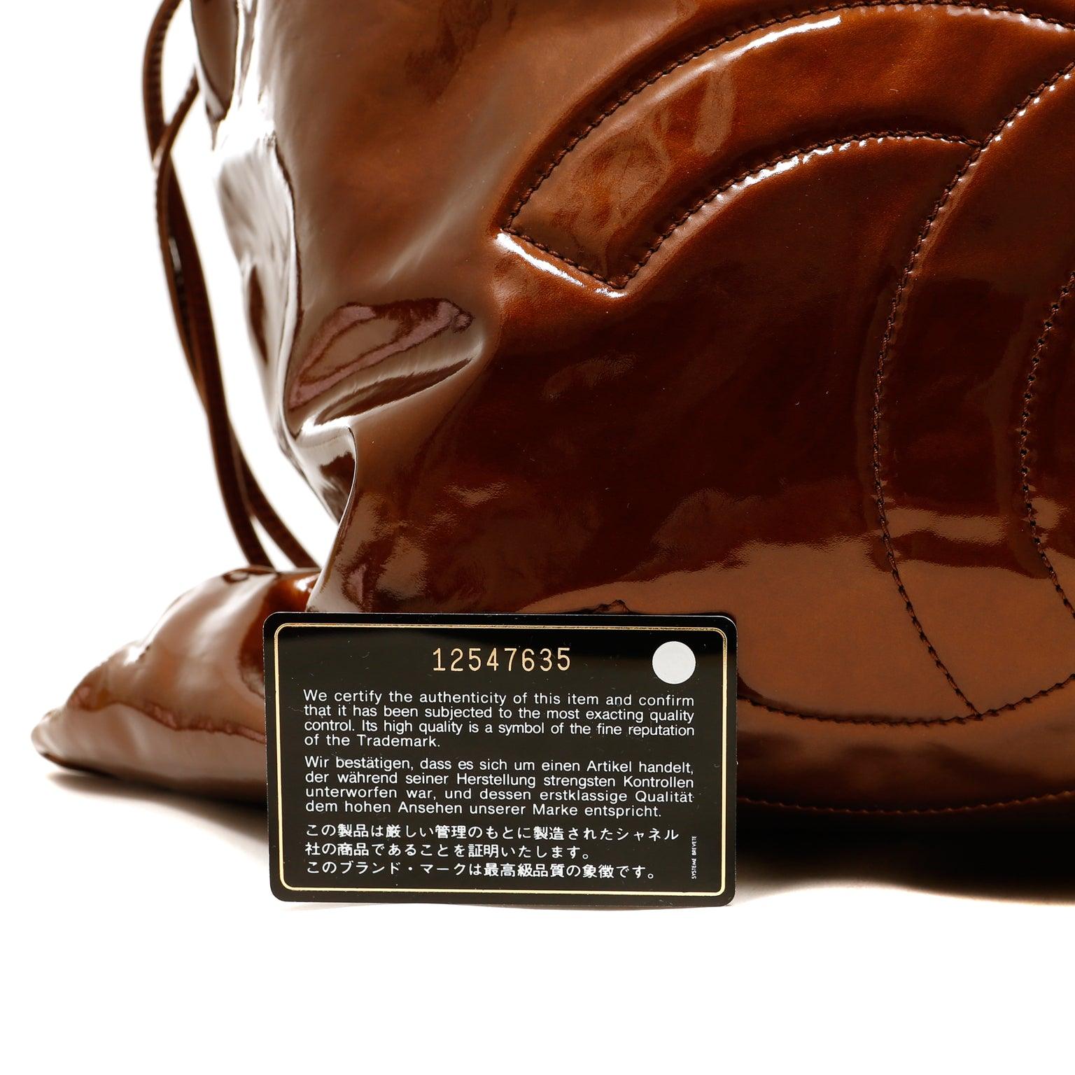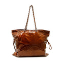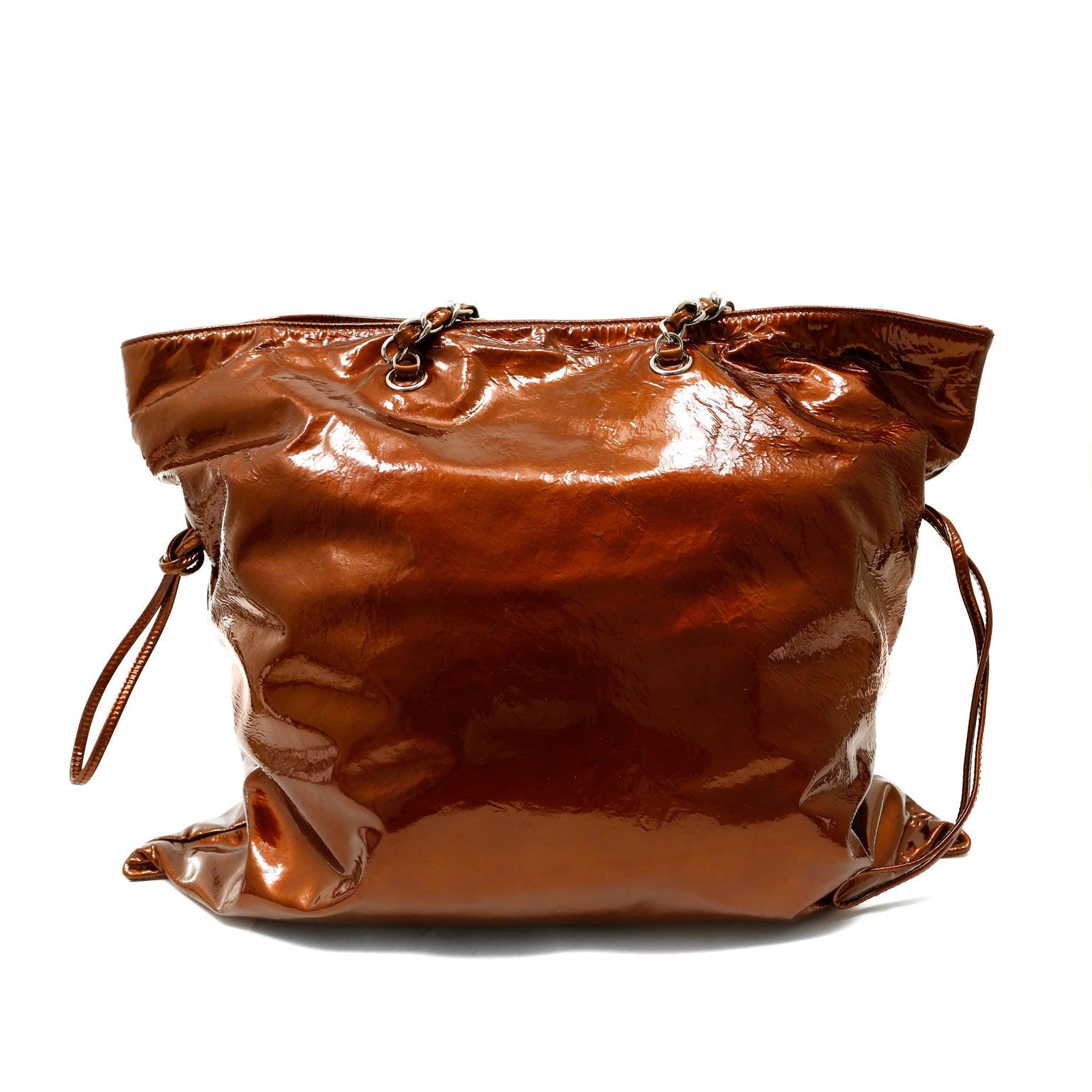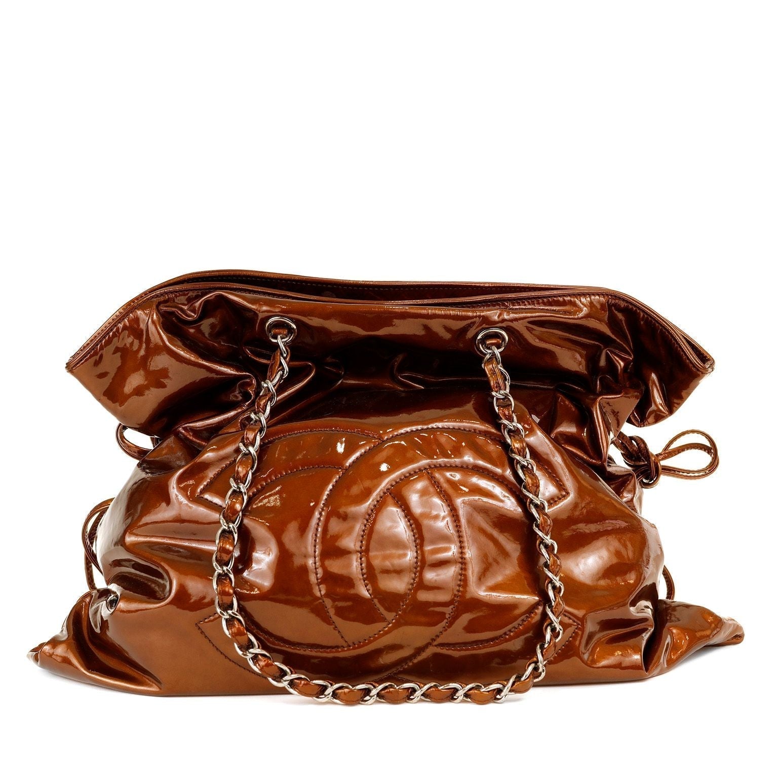 Coppery bronze patent leather large tote has a colossal interlocking CC stitched on the front. Magnetic snap closure accesses the roomy leather interior. One side zippered pocket and an attached leather key fob assist with organization. Double leather and silver chain straps are comfortably carried on the shoulder. Made in Italy. Chanel ity card and dust bag included.