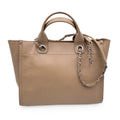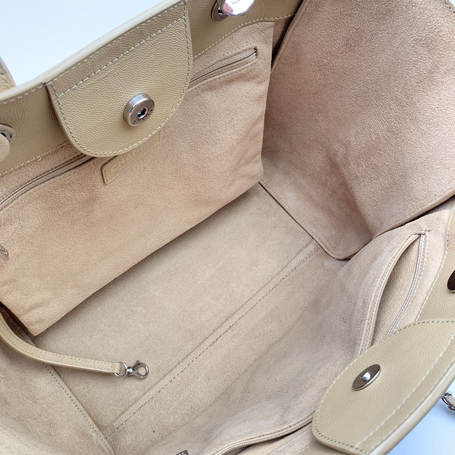 Beautiful Chanel 'Deauville' Tote, Crafted In Beige Caviar Leather. Period/era: 2018. The Bag Is Detailed With Studded 'Chanel Cc Paris' Writing On The Front. Magnetic Button Closure On Top. Double Top Carry Handles And Double Chain And Interwoven Leather Shoulder Straps. The Interior Is In Beige Suede. 2 Side Zip Pockets Inside. 'Chanel - Made In Italy' Tag Inside. ity Hologram Tag Inside