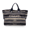 Beautiful Chanel 'Deauville' Tote, Crafted In Black, Grey And Beige Striped Canvas With a White 'Chanel Cc31, Rue Cambon - Paris' Logo. Period/era: 2018/2019. Double Black Eather Top Handles And Silver Metal And Interwoven Leather Shoulder Straps. Magnetic Button Closure On Top. The Interior Is In Beige Canvas Lining. 2 Side Zip Pockets Inside. Leather Strap With Hook Inside. 'Chanel - Made In Italy' Tag Inside. ity Hologram Tag Inside