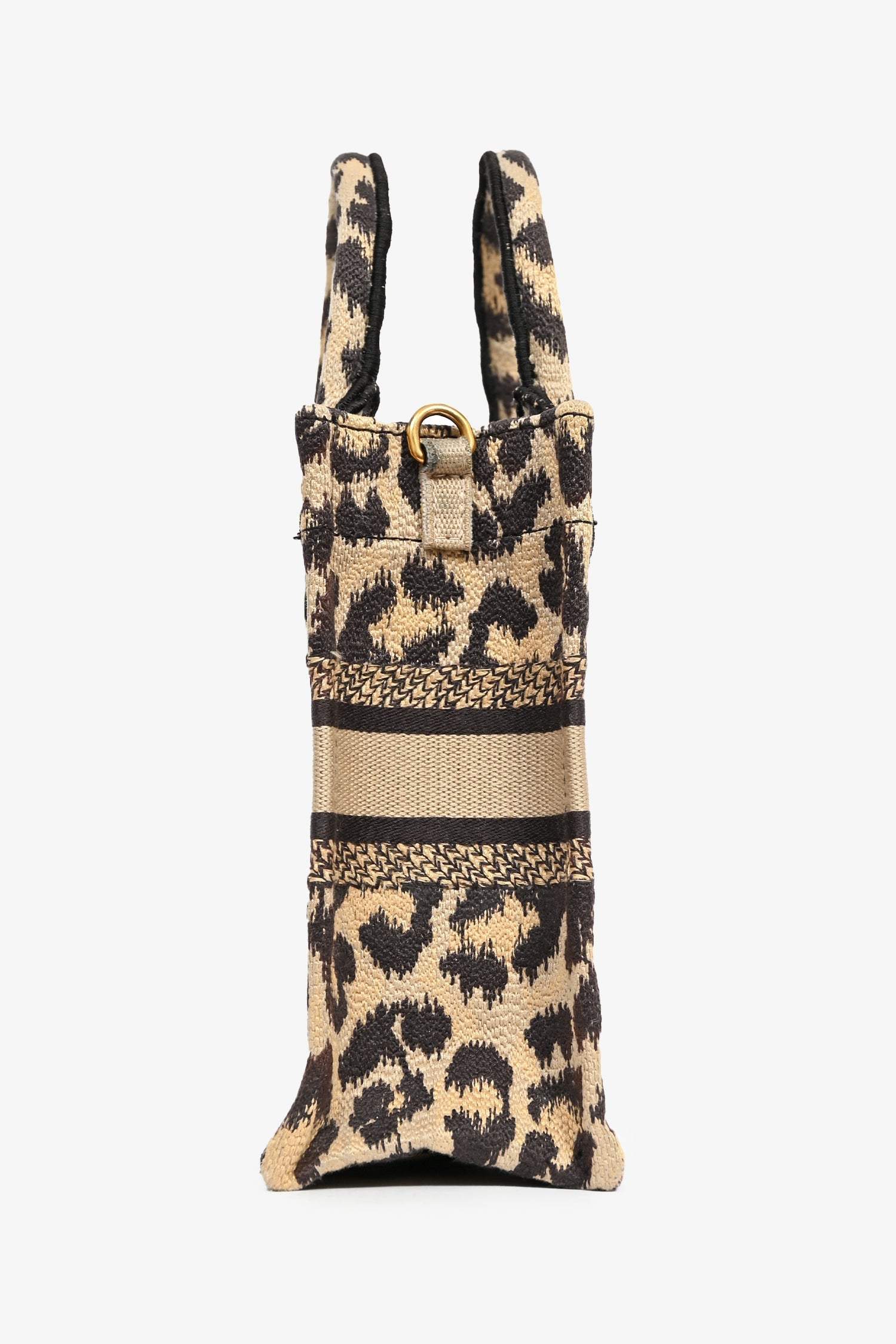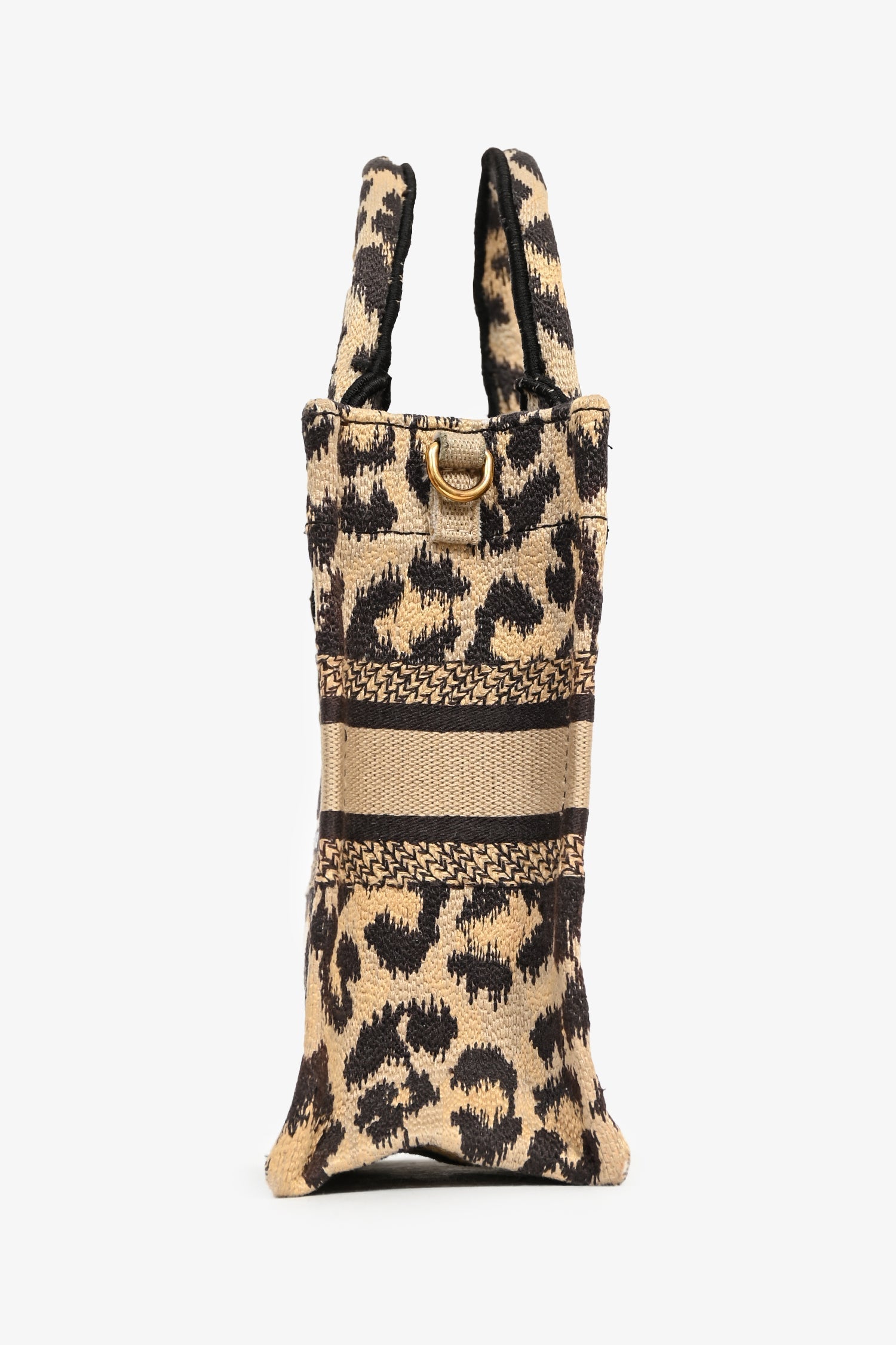 Christian Dior Beige Leopard Canvas Mini Book Tote Phone Bag. Dual rolled handles. Open interior. Detachable and adjustable strap. Gold-tone hardware.