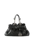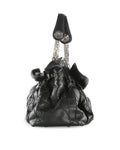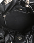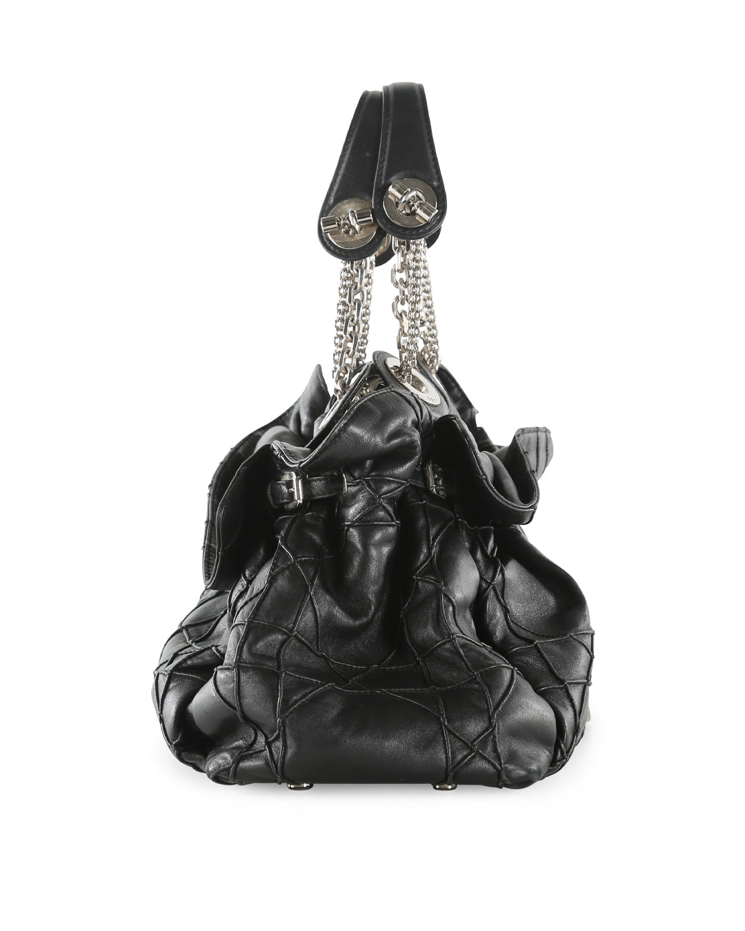 It features dual chain straps with leather shoulder rest, a CD cutout metal charm dangling at the front, buckled drawstring detail at the upper, top magnetic snap button closure which opens to a black nylon lined interior compartment with a zip pocket, five protective base studs, and silver tone hardware.
