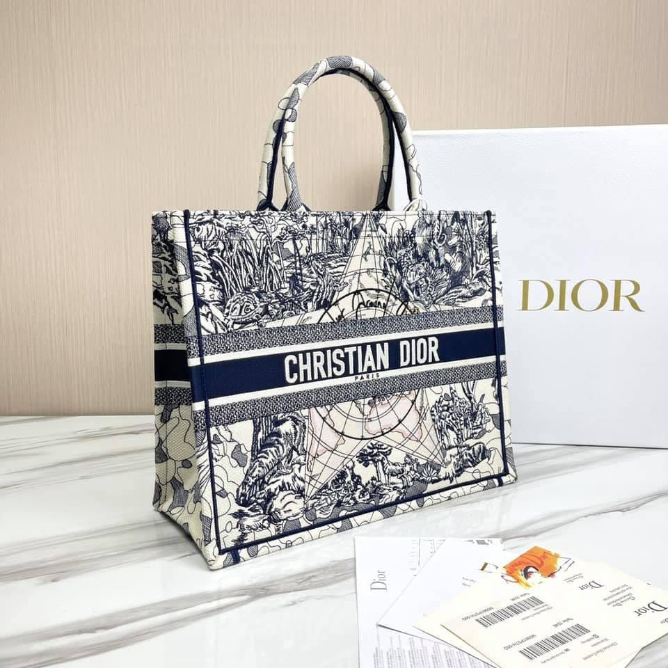 Introduced by Maria Grazia Chiuri, Creative Director of Christian Dior, the Dior Book Tote has become a staple of the Dior aesthetic. Designed to hold all the daily essentials, the black style is fully embroidered with a white Dior Around the World motif, further embellished with a play on shiny and matte thread. The design is adorned with the 'CHRISTIAN DIOR' signature on the front and exemplifies the House's signature savoir-faire. The tote may be carried by hand or over the shoulder.