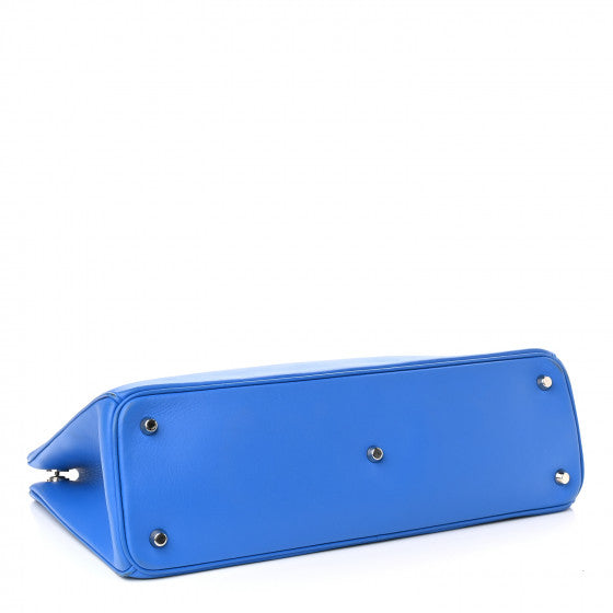 This Bag is crafted on calfskin leather Blue. The Bag features reinforced leather top handles, expandable sides, silver links, a silver Dior letters charm, and an extra-long cross-body leather shoulder strap with silver clasps. The top is open to a leather interior with pockets.