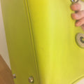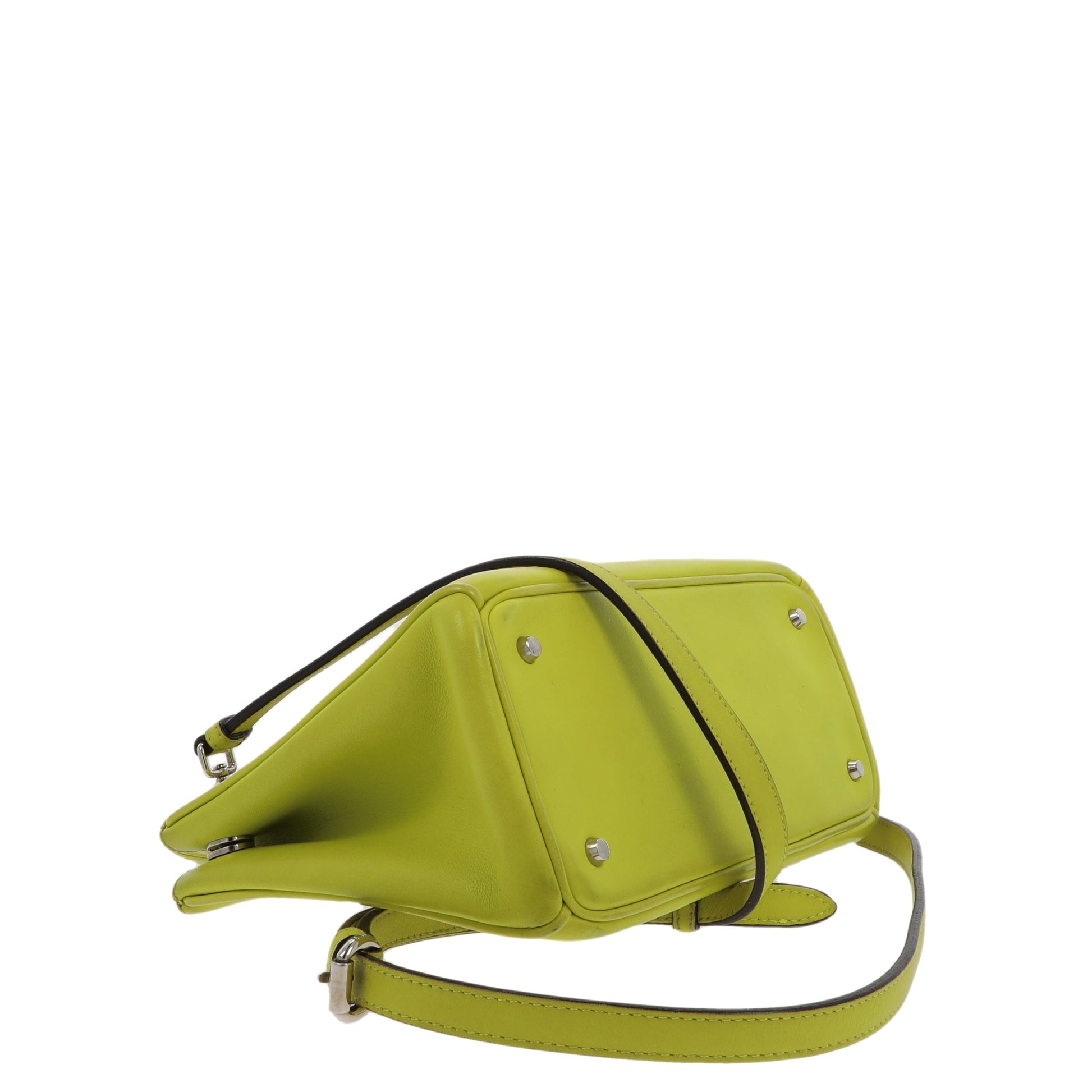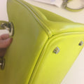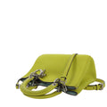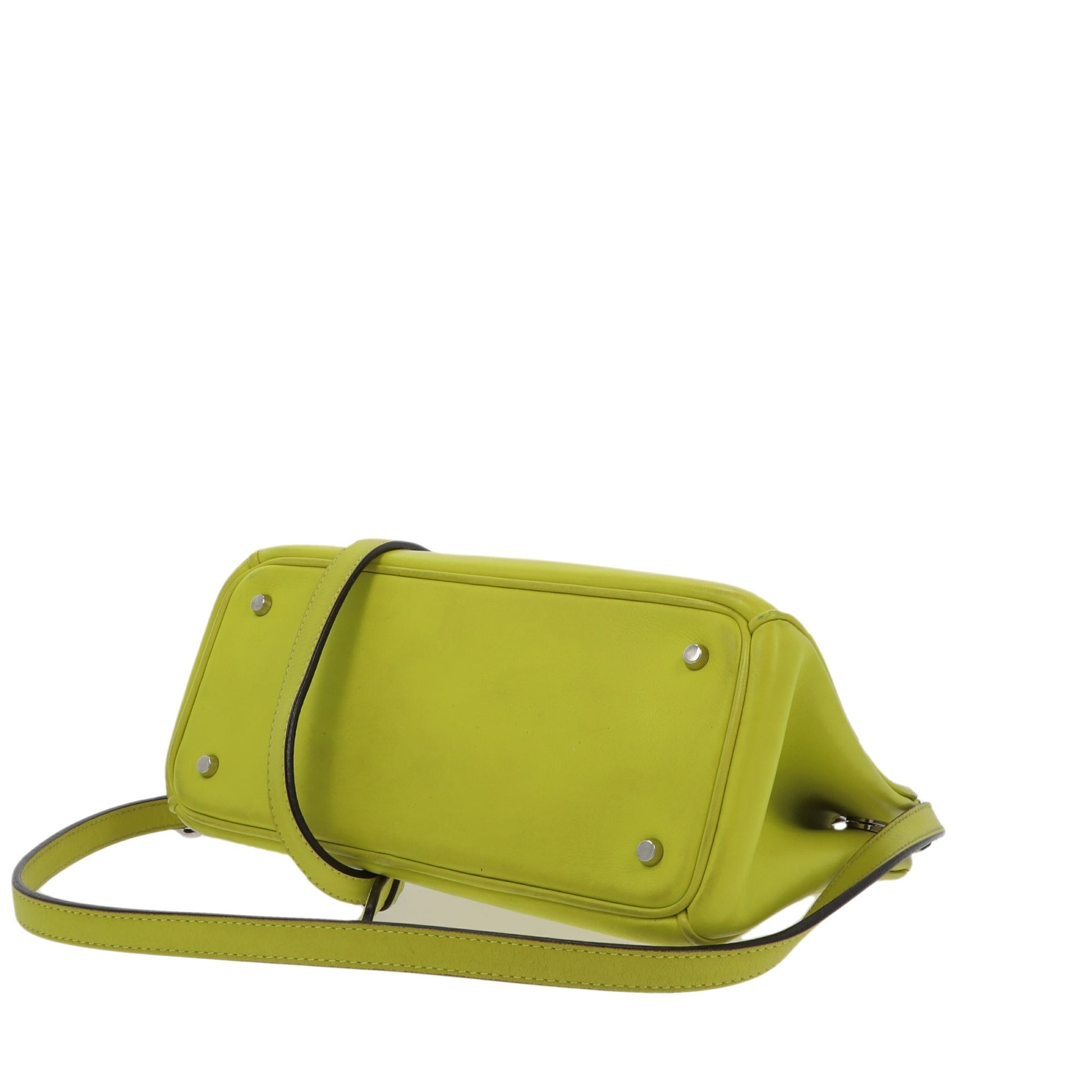 This stylish handbag is beautifully crafted of leather in Green, with blue leather interior and silver hardware
