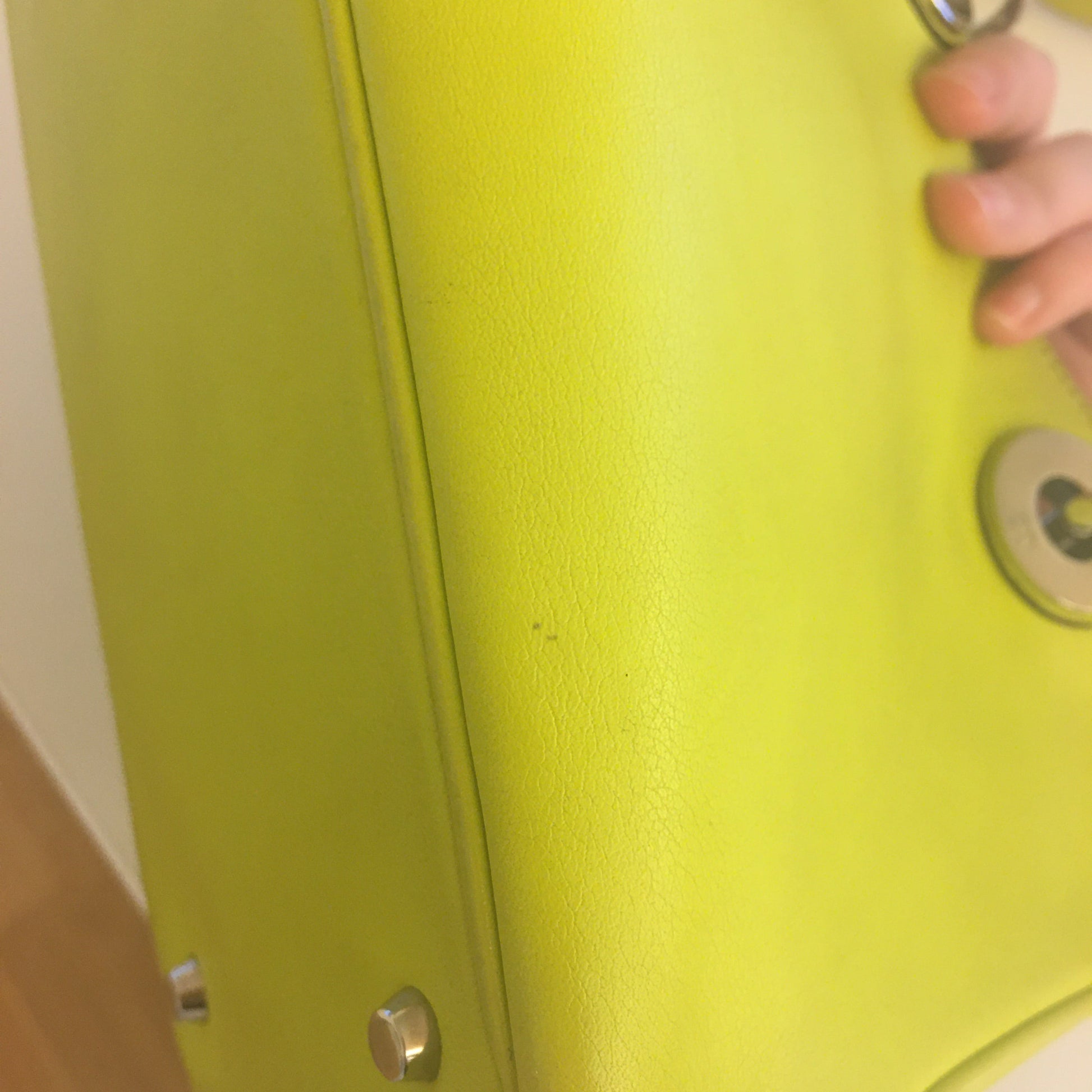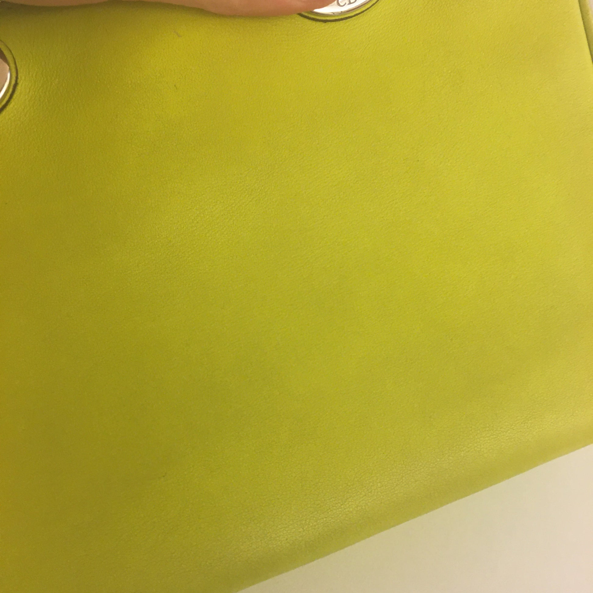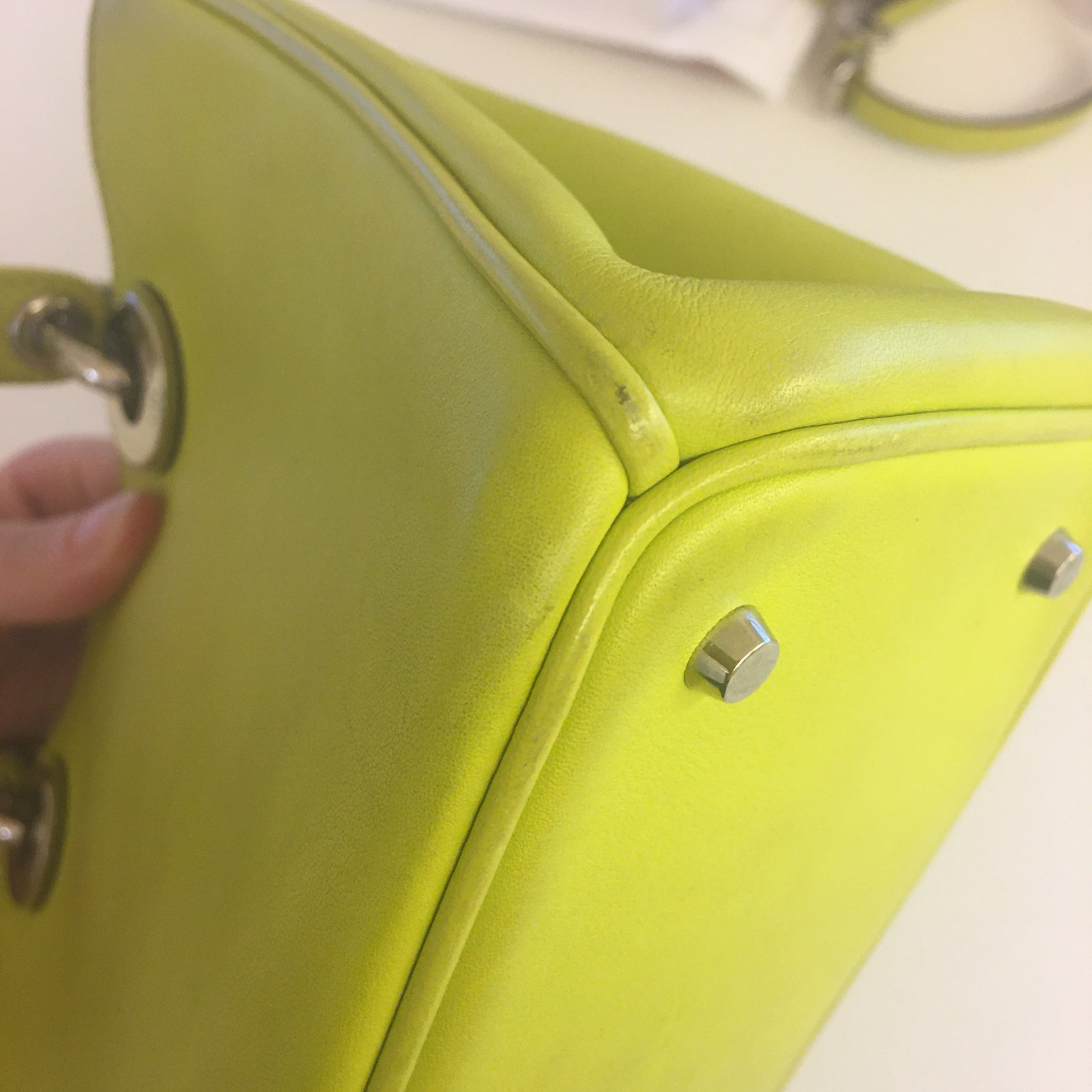 The leather has a vibrant and beautiful color, the bag is overall in good conditions with little signs of use on the corners and some color transfer on the bag and the handles, which has been ca by the close contact with the clothes and can be cleaned.