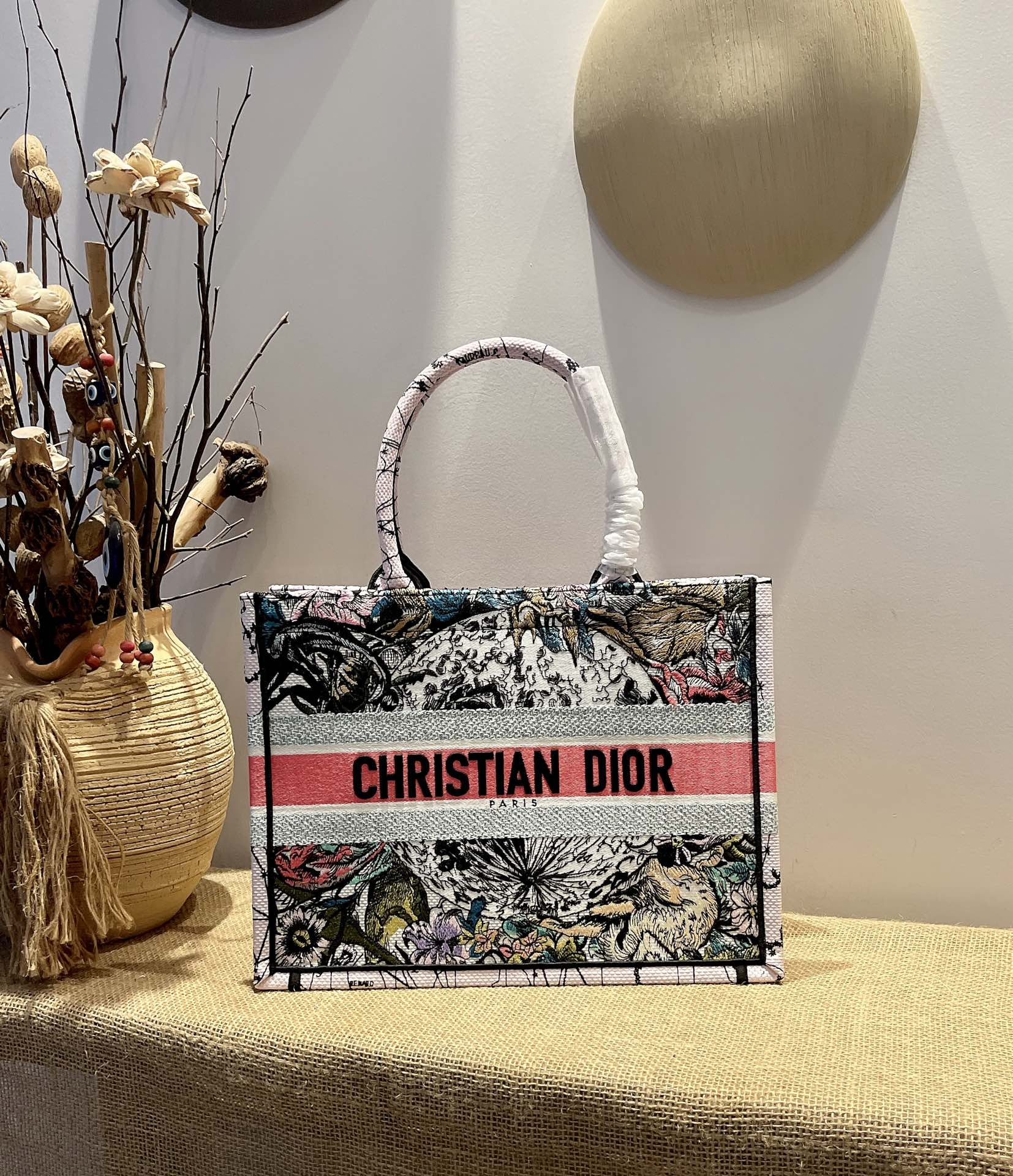 The Dior Book Tote is an original creation introduced by Maria Grazia Chiuri, Dior's Creative Director, and has become a staple of the Dior aesthetic. The style is fully embroidered with the multicolor Dior Constellation motif, imagined by artist Pietro Ruffo as a tribute to Mr. Dior's fascination with the divinatory arts. Adorned with the 'CHRISTIAN DIOR' signature on the front, the small tote exemplifies the House's signature savoir-faire and may be carried by hand or over the shoulder.