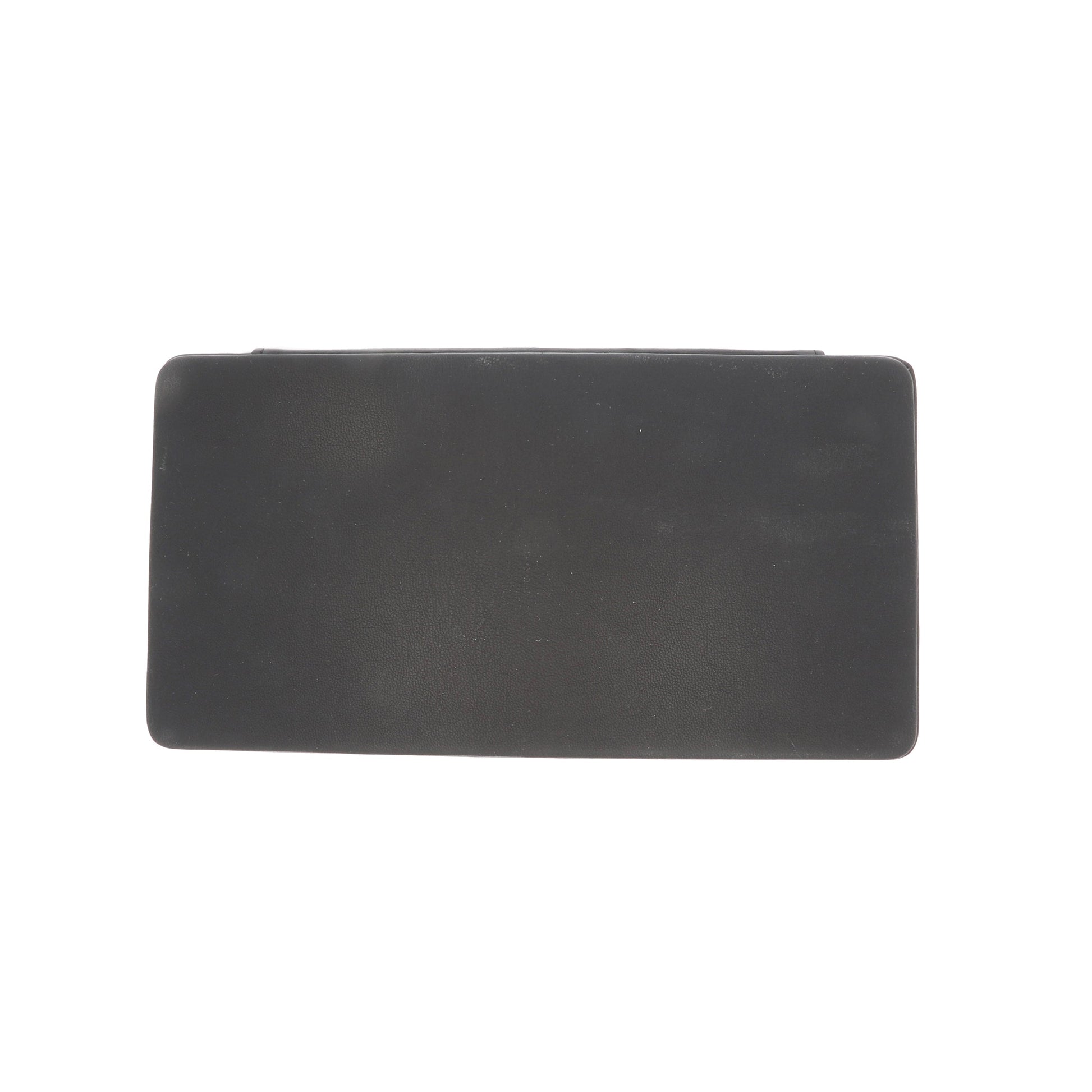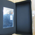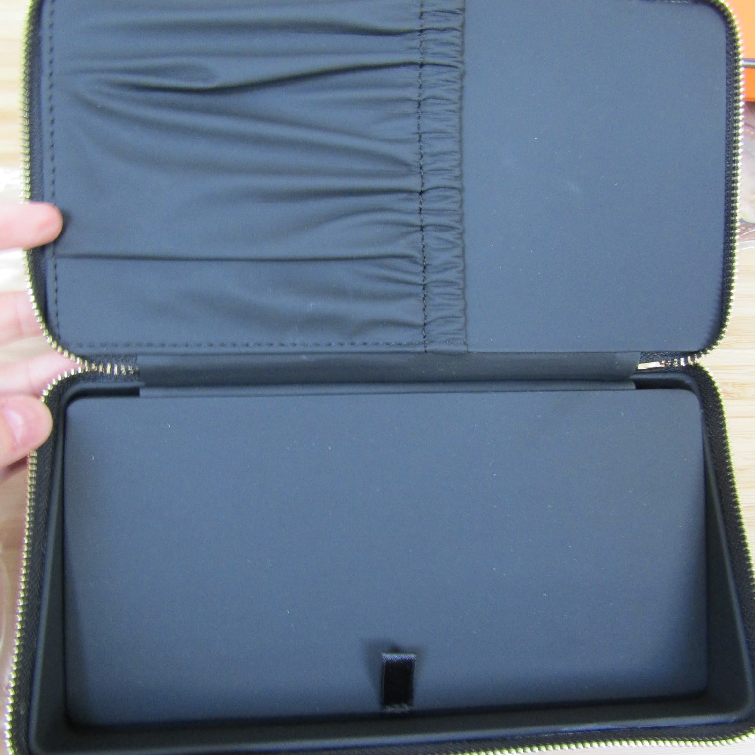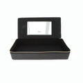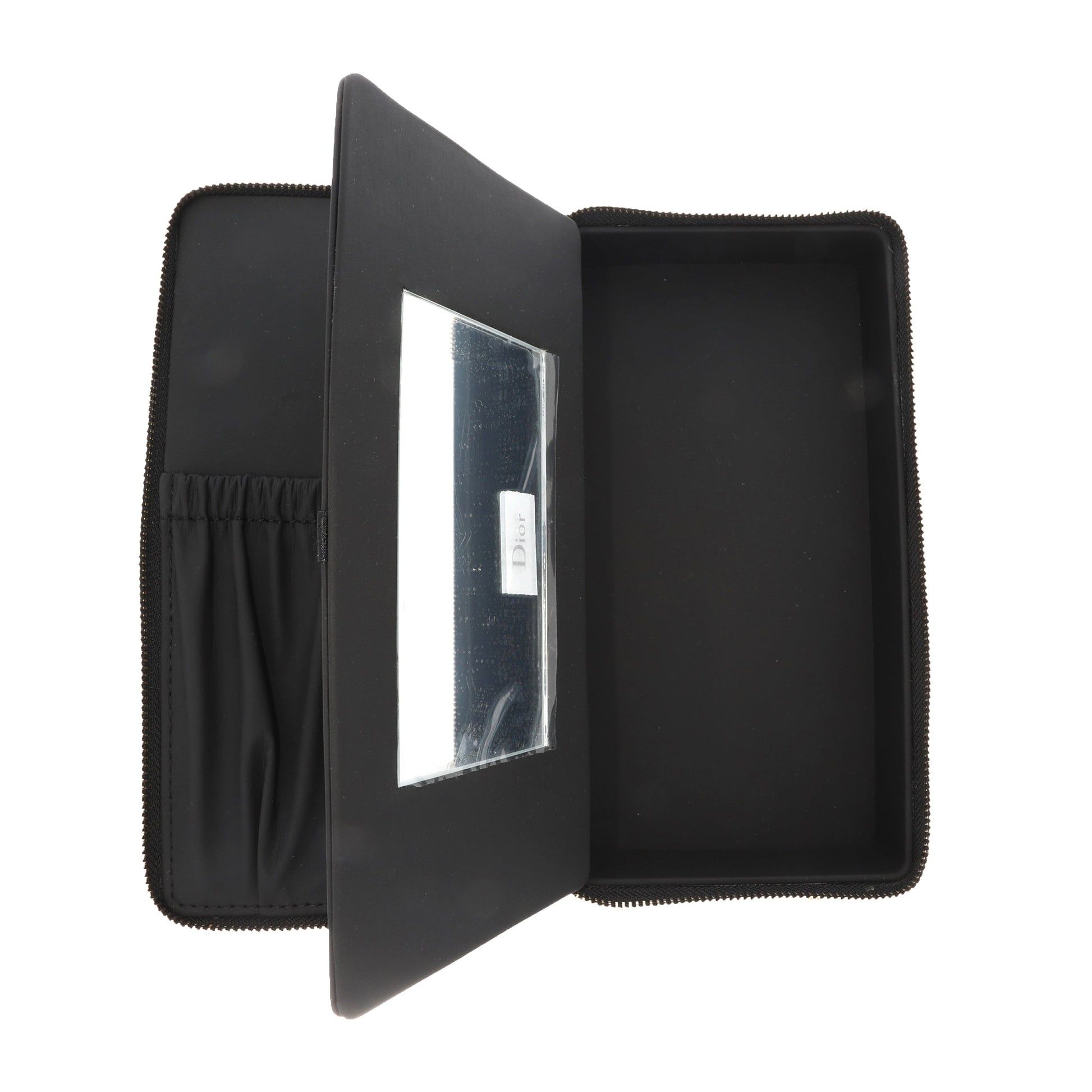 In black leather with silver color studs Two compartments, one with a mirror and one with an elastic