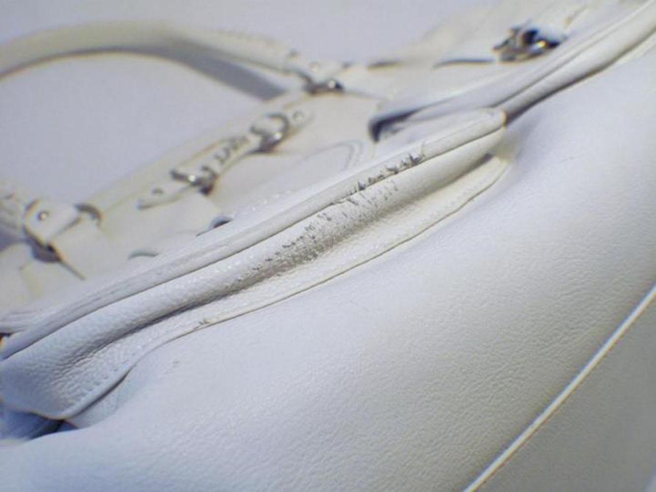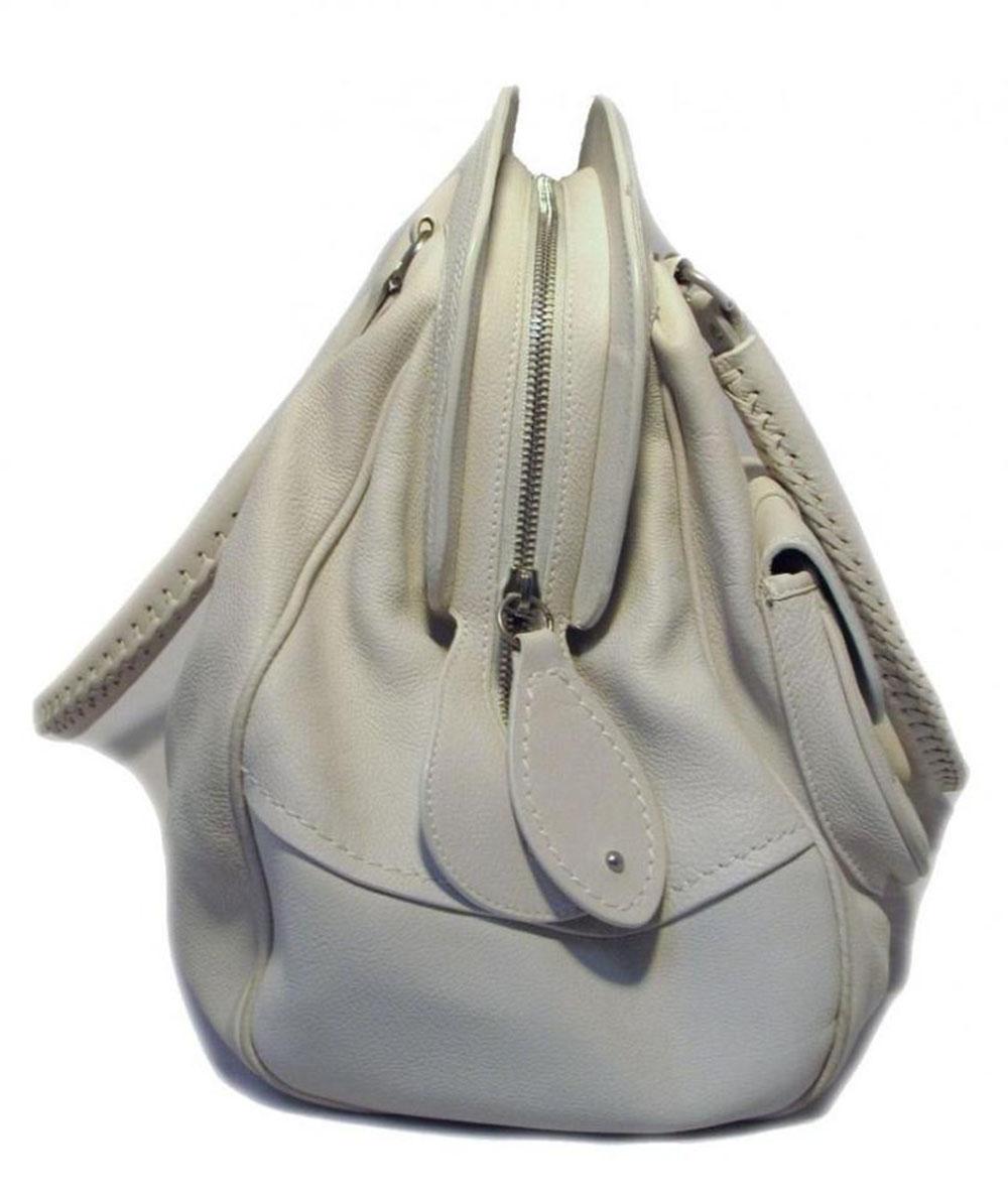 The exterior features beautiful bone white leather trimmed with matte silver hardware.