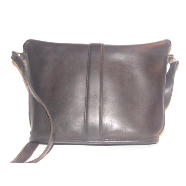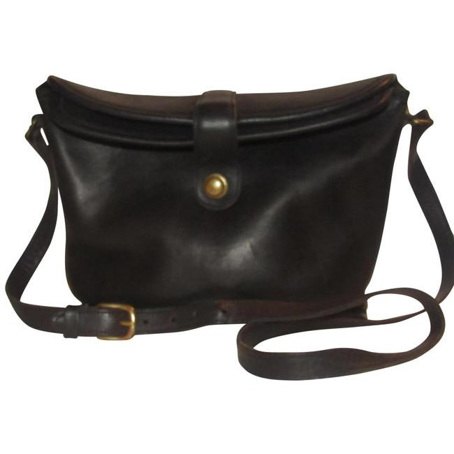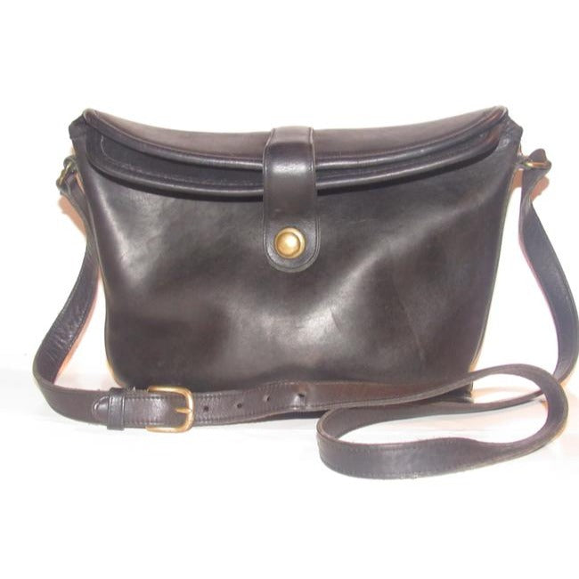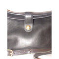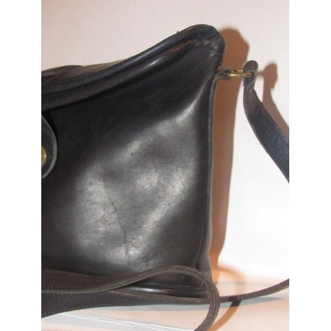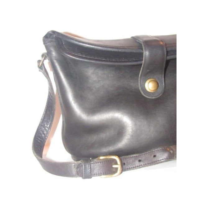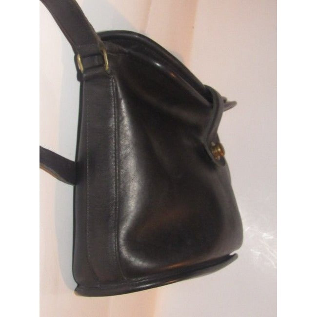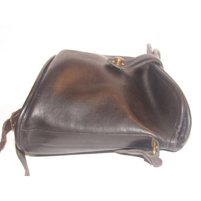 The bag is a vintage, large, fold-over top, bucket shaped, satchel style, shoulder bag by Coach that is lightly used from the 'Legacy' line! It is made of a buttery soft black leather with brass accents. There is a brass snap closure at the fold-over top and it has a long adjustable strap.