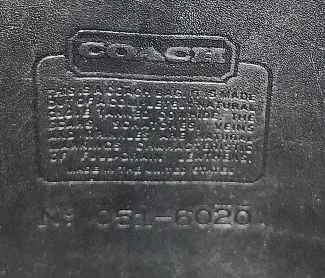 The interior is lined with black suede. The interior is very clean and has the Coach Creed tag on the back. The purse was made in the USA and has the No. 051- 6020. The purse is really roomy with an interior zip pocket. It has a classic look in basic black that will never go out of style.